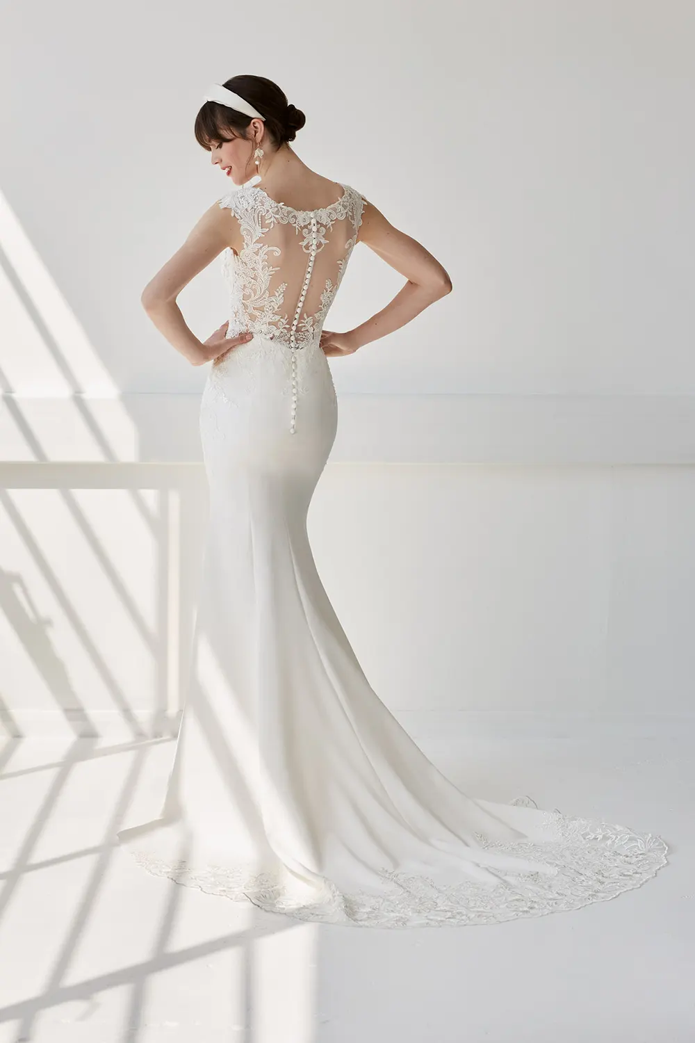 Das Brautkleid Lottie von Ellis Bridals besitzt ein aufregendes Top aus Spitze. Der symmetrische Mix aus floralem und barockem Muster formt breite Träger und rahmt wunderschön die transparente Rückenpartie. Pailletten verzieren die Spitze zusätzlich. Eine lange Knopfleiste begleitet den Übergang vom Oberteil in den Rock. Dieser ist aus geschmeidigem Crêpe gefertigt und weitet sich sanft auf dem Weg zum Boden. Die Schleppe schließt mit dem gleichen Spitzenmuster des Oberteils ab.