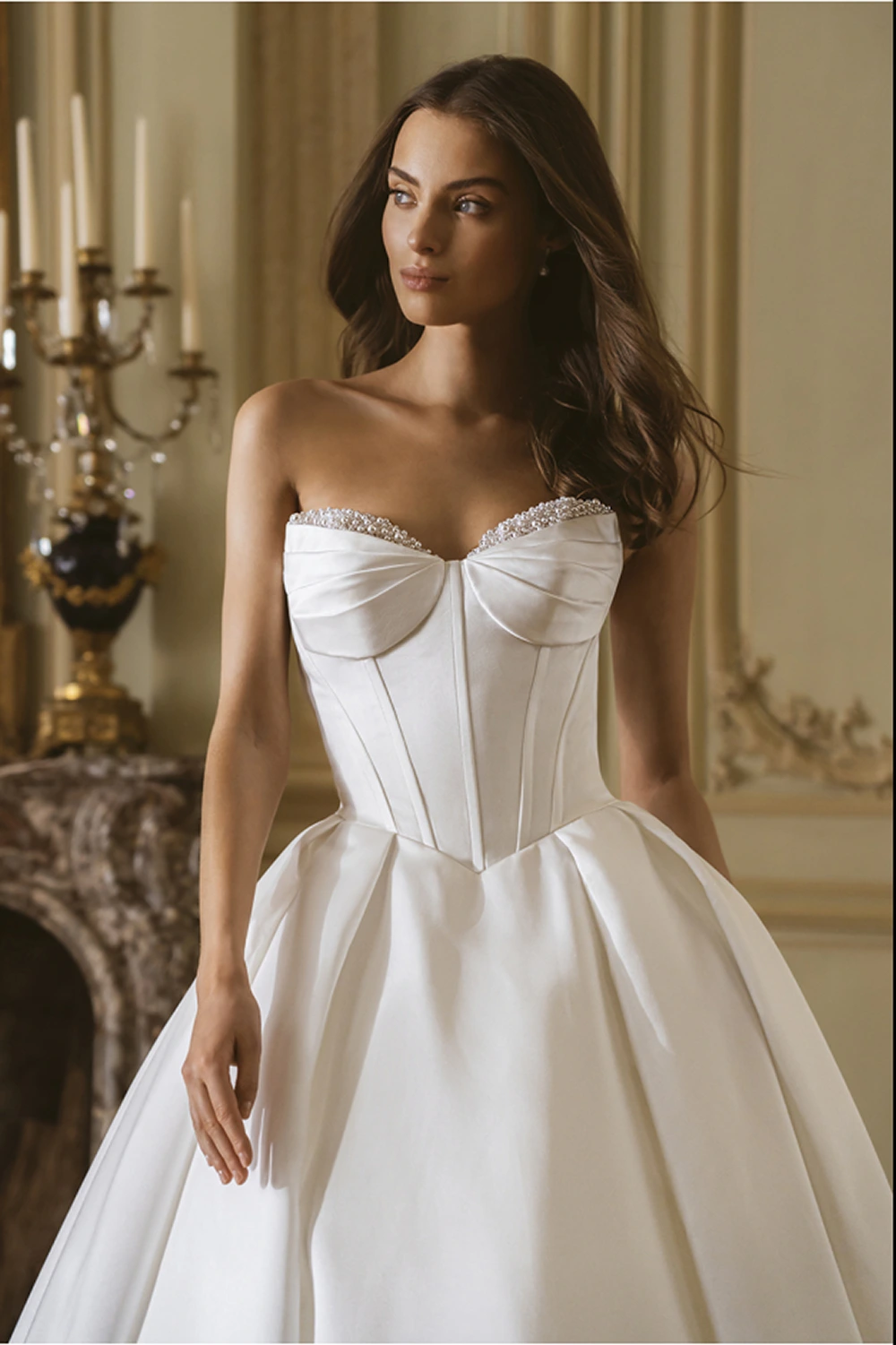 Das Modell Gillian von Elysee ist ein glamouröses Prinzessinnen Brautkleid im cleanen Look, welches mit einer Corsage und dem mit Perlen besetzten Ausschnitt besticht. Der aufregende Rücken ist lediglich durch die Corsagenstäbe bedeckt.