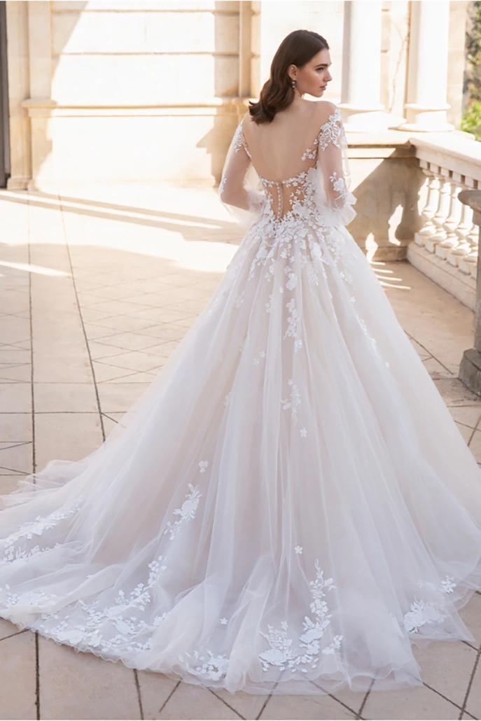 - Ausgestellter Tüllrock mit breiter Kapellenschleppe