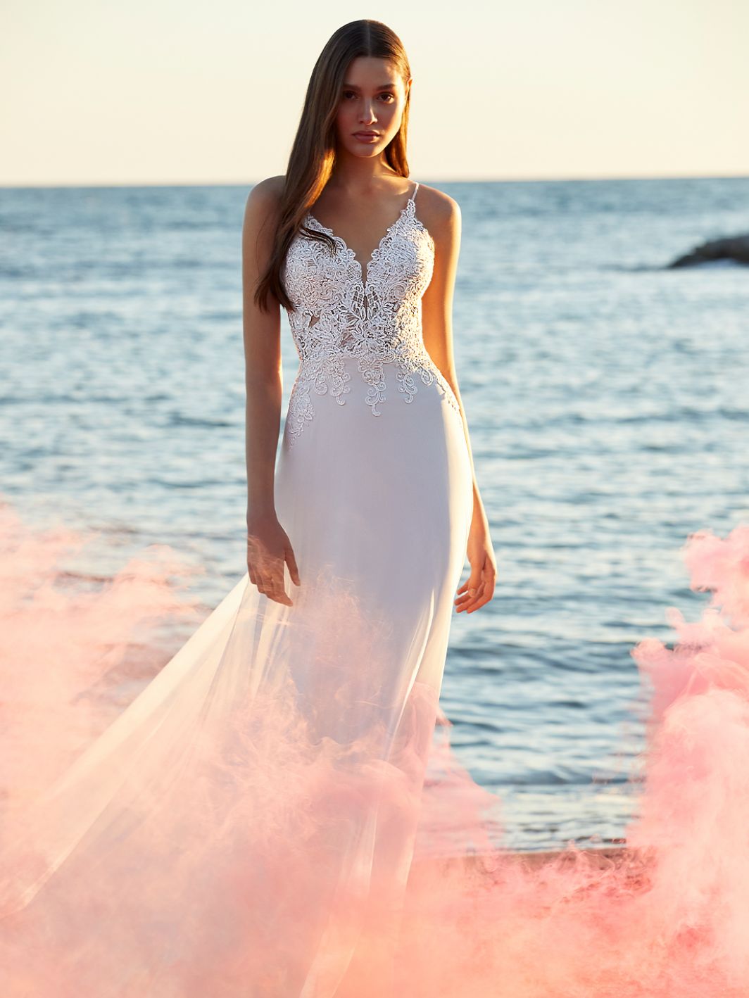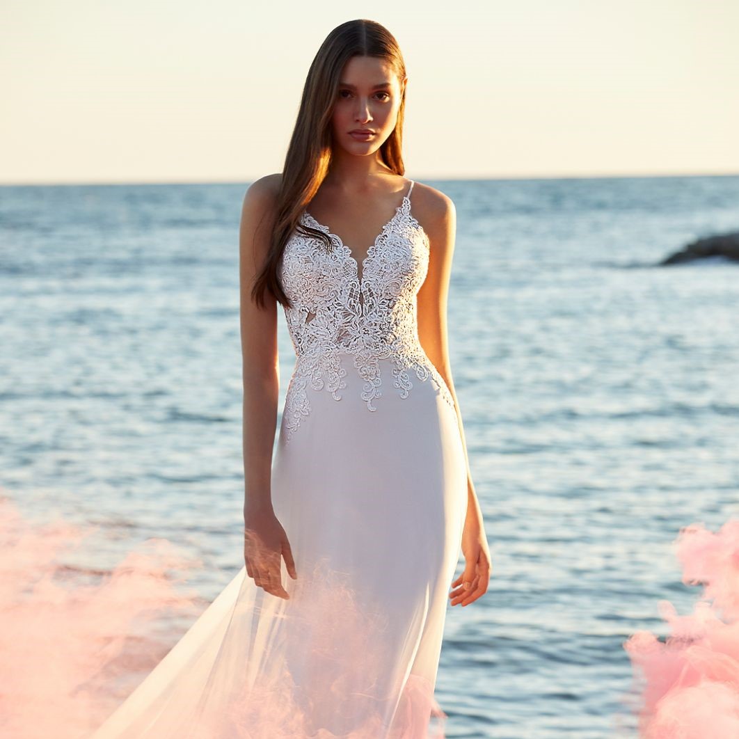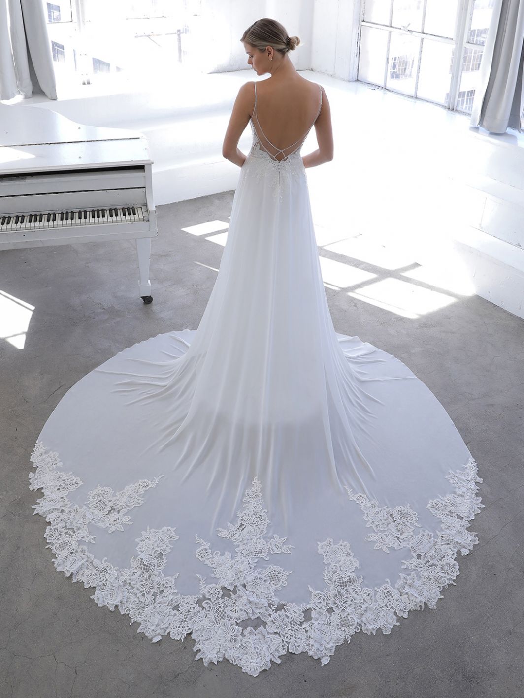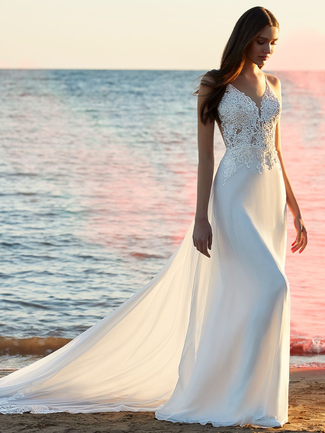 Dein Traum aus Chiffon? Novella verleiht Deinem großen Moment die gewünschte Leichtigkeit. Die feine paillettenbestickte Spitze formt das Oberteil, an das sich ein luftiger Chiffonrock mit Spitzenraum an der Rückseite anschließt.
