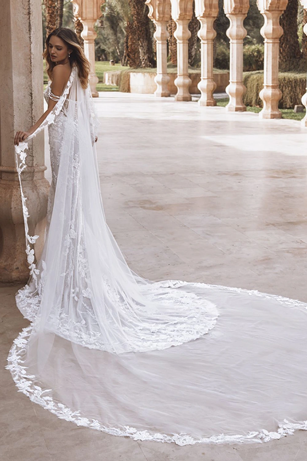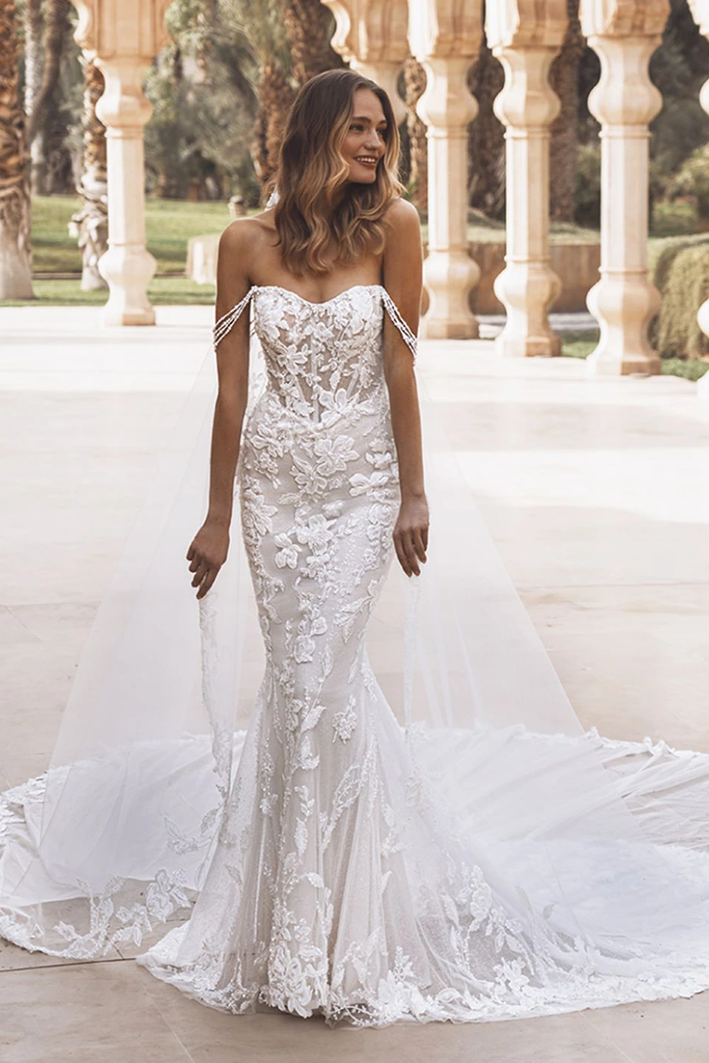 Das Modell Violet von Enzoani ist ein Kleid mit moderner Fit & Flare-Silhouette, es verzaubert mit üppigen Perlenverzierungen und zarten Perlenketten am herzförmigen Ausschnitt .