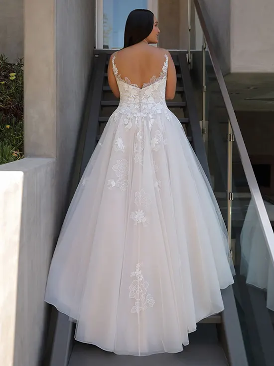 Enzoanis Fleur ist ein klassisches Curvy-Brautkleid mit romantischen Gestaltungselementen. Semitransparente, florale Spitze verläuft symmetrisch entlang des tiefen Ausschnitts, formt die zarten Träger und bedeckt das gesamte Oberteil. Anschließend läuft es im elfenbeinfarbig gefütterten Tüllrock aus und ziert diesen in einzelnen Partien. Glitzernde Perlen betonen die Blütenranken zusätzlich. Eine Knopfleiste verläuft vom Rückenausschnitt zum Rockansatz. Der Tüll formt abschließend eine abgerundete Schleppe.