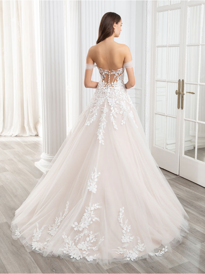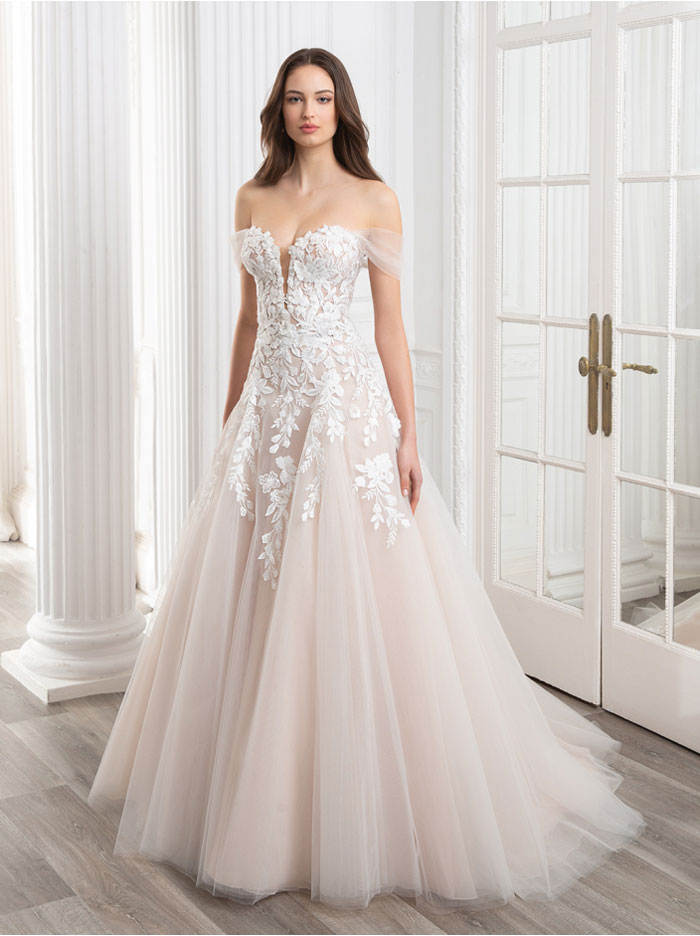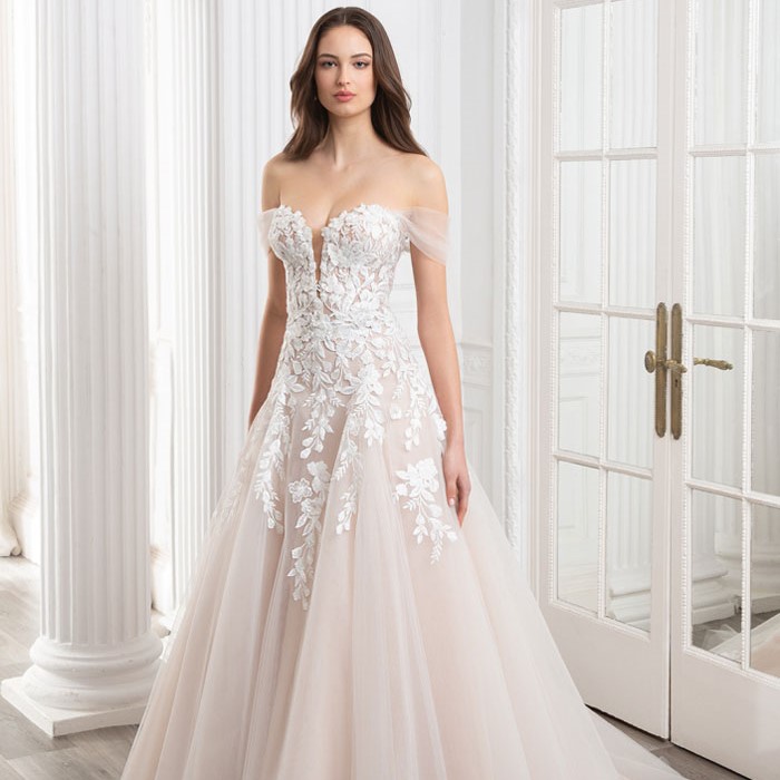 Mit Nathalie präsentiert Enzoani ein klassisches Brautkleid voller romantischer Spitze. Das florale Muster bedeckt das transparente Mieder, den Übergang zum Rock sowie die Schleppe. Am Oberteil zieren zudem dezente Pailletten die Spitze. Seitliche Tüll-Träger im Carmen-Stil ergänzen vorne den tiefen Herzausschnitt und verlängern die Linie des geraden Rückenausschnitts optisch. Der zart nudefarben gefütterte Tüllrock erhält sein Volumen durch mehrere Lagen Stoff und eine schöne Faltenlegung.