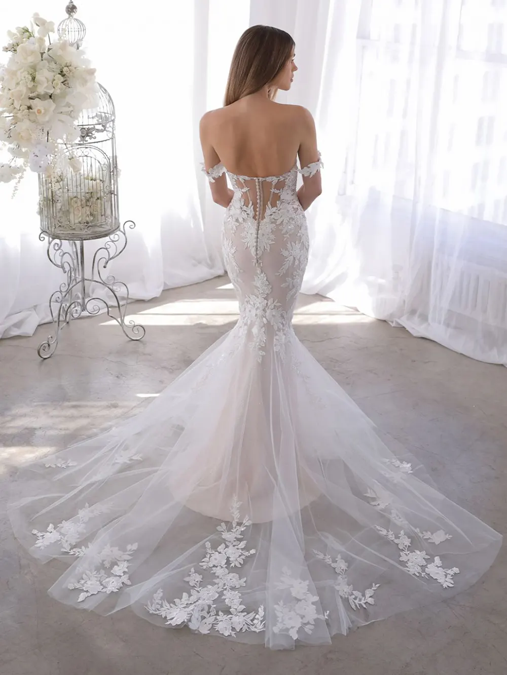Das Brautkleid Olenka von Enzoani ist perfekt für Bräute, die ihre Konturen betonen möchten. Das schmale Mieder ist transparent, aber vor allem an der Vorderseite mit opulenter, symmetrischer Blütenspitze bestickt. Perlen und Pailletten verzieren das Muster zusätzlich. Seitliche Träger im Carmen-Stil fügen dem Look ein Boho-Element hinzu. Ein weiteres Highlight ist die Rückansicht mit tiefem Ausschnitt und langer Knopfleiste. Ab der Taille ist das Modell nudefarben gefüttert und mit Glitzertüll bedeckt. Dieser geht schließlich in einen Rock aus weichem Tüll über, der eine besonders zart drapierte Schleppe bildet. Hier findet sich auch das Spitzenmuster des Oberteils wieder.