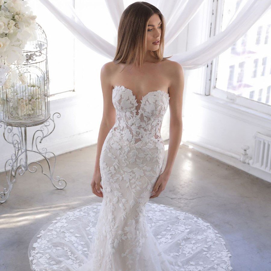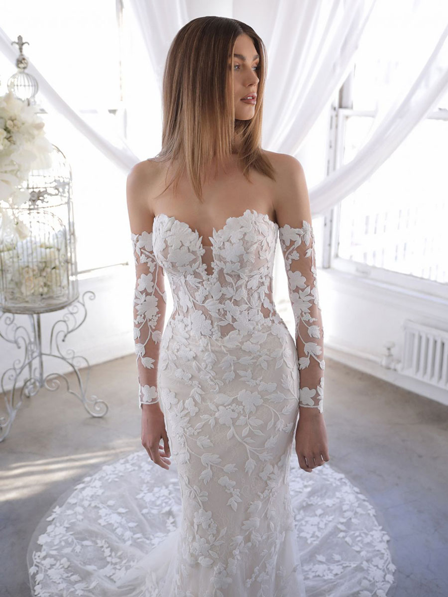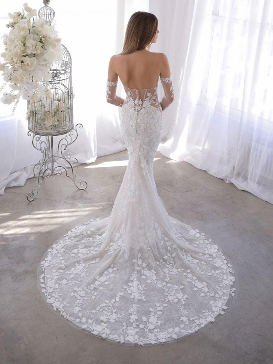 Das Brautkleid Orrie von Enzoani verströmt mit seiner präsenten floralen Spitze pure Romantik. Diese bedeckt das transparente Oberteil, die separaten, schulterfreien Ärmel sowie den Rock mitsamt Schleppe. Unterhalb des geraden Rückenausschnitts begleitet zudem eine Knopfleiste den Übergang in den elfenbeinfarben gefütterten Tüllrock. Die semitransparente, bestickte Schleppe bedeckt abschließend in zwei Schichten den Boden.