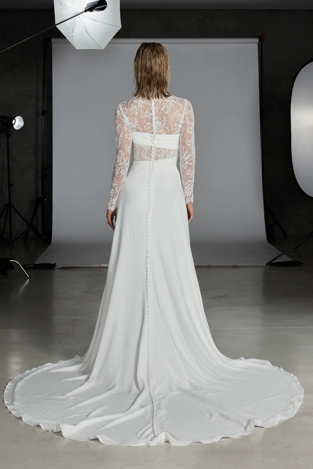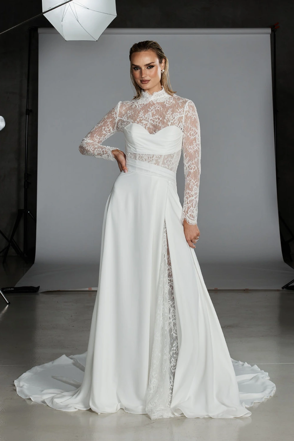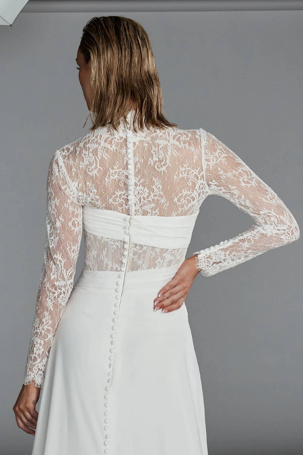 Das Modell Astaire von Evie Young ist ein schlichtes und dennoch romantisches A-Linien Brautkleid mit optionaler Spitzenjacke.
