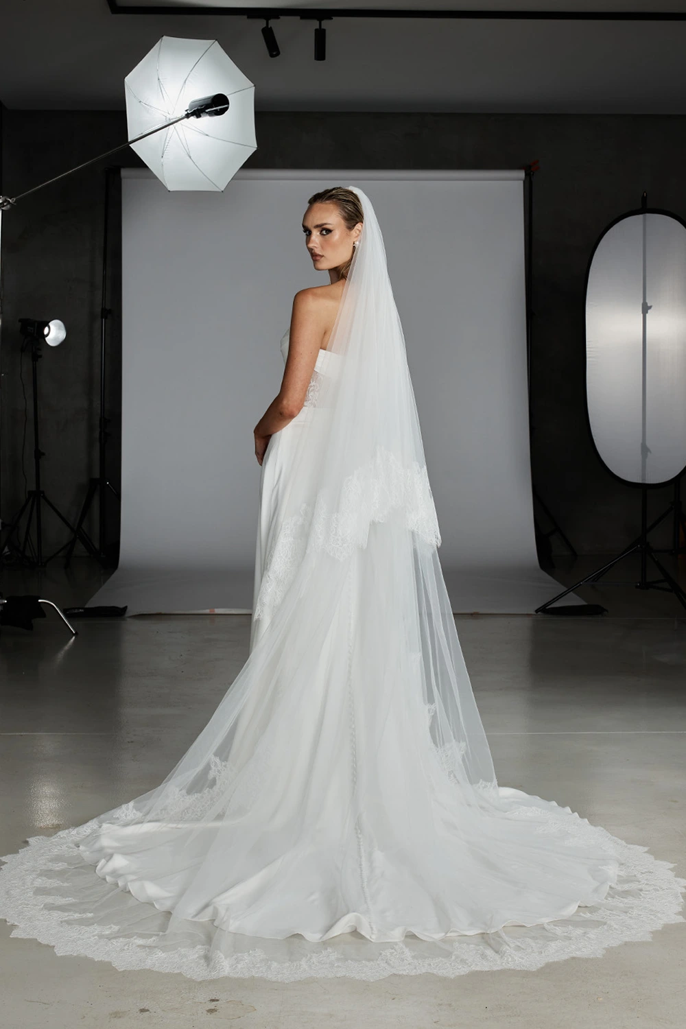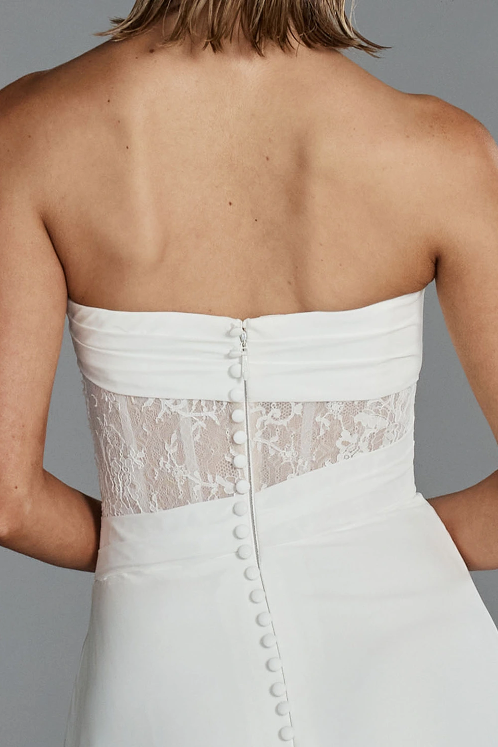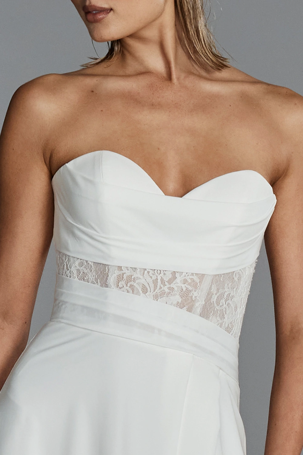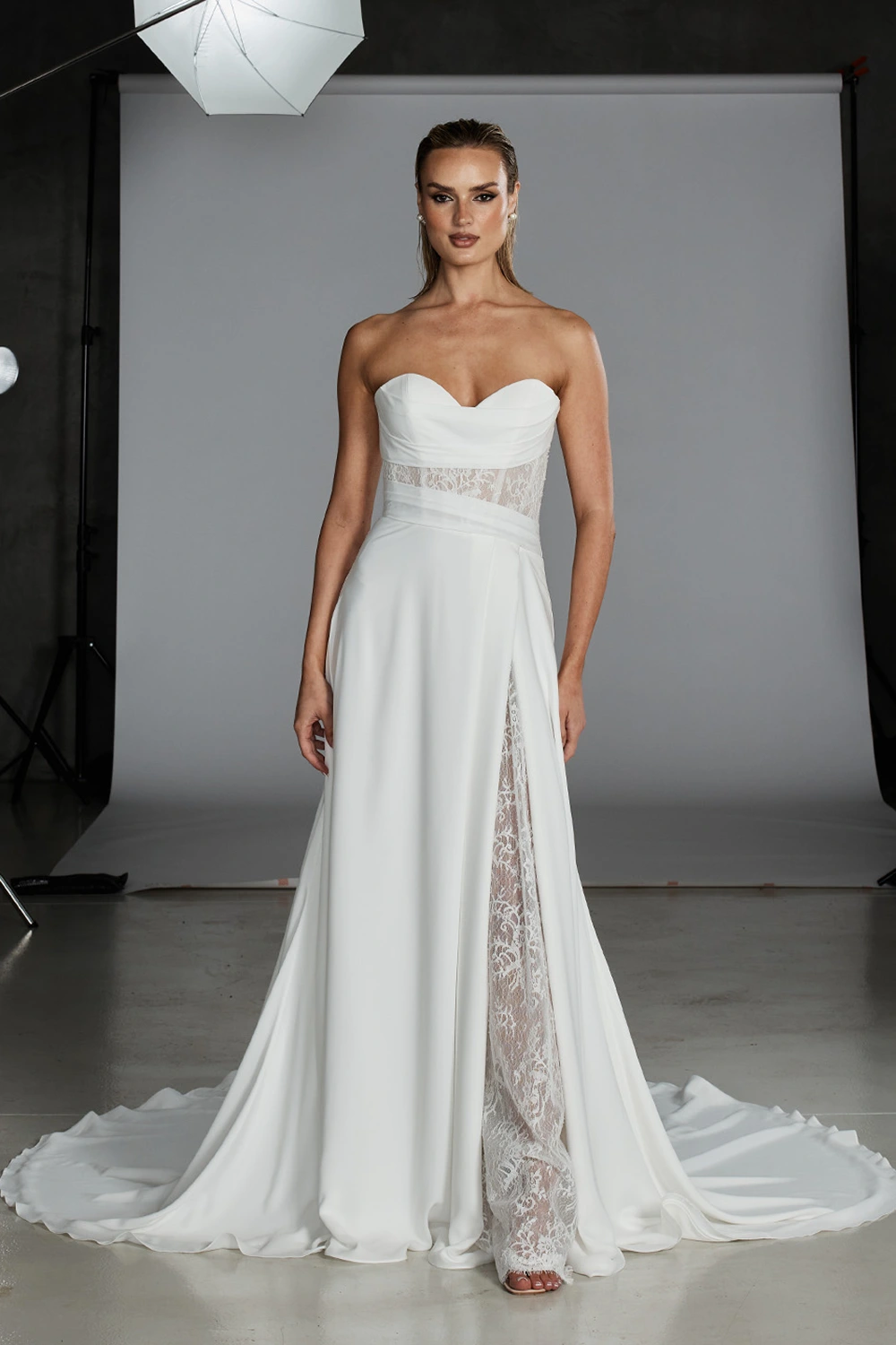 Das Modell Astaire von Evie Young ist ein schlichtes und dennoch romantisches A-Linien Brautkleid mit optionaler Spitzenjacke.