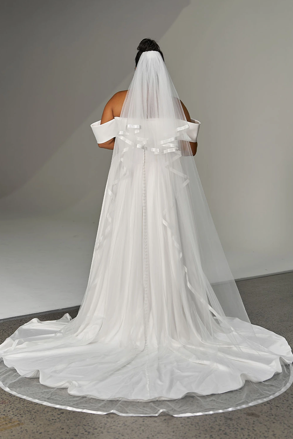 Das Modell Orson Curvy von Evie Young ist ein minimalistisches Brautkleid im A-Linien Schnitt mit Stäbchenkorsage.