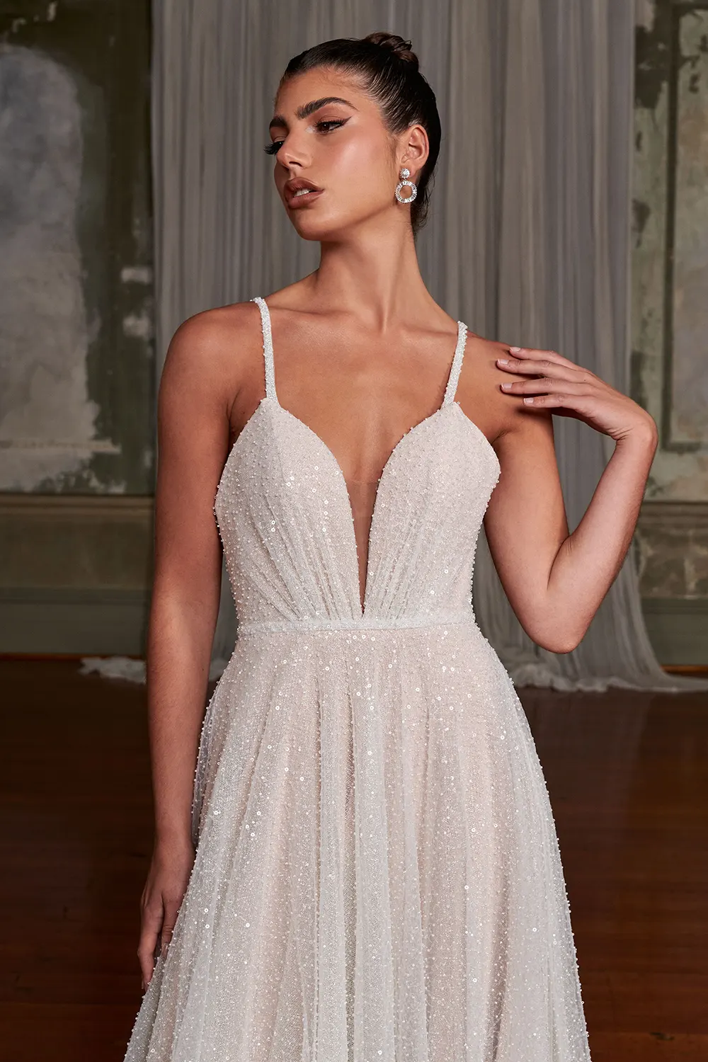 Das Brautkleid Indy von Evie Young Bridal ist ein glamouröses mit Perlen verziertes A-Linien-Brautkleid. Es schimmert im Licht durch die Pailletten- und Perlenspitze und lässt dich bei jeder Bewegung glänzen.