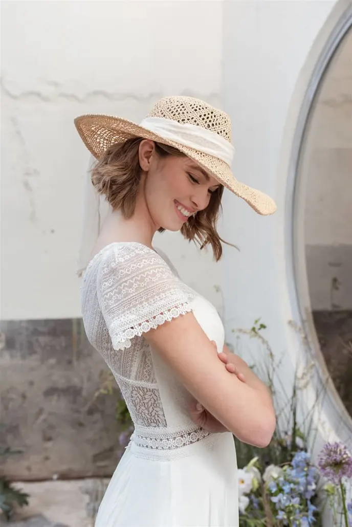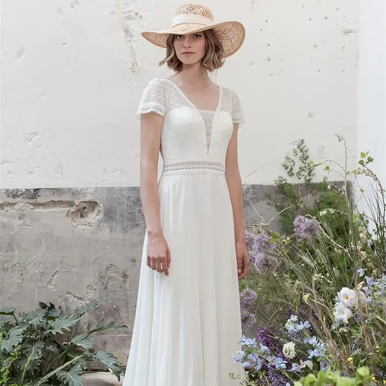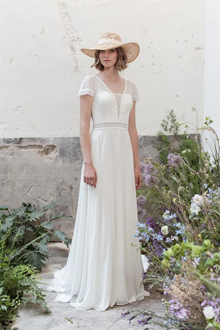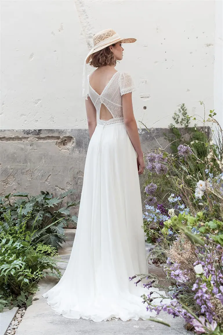 Bella von Fara Sposa ist ein fabelhaftes Vintage-Brautkleid mit unkonventioneller Linienführung. Am Oberteil wird diese durch die Kombination blickdichter und transparenter Partien betont. Hinzu kommt zarte Spitze, die die Flügelärmel mit wunderschöner Zierborte formt. Außerdem rahmt sie den durch ein geknöpftes Detail zweigeteilten Rückenausschnitt. Auf das wiederum transparente Taillenband folgt ein natürlich fließender Chiffonrock, der in einer kleinen Schleppe endet.