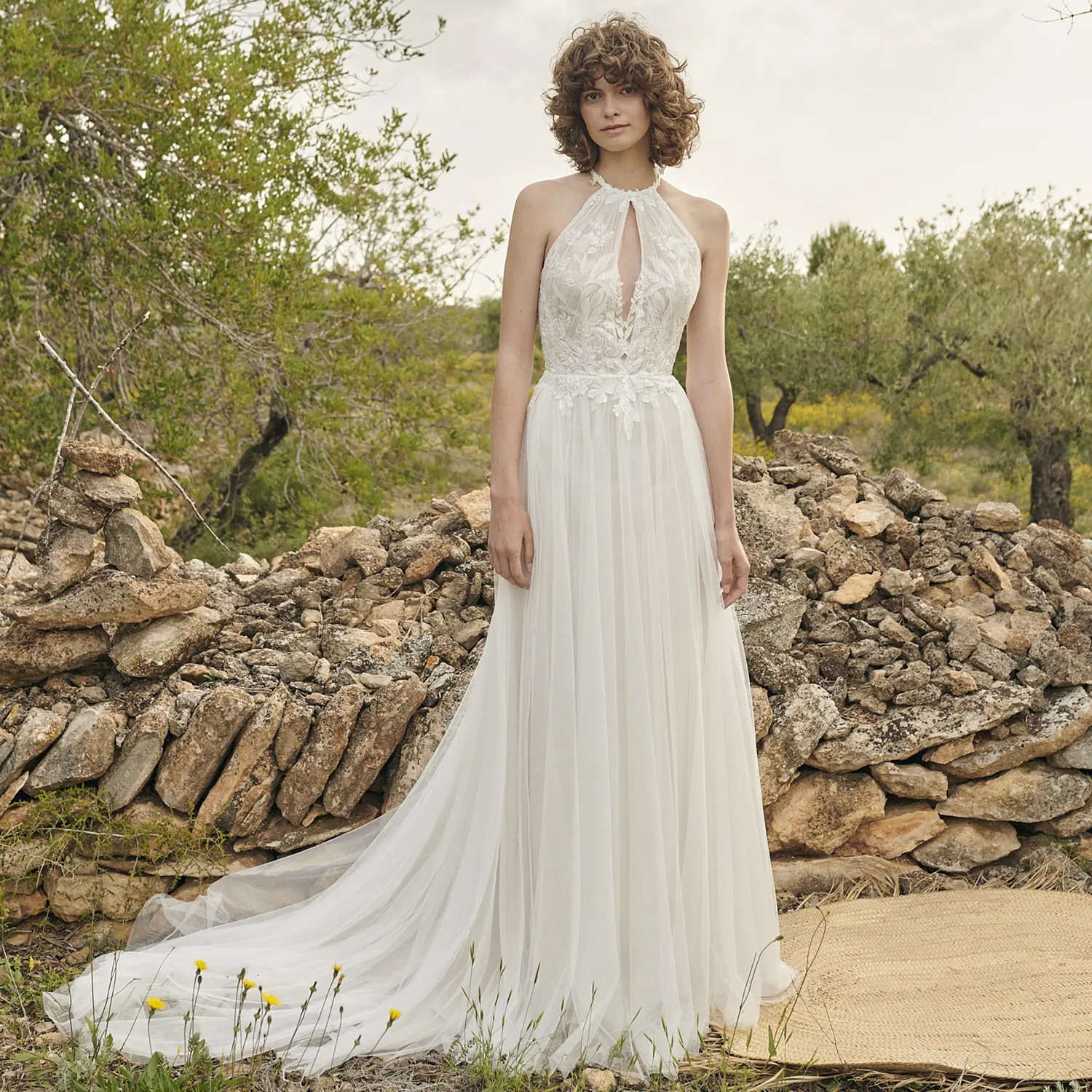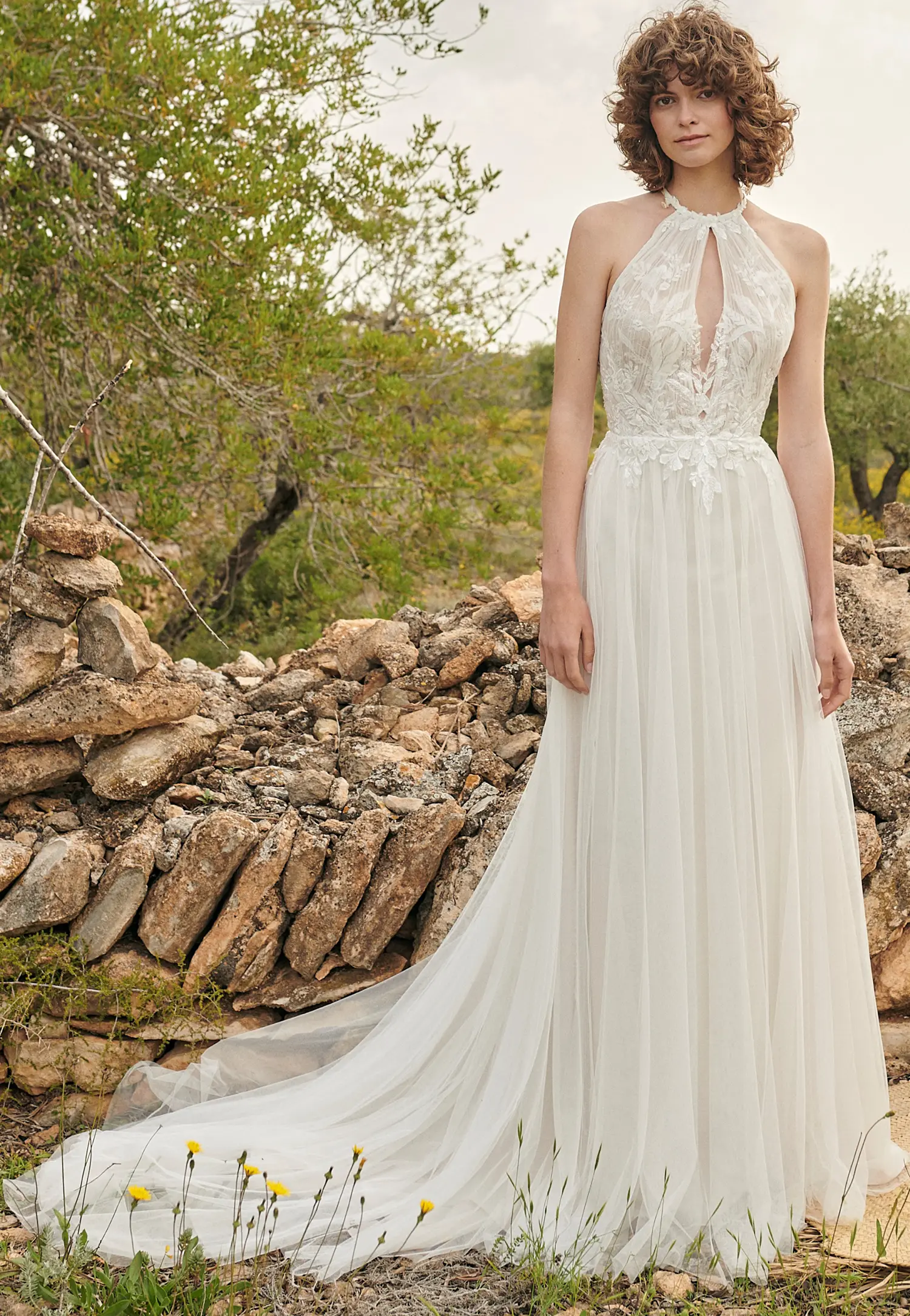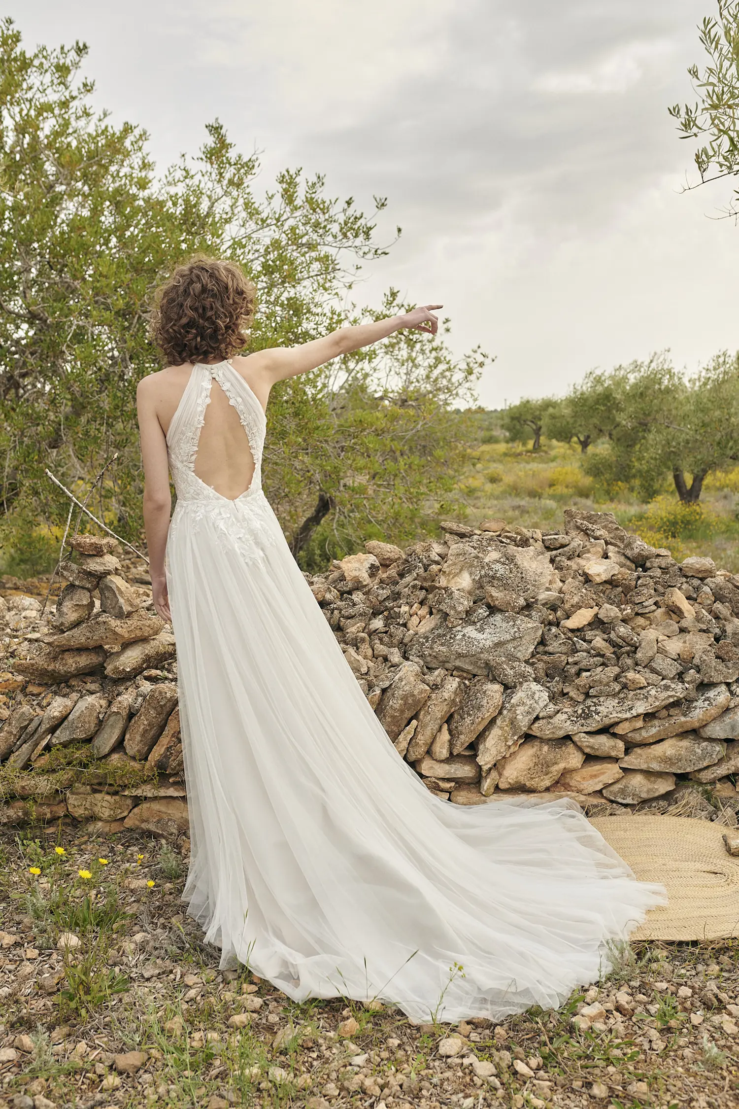 Israel von Fara Sposa ist ein Brautkleid mit besonders kunstvoll geschnittenem Oberteil. Der hochgeschlossene Kragen ist hier kombiniert mit einem tiefen Schlitz. Unter gerafftem Tüll blitzt mit dezenten Pailletten verzierte Spitze in symmetrisch-floralem Muster hervor. Der grafische Keyhole-Rückenausschnitt ist am ebenfalls hohen Kragen geknöpft. Die Spitze setzt sich bis kurz über die Taille in den Rock fort, der im Anschluss schlicht bis zum Boden fließt und mit einer ovalen Schleppe abschließt.