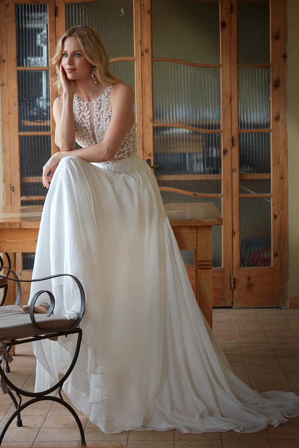 Das Modell Malasya von Fara Sposa ist ein leichtes Chiffon Brautkleid mit einem semitransparenten, hochgeschlossenen Oberteil aus Blätterspitze.