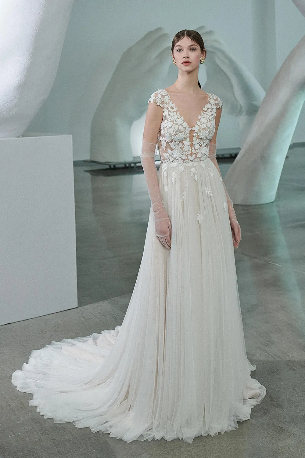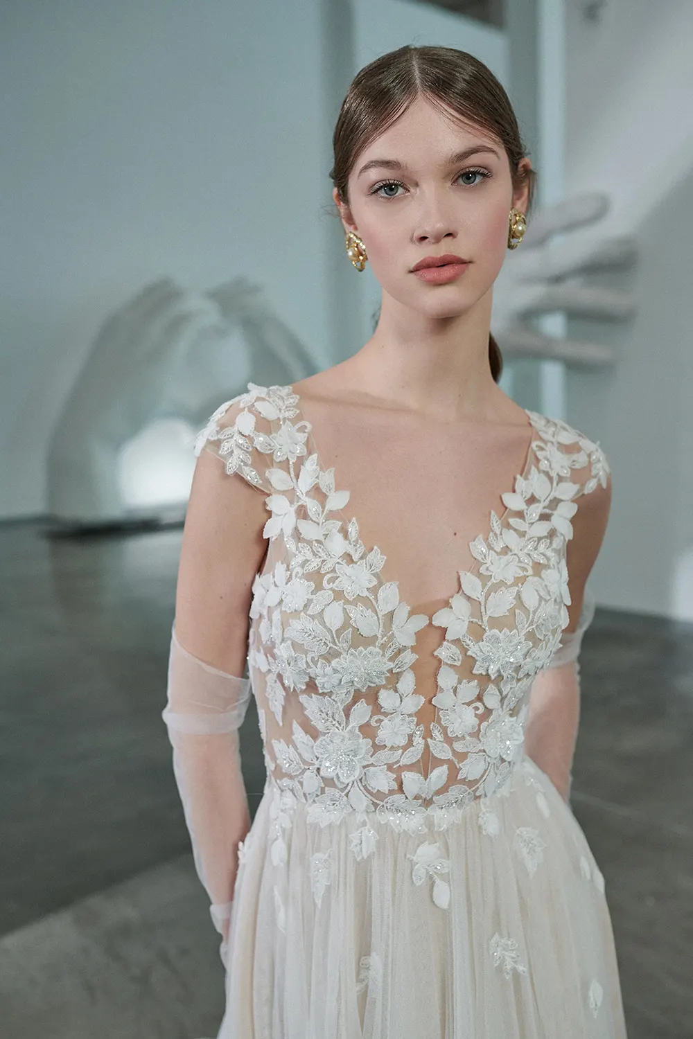 Das Brautkleid Pisa von Fara Sposa ist ein verspieltes und dennoch elegantes A-Linien Brautkleid mit Spitzenoberteil.