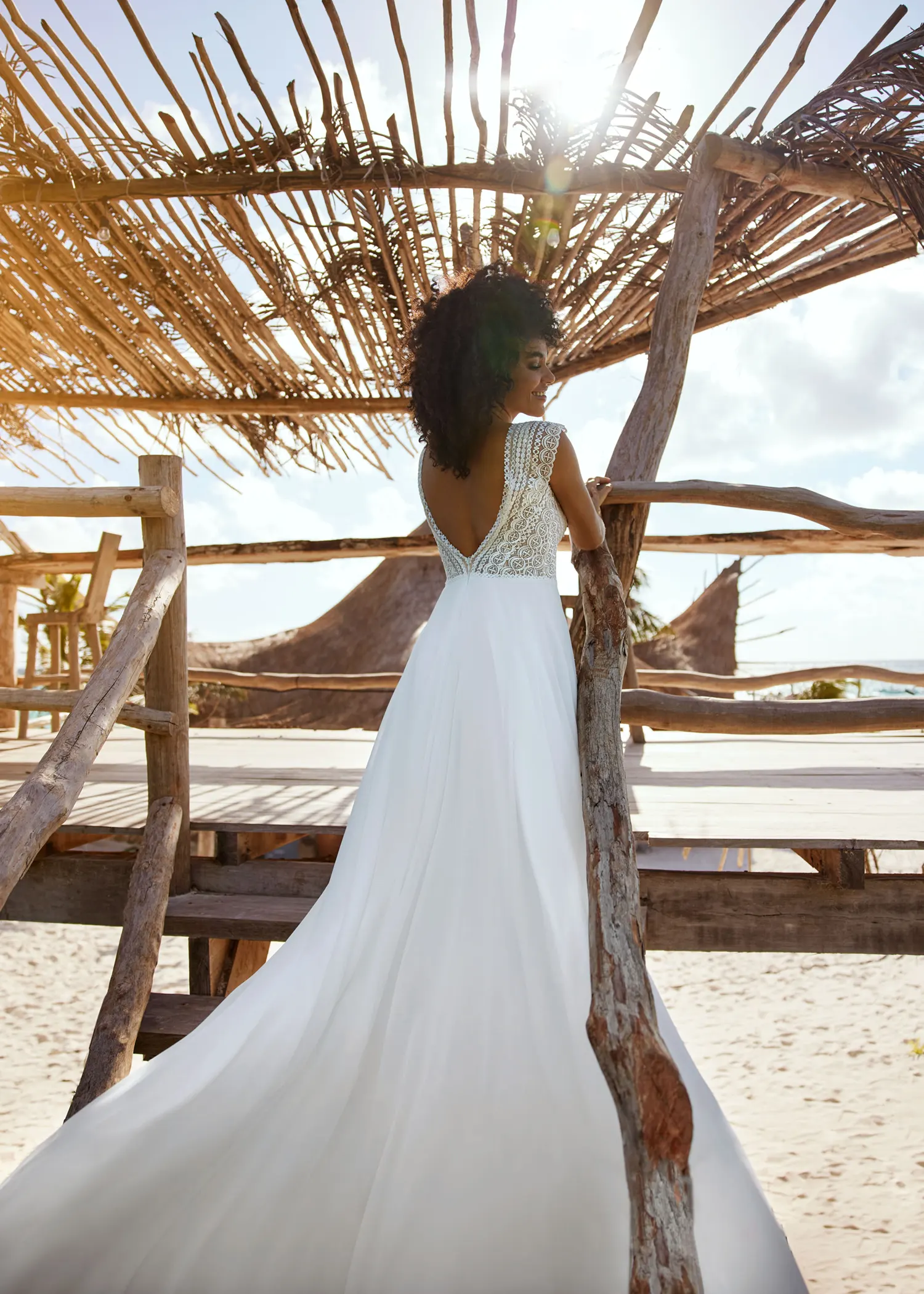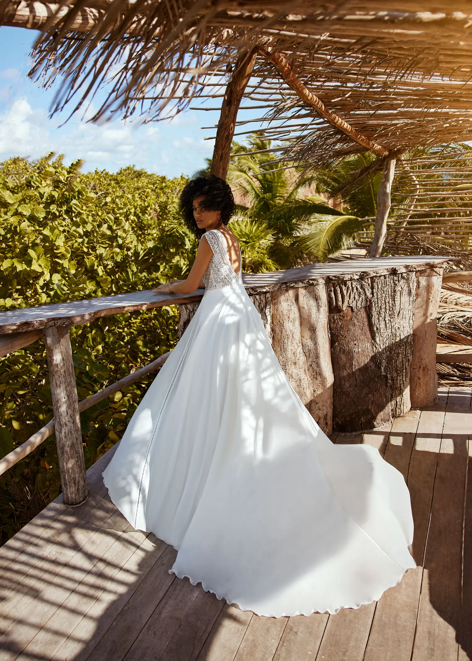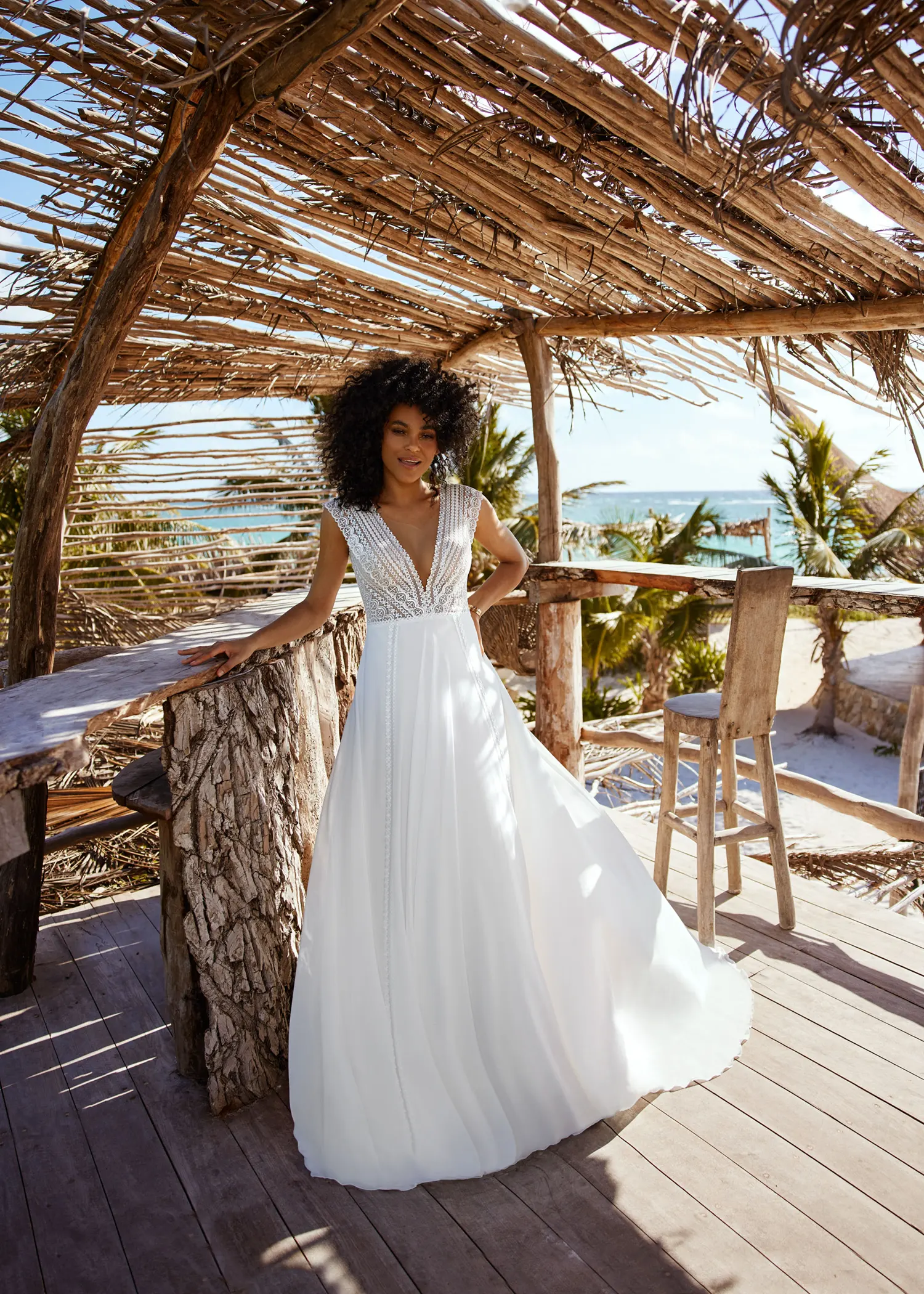 Das Brautkleid Bente von Herve Paris ist ein leichtes Boho-Brautkleid mit modernem Schnitt. Sein transparentes Oberteil ist mit grafischer Spitze bestickt und tief ausgeschnitten. Ab der Taille schwingt ein luftiger Chiffonrock im Wind. Zwei Zierborten verlaufen vertikal an der Vorderseite und bringen so ein optisches Element des Oberteils in die Rockpartie.