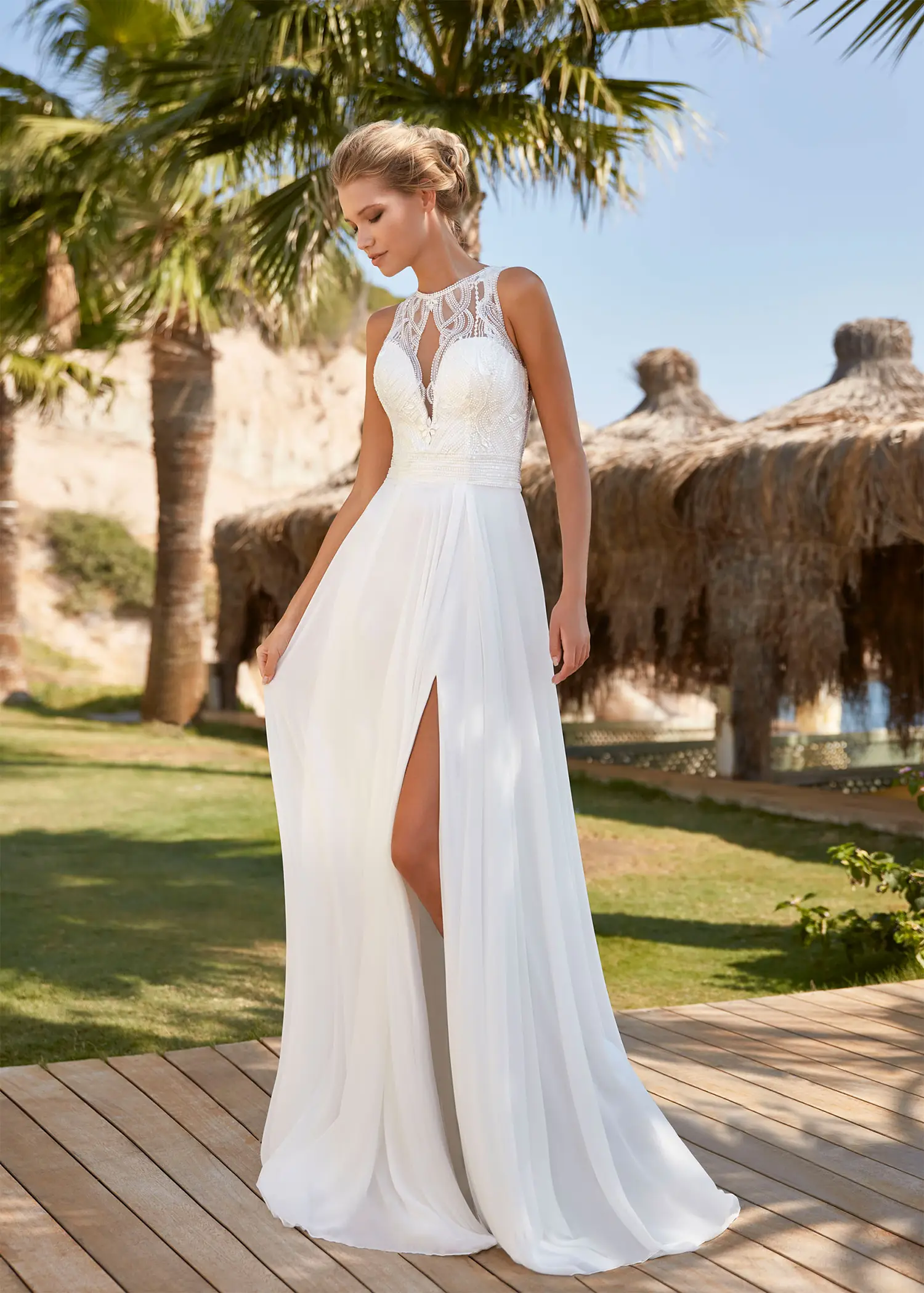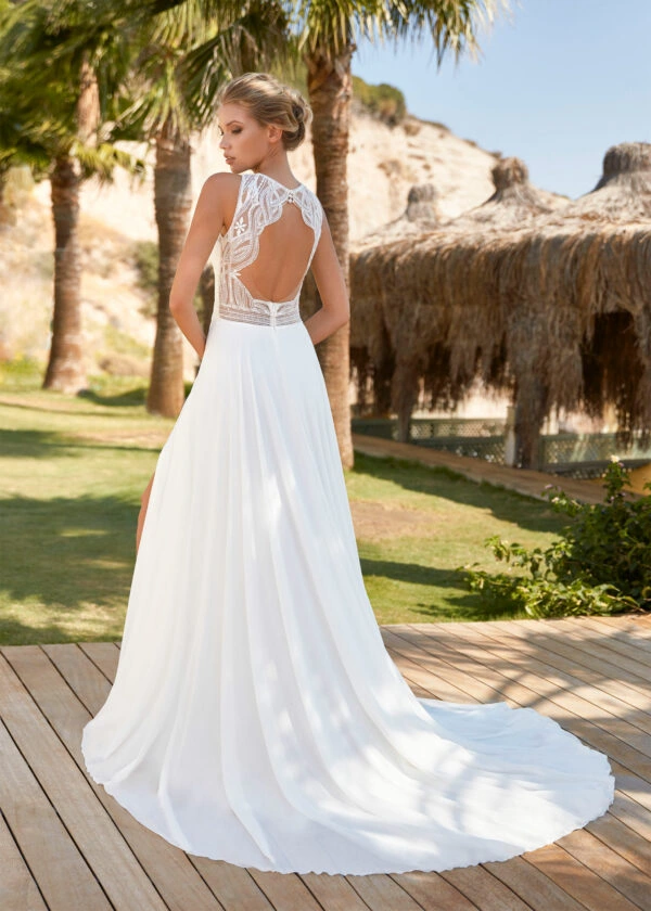 Das Brautkleid Vierzon von Herve Paris besitzt einen zeitgenössischen Boho-Look. Das Mieder mit tiefem Herzausschnitt ist von einer Lage transparenter Spitze mit modernem Muster bedeckt. An der Rückenpartie formt die Spitze einen kunstvollen, geknöpften Keyhole-Ausschnitt. Unter einem Taillenband beginnt der natürlich fallende Chiffonrock. An der Vorderseite reicht ein Schlitz bis zum Oberschenkel und schenkt in Kombination mit einer kleinen Schleppe die zum Boho-Stil passende Bewegungsfreiheit.