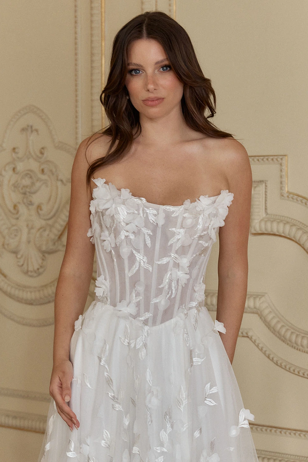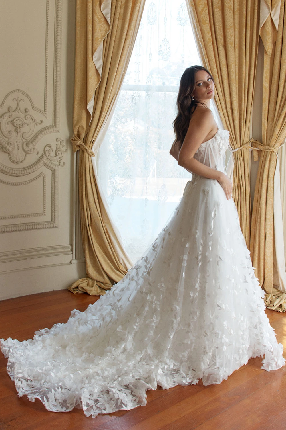 Das Modell Nissa von Jeune Bridal ist ein romantisches A-Linien Brautkleid mit filigranen 3D-Blütenblättern.