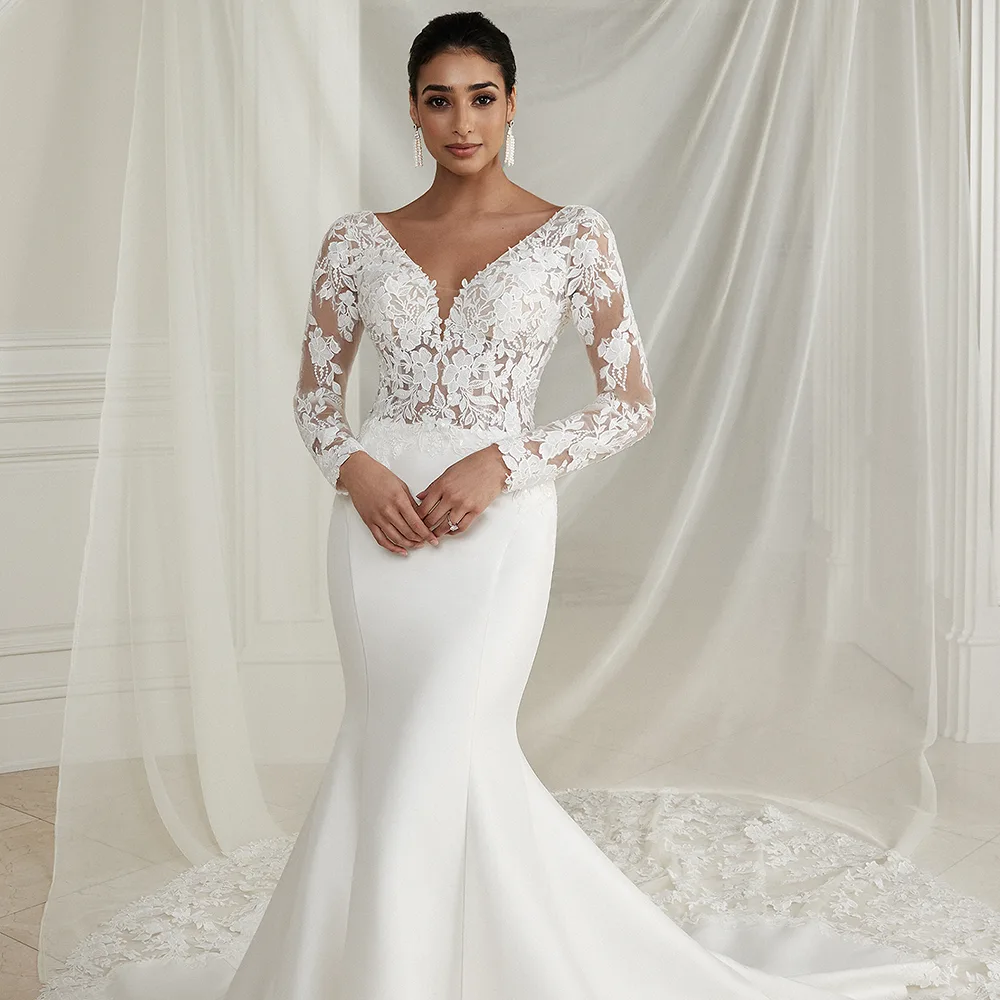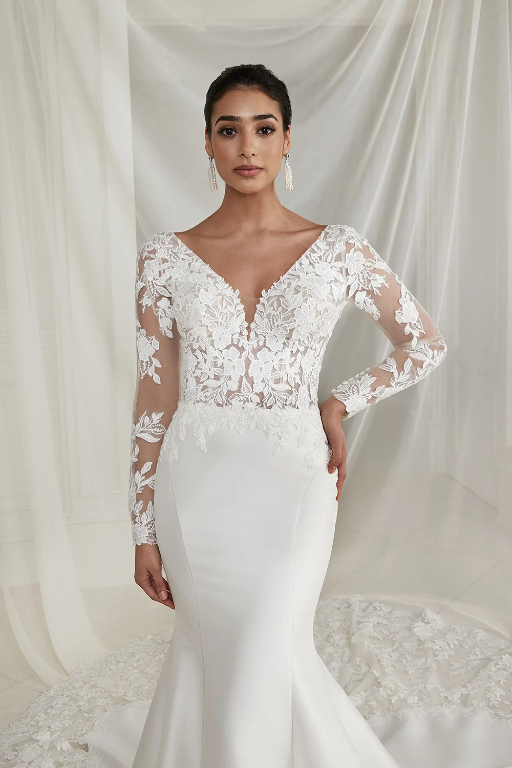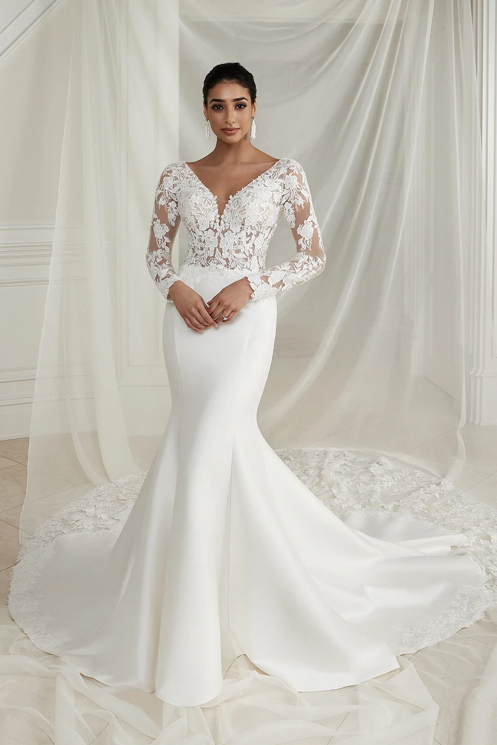 Das Brautkleid Easton von Justin Alexander vereint Klassik und Moderne zu einem eleganten Look. Das transparente Oberteil ist vorne und hinten tief ausgeschnitten sowie mit Blütenspitze bestickt. Besonders an den langen Ärmeln kommt das Muster wunderbar zur Geltung. Unterhalb des Rückenausschnitts beginnt eine lange Knopfleiste, die bis in den Rock reicht. Ab der Taille betont glatter Crêpe zunächst die Silhouette, ehe sich der Stoff durch kunstvolle Faltenlegung auffächert und in einer großen Schleppe endet, die wiederum aus Spitze gefertigt ist.