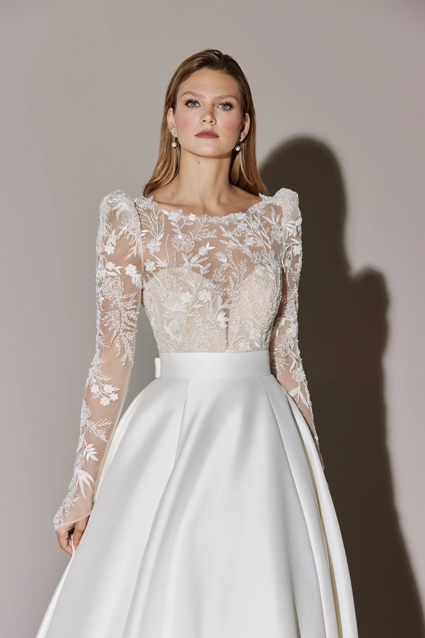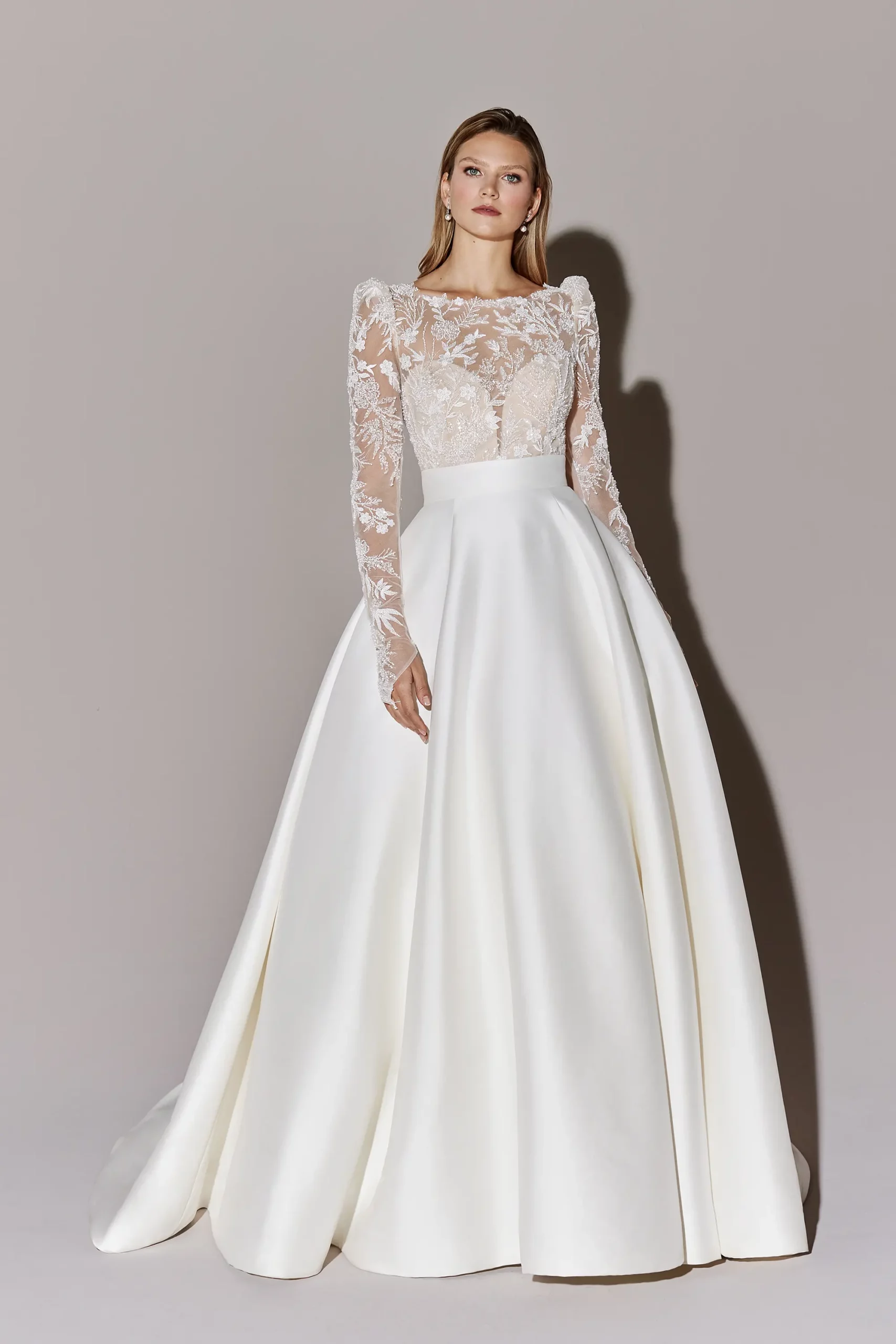 Das Brautkleid Camelot von Justin Alexander ist ein exklusives Prinzessinnen-Brautkleid mit Illusionsausschnitt und einer perfekten Kombination aus Spitze und cleanen Stoffen.