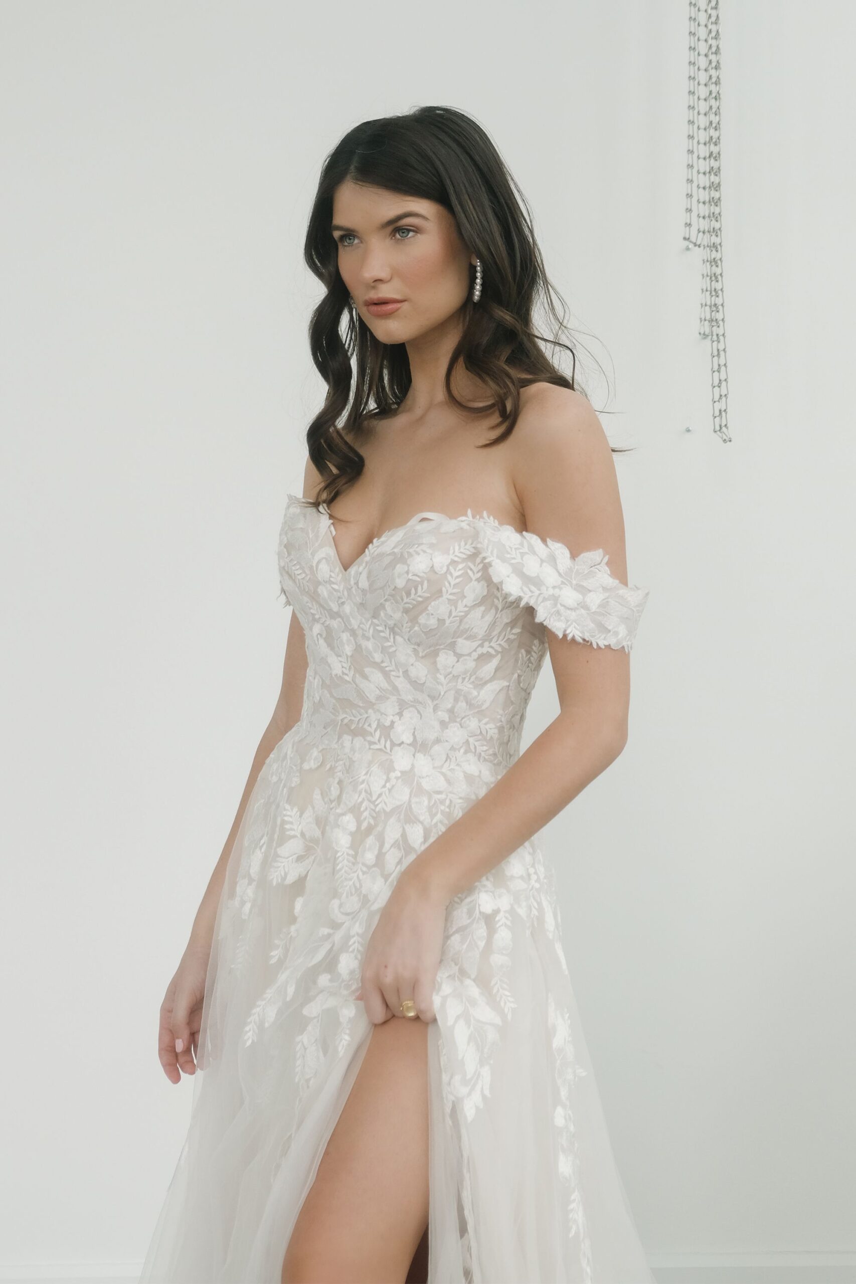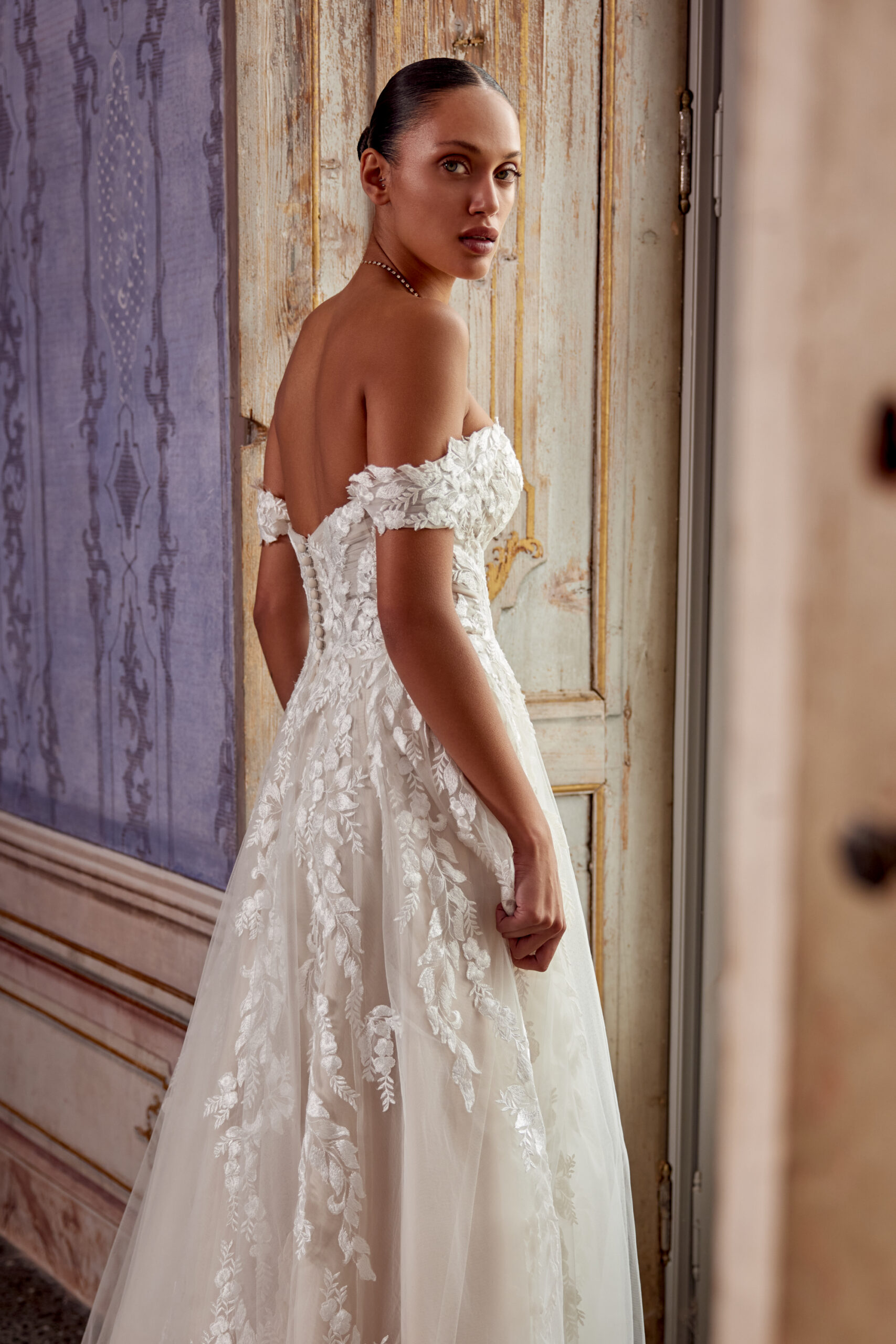 Das Modell Carlee von Justin Alexander ist ein romantisches Brautkleid mit Illusion-Mieder, Blätterspitze und abnehmbaren Trägern.