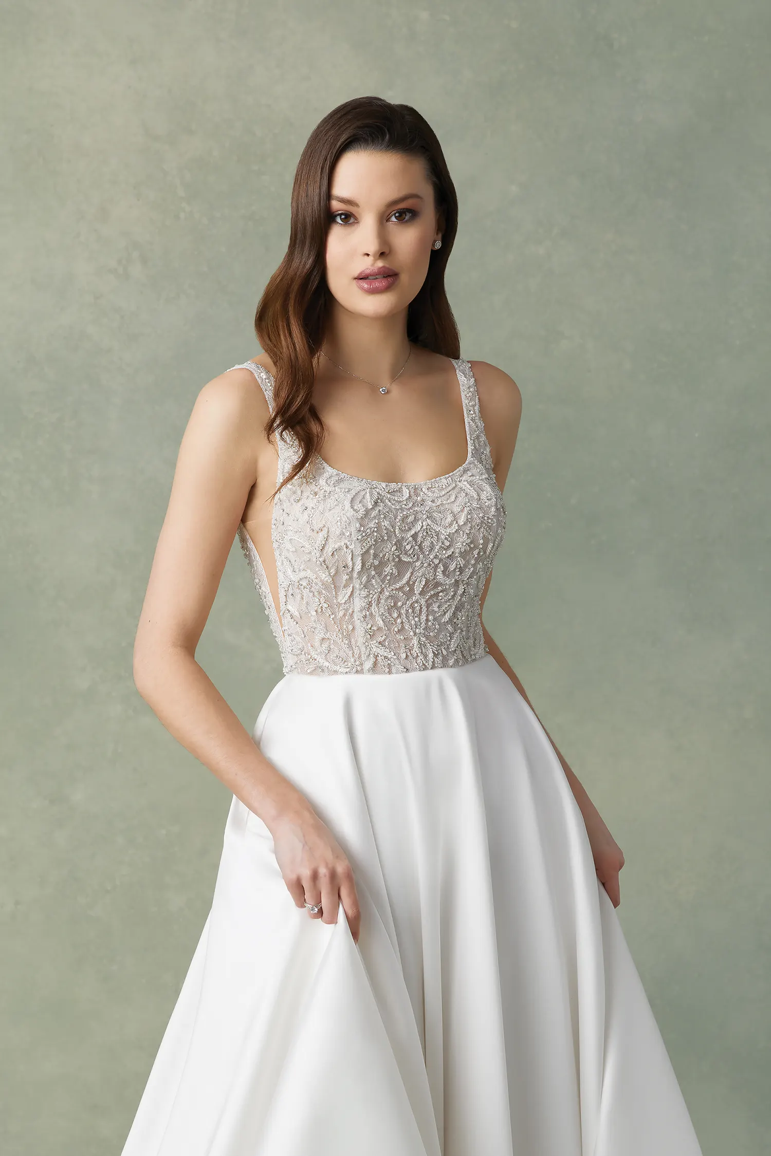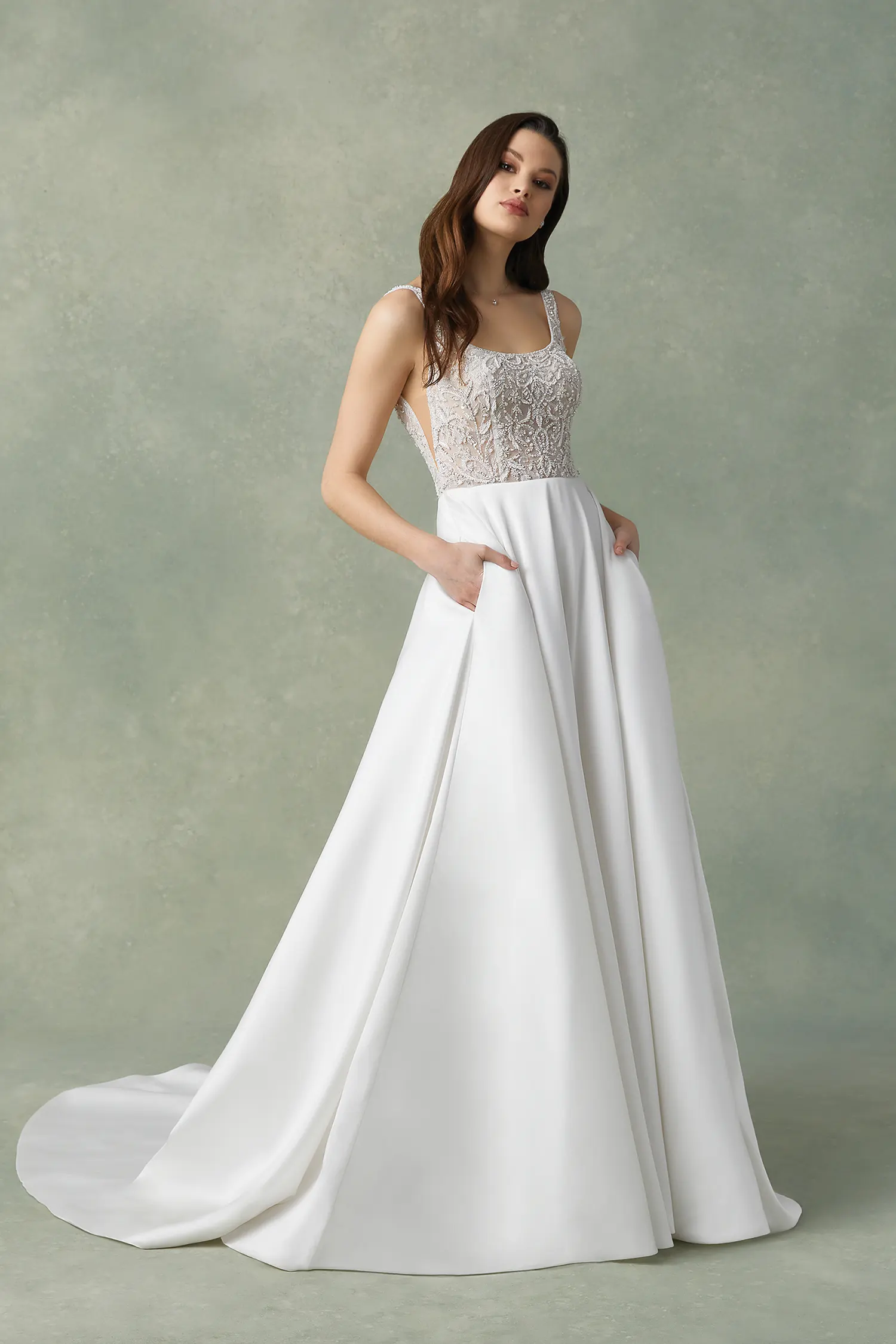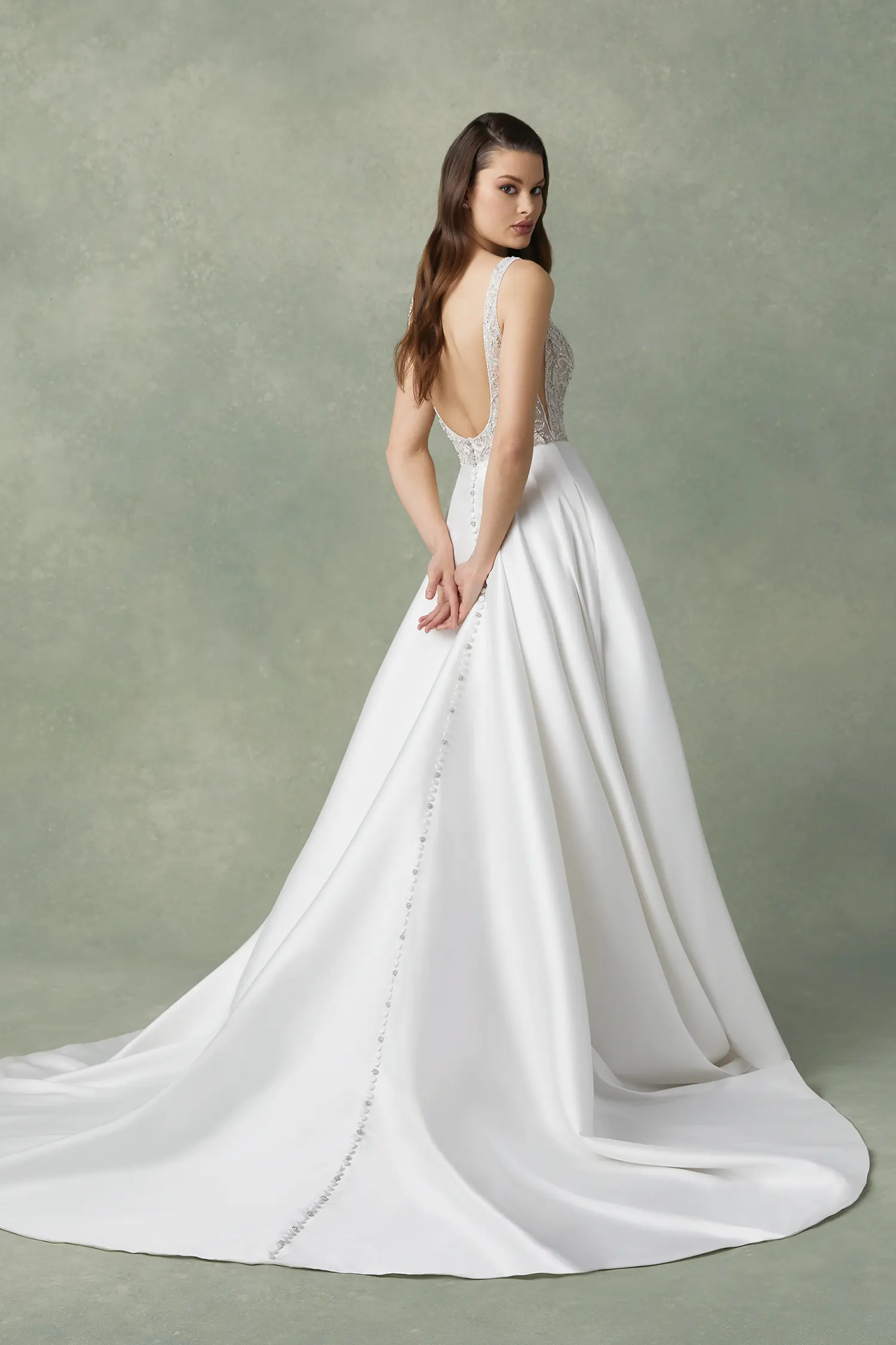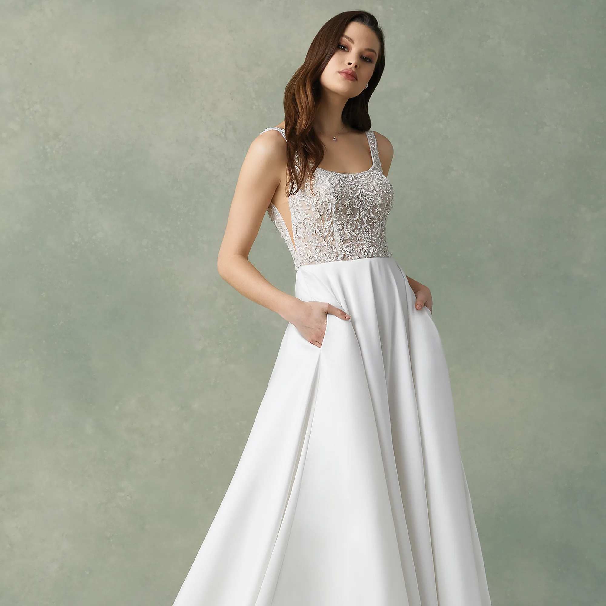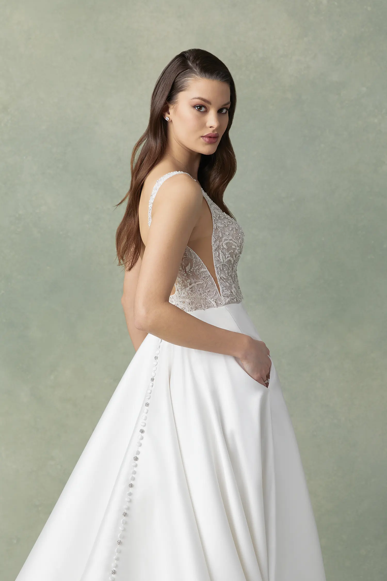 Das Brautkleid Finley von Justin Alexander strahlt eine zugleich klassische und moderne Eleganz aus. Sein detailreich mit einem Muster aus Perlen und Silberfäden verziertes Oberteil steht im Kontrast zur klaren Silhouette. An den Seitenschlitzen geben Einsätze aus transparentem Netzstoff Halt. Ab der Taille fließt der strahlend weiße Rock aus Mikado in zarter Faltenlegung zu Boden – begleitet von einer langen Knopfleiste, die mit abwechselnden Stoff- und Kristallknöpfen bis zum Schleppensaum reicht. Seitlich im Rock versteckte Taschen bieten Platz für kleine, persönliche Dinge, die Du an Eurem großen Tag nah bei Dir haben möchtest.