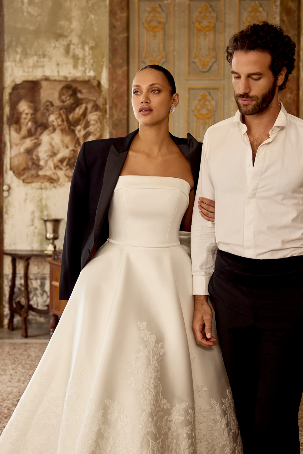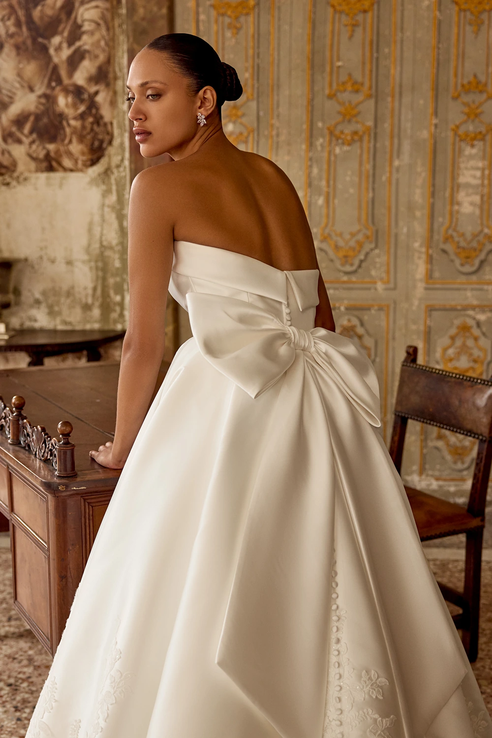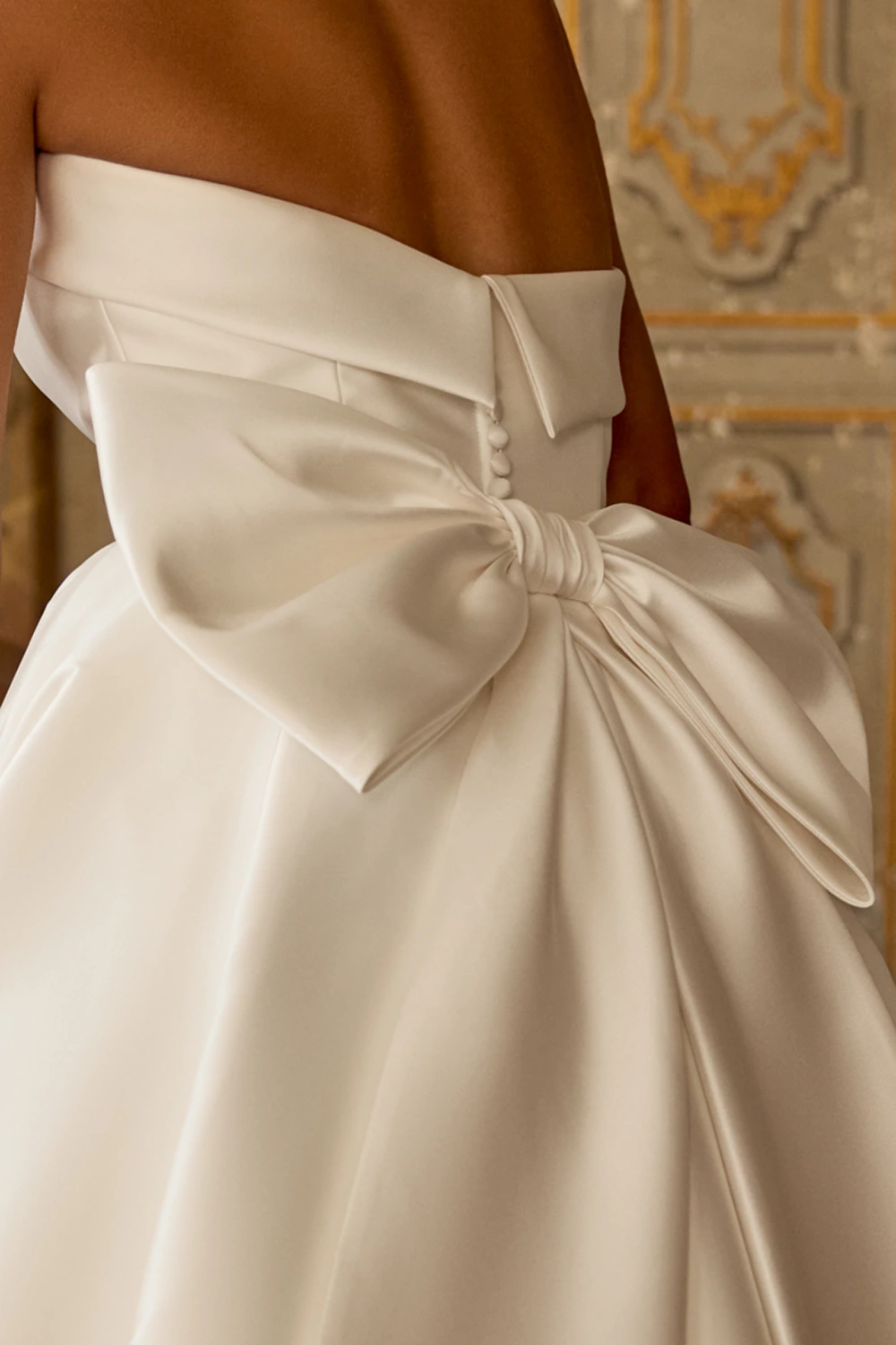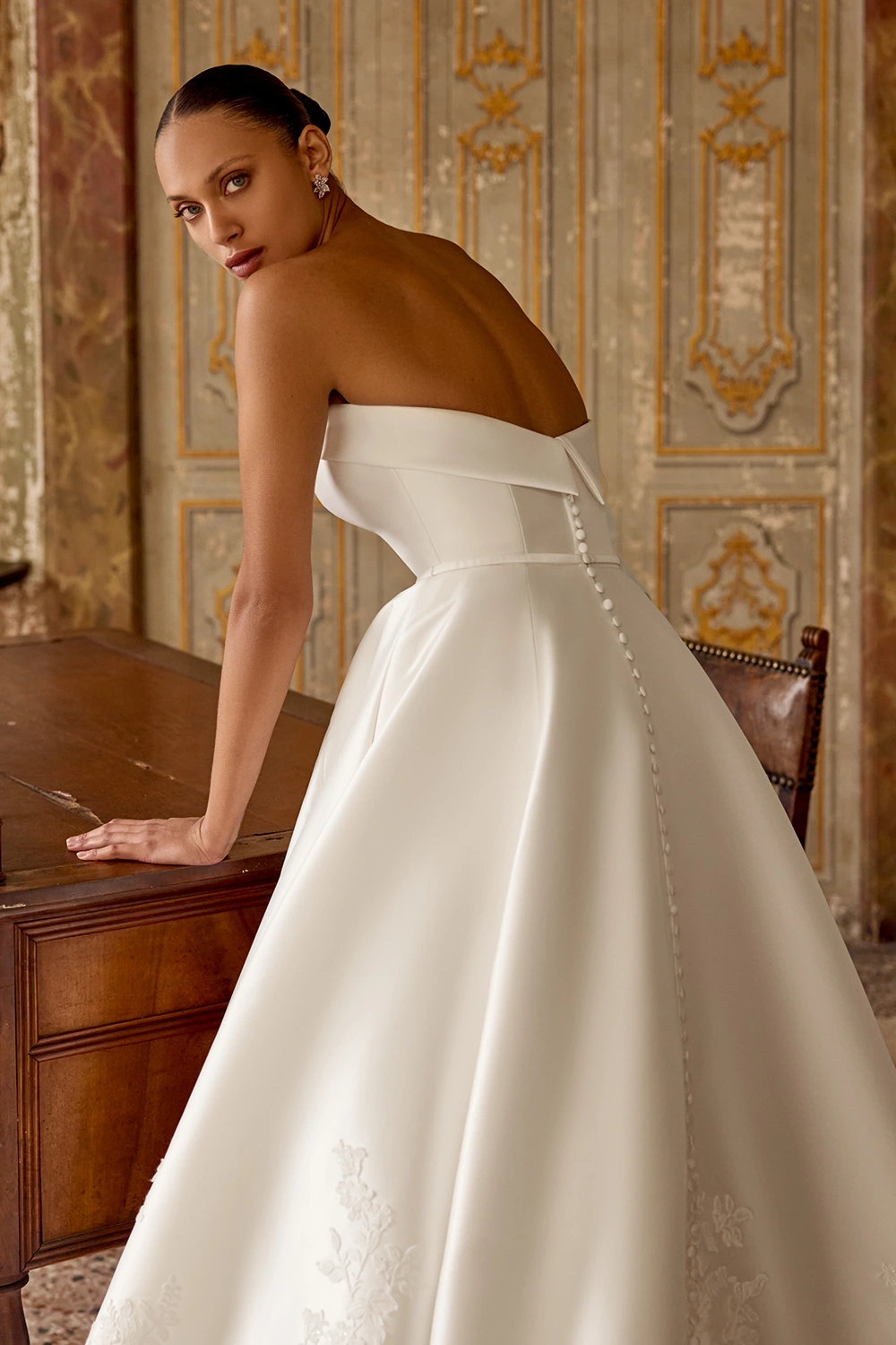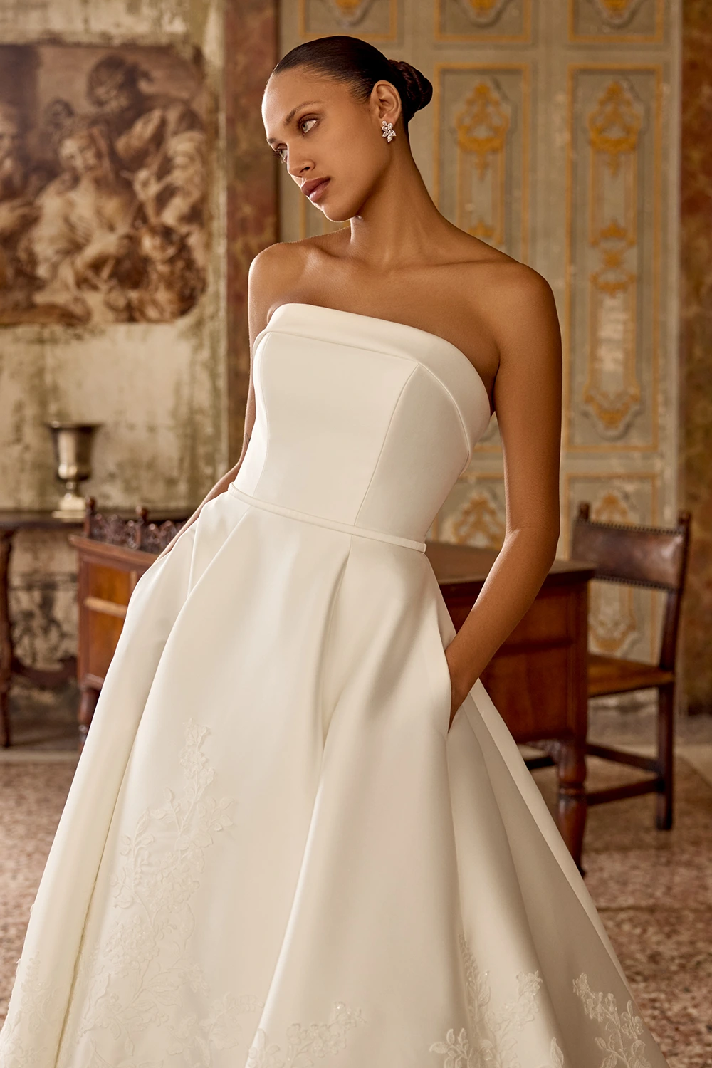 Das Modell Kaydence von Justin Alexander ist ein cleanes, weit ausgestelltes A-Linien Brautkleid mit spannenden Highlights aus Spitze und Glitzer.