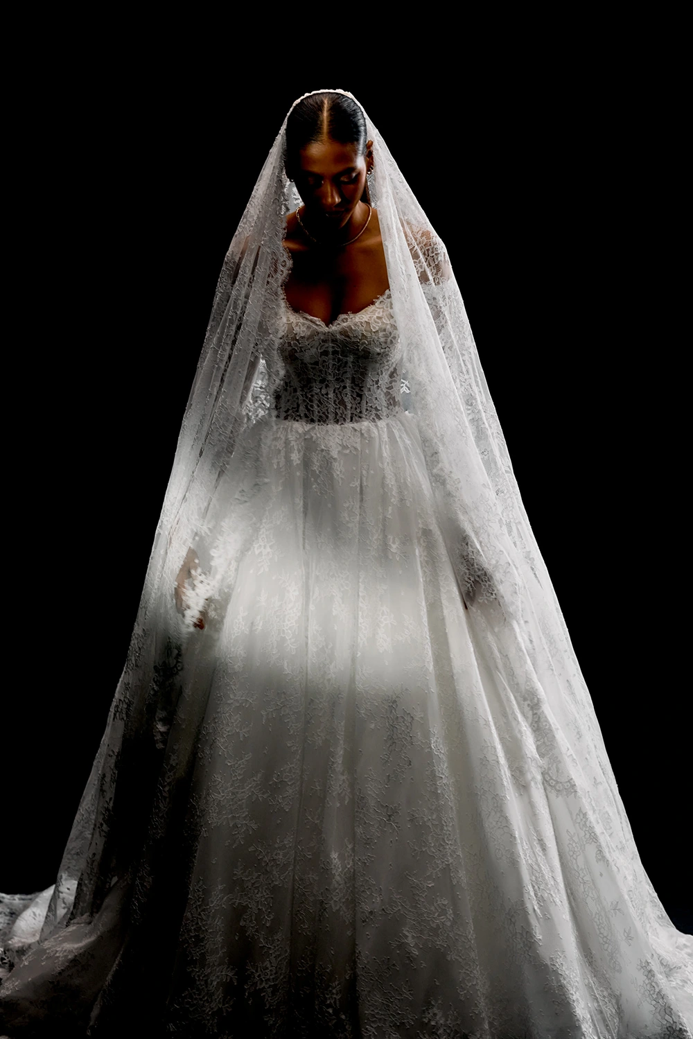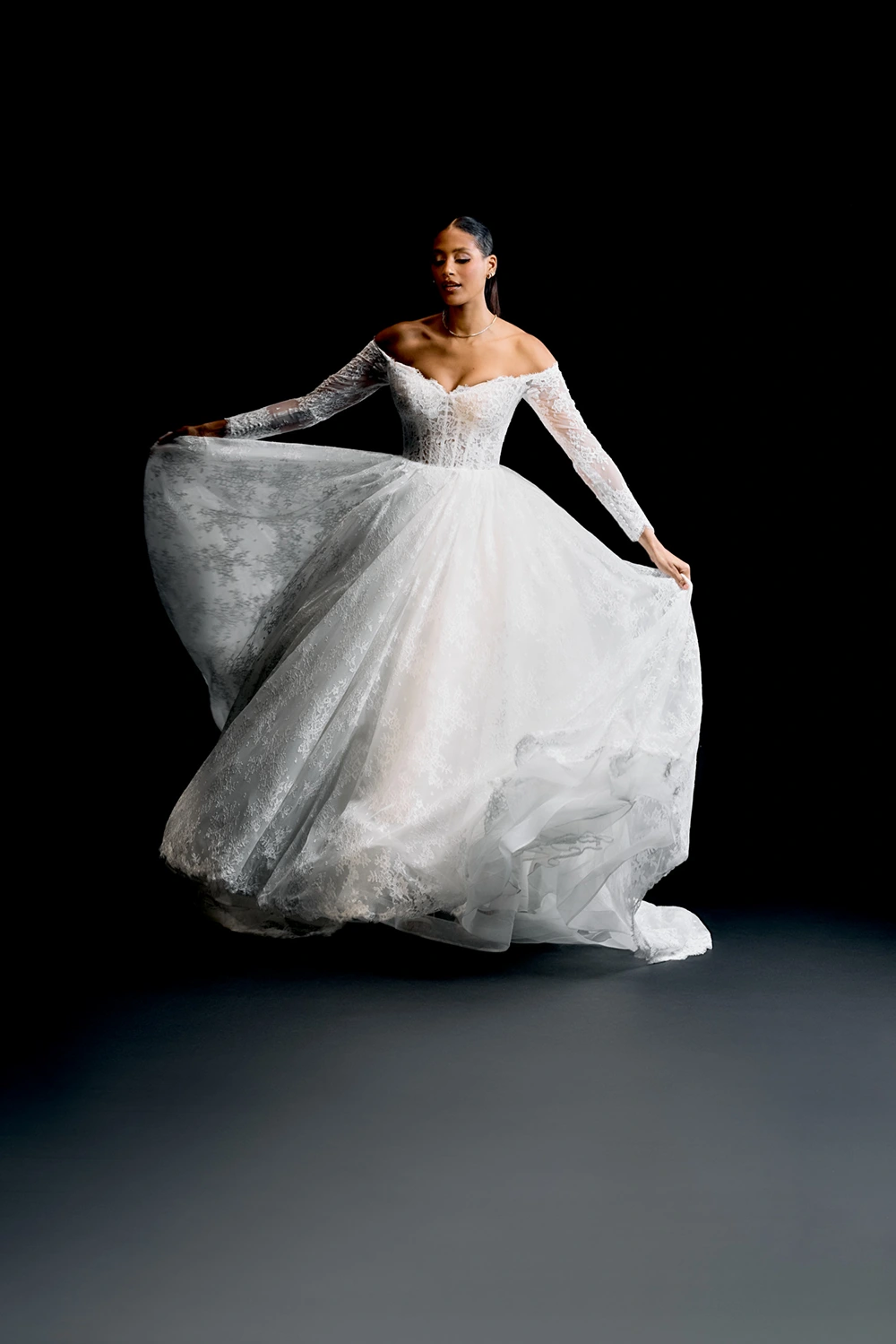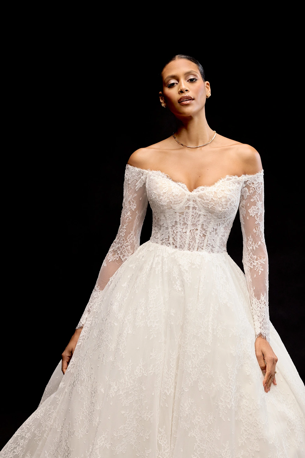 Das Modell Miyako von Justin Alexander Signature ist ein Brautkleid im Prinzesinnenschnitt mit langen Ärmeln komplett aus Chantillyspitze.