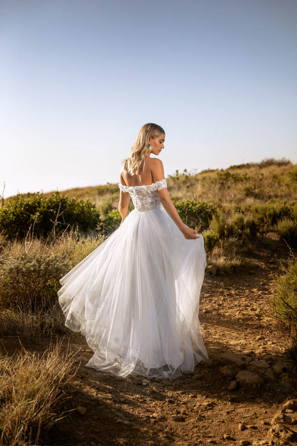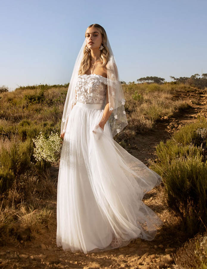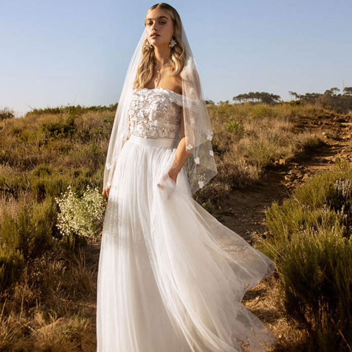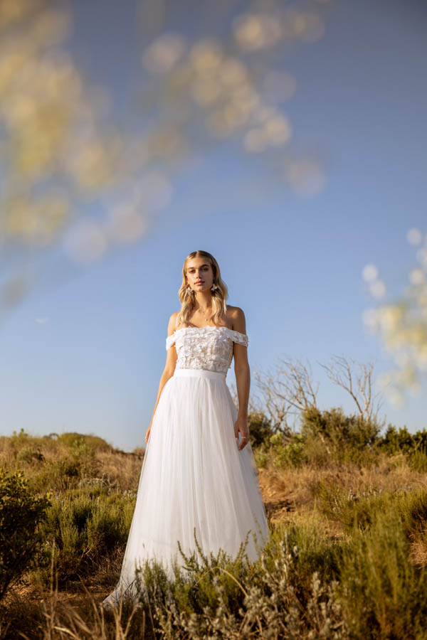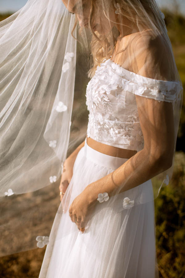 Das Brautkleid Berlin von Kelsey Rose eignet sich besonders für moderne Boho-Hochzeiten. Oberteil und Rock sind im Set erhältlich, lassen sich aber auch nach der Hochzeit wunderbar separat tragen. So kann die Erinnerung an Euren großen Tag lange lebendig bleiben. Das semtransparente ist mit moderner Spitze in wild-floralem Muster bestickt. Der gerade Ausschnitt wird zu seitlichen Trägern im Carmen-Stil. Unter dem glänzenden Taillenband wirft sich der blickdicht gefütterte Tüllrock in voluminöse Falten und schließt mit einer kurzen Schleppe ab, die Bewegungsfreiheit garantiert.