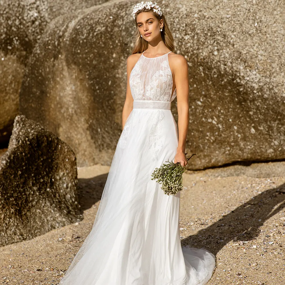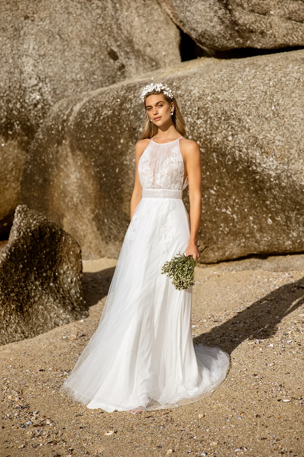 Dakota von Kelsey Rose ist ein modernes Brautkleid mit romantischen Elementen. Zarte Chantillyspitze bedeckt das Oberteil aus transparent gerafftem Tüll mit tiefen Seitenschlitzen und großem Rückenausschnitt. Unter einem ebenfalls gerafften Taillenband fließt der weiche Stoff mit leichtem Volumen zu Boden. Die floralen Applikationen setzen sich bis in den Rock fort. Zusätzlich ist dieser mit bequemem elfenbeinfarbenem Jersey gefüttert. Die Schleppe erhält dadurch einen geschichteten Effekt.