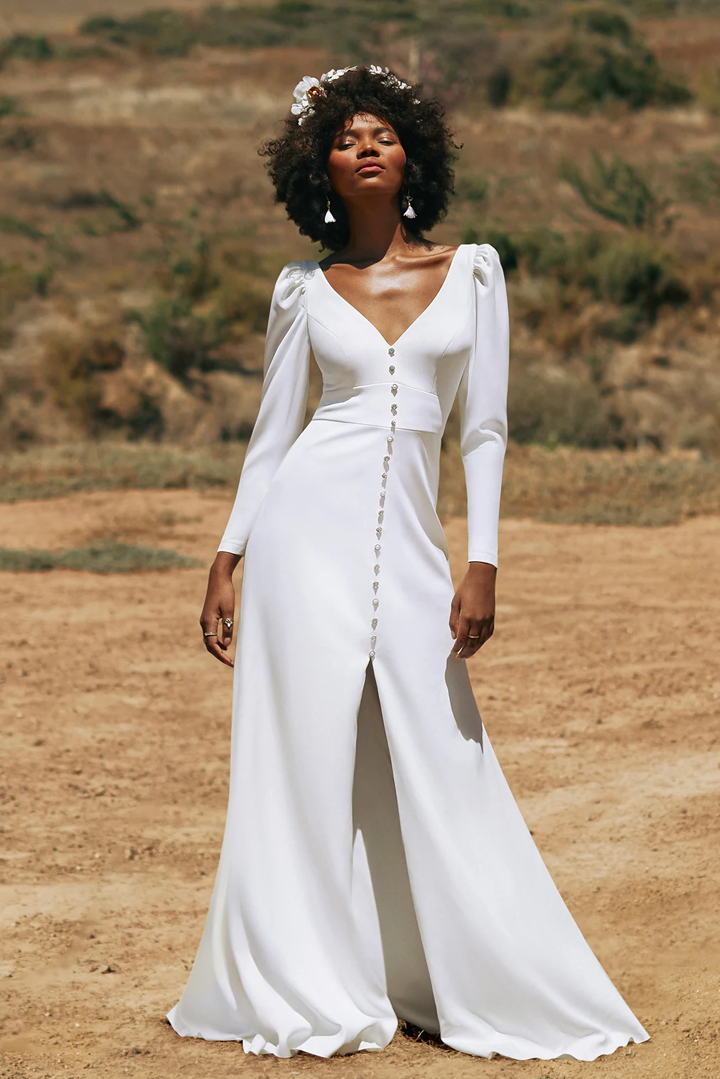 Das Brautkleid Avery von Kelsey Rose modernisiert die Vintage-Silhouette durch einen schlicht-eleganten Stil. Der schmale Schnitt des Modells wird durch eine Perlenknopfleiste an der Vorderseite betont, die an der Rockpartie in einen mittigen Schlitz übergeht. Der geschmeidige Crêpe ist an den Schultern gepufft, sodass Keulenärmel entstehen. V-Ausschnitte an Vorder- und Rückseite balancieren die langen Ärmel aus.