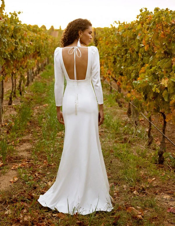 Das Brautkleid Brooklyn von Kelsey Rose passt zu einer Hochzeit im modernen Vintage-Look. Der vollständig aus glattem Crêpe gefertigte Entwurf vereint klassische und neue Elemente: Lange, an den Schultern gepuffte Ärmel rahmen den eckigen Ausschnitt. Am tiefen, ebenfalls eckigen Rückenausschnitt lassen sich zwei Bänder mit Perlen und Quasten zu einer Schleife binden. Darunter fließt der Rock schmal zu Boden. An der Vorderseite ist er bis auf Oberschenkelhöhe geschlitzt. Von der Taille bis zum Schlitz verläuft eine Knopfleiste, ebenso an beiden Ärmelbüdchen.