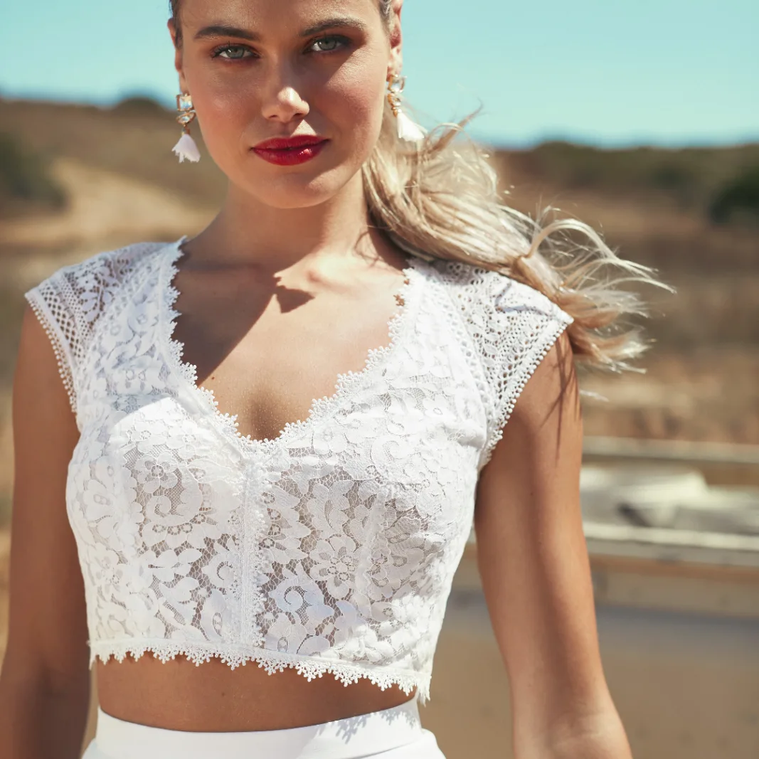 Das aus Blütenspitze gefertigte Brauttop Flora von Kelsey Rose macht seinem Namen alle Ehre. Das Muster ziert die Vorderseite semi- und die Rückseite transparent. Zudem bestehen die breiten Schulterpartien sowie die Zackenborten aus Häkelspitze den Ausschnitt sowie den Taillensaum. Eine Knopfleiste schmückt die Rückseite.