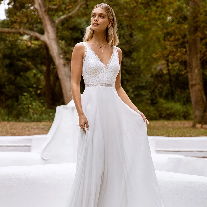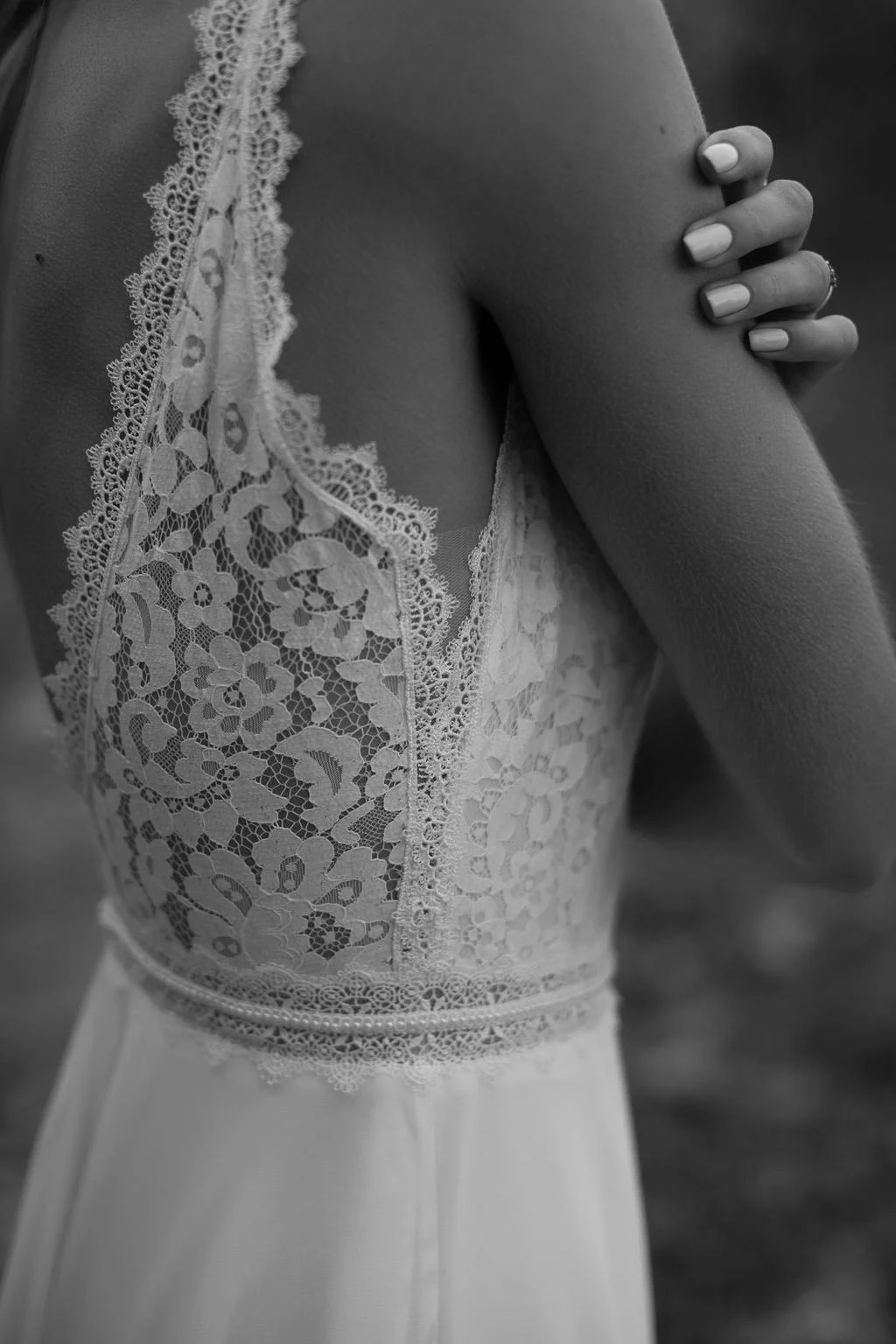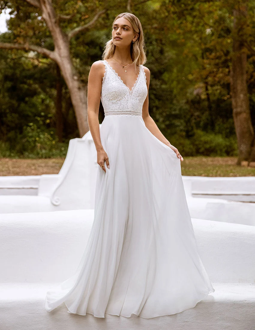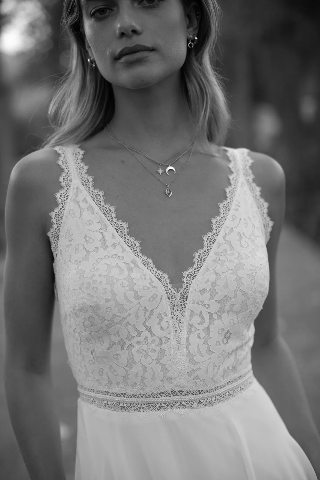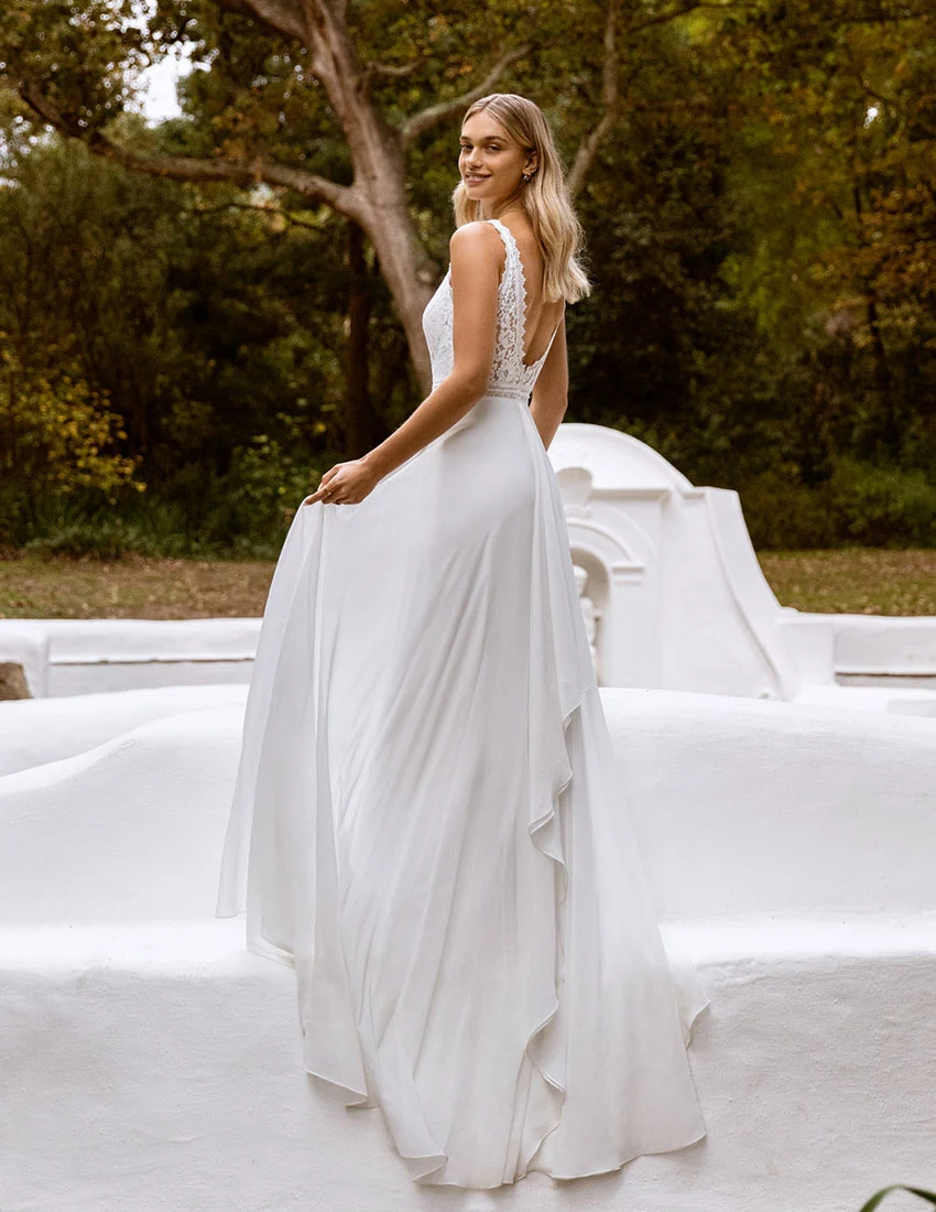 Das Brautkleid India von Kelsey Rose zeigt romantische Spitze und einen Wasserfall-Rock. Das florale Muster bedeckt das an der Vorderseite gefütterte und an der Rückseite transparente Oberteil. Ein gezackte Borten schmückt die Ausschnitte und Träger. Unter einem zarten, perlenbestickten Taillenband fließt der lange Chiffonrock zu Boden. Dieser besitzt an der Rückseite ein durch Volants erzeugtes Wasserfall-Detail, das sich bis in die Schleppe fortsetzt.