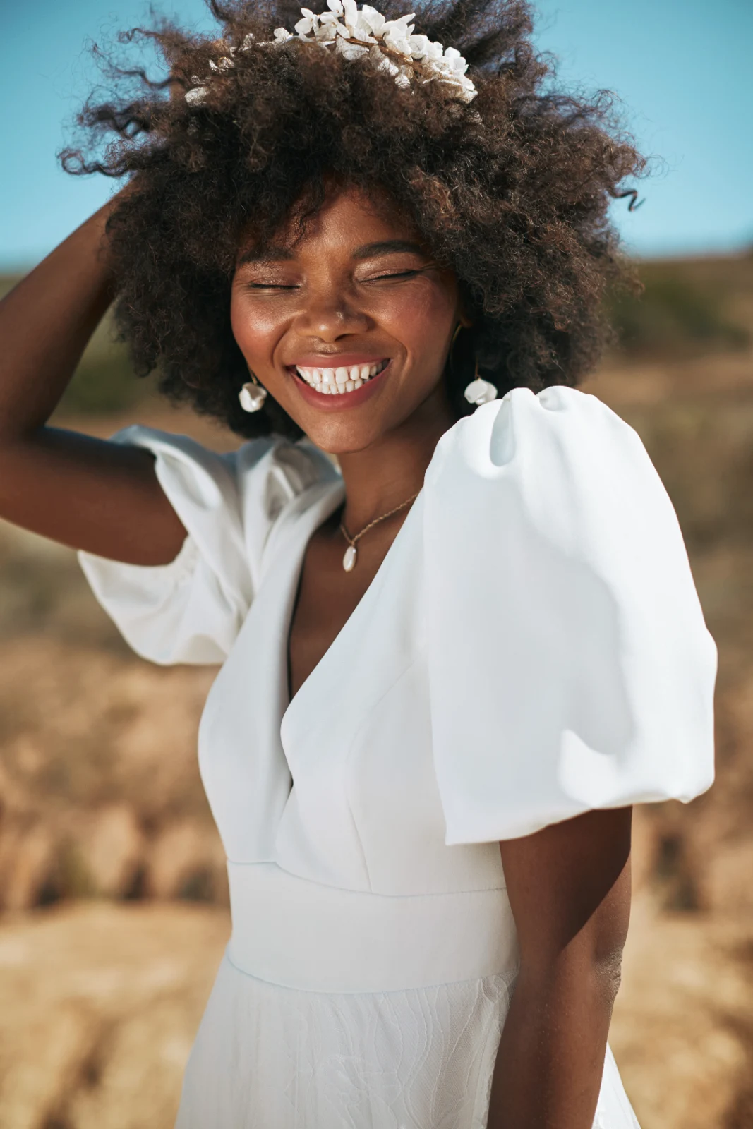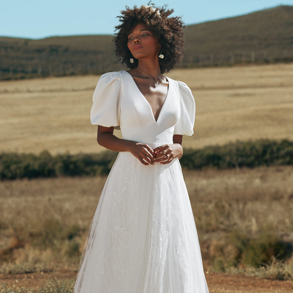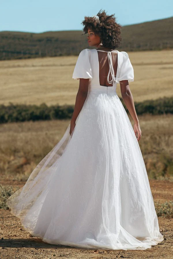 Das Brautkleid Juno von Kelsey Rose ist ein außergewöhnlicher Mix aus Klassik und Moderne. Sein schlichtes Oberteil aus glattem Crêpe steht im Kontrast zum romantisch bestickten Rock. Die kurzen Ärmel mit gepuffter Schulterpartie betonen durch ihr Volumen den Oberkörper. An der Rückseite befindet sich ein tiefer, eckiger Ausschnitt, der von einer Schleife aus zwei schmalen Bändern mit Quasten verziert ist. Ab der Taille fächert sich der mit floraler Spitze bestickte Tüllrock auf und schließt mit einer angedeuteten Schleppe ab.