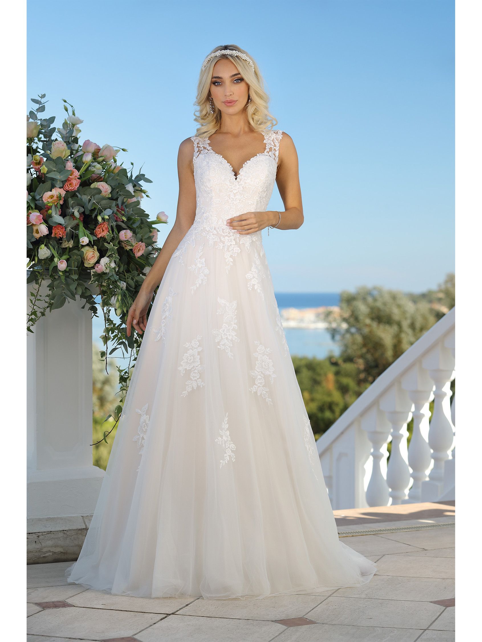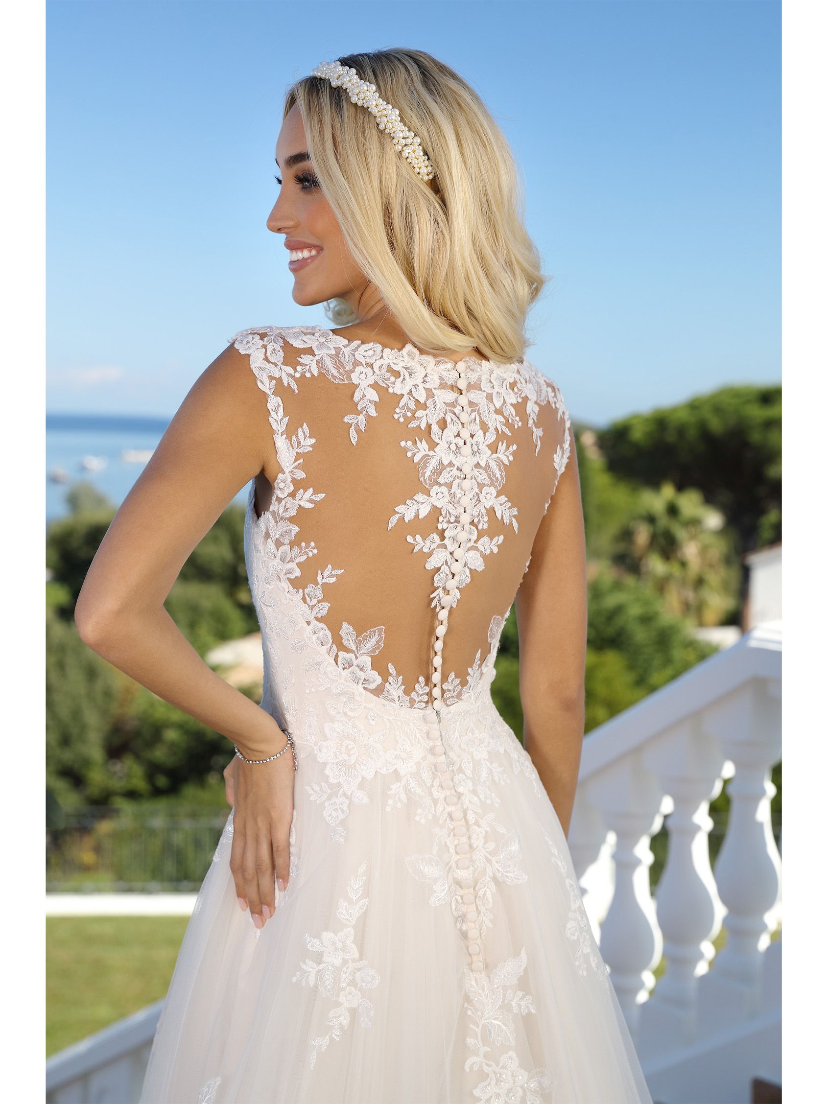 Das Brautkleid 422016 von Ladybird ist wie eine schmalere Variante des Modells 422013 in zart gebrochenem Weiß. Florale Spitze rankt sich über das gesamte Oberteil und findet sich vereinzelt auf dem leicht voluminösen Tüllrock wieder. Dazu formt sie die Träger sowie die transparente Rückenpartie. Dort reicht außerdem eine Knopfleiste vom Kragen bis in den Rockansatz.