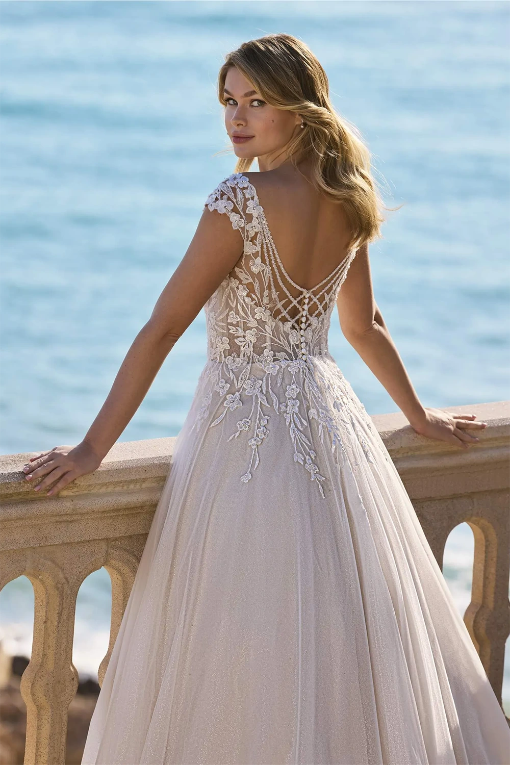 Das Modell Borage von Ladybird ist ein zart fließendes A-Linie Brautkleid mit einem Oberteil besetzt aus floralen Spitzenapplikationen.
