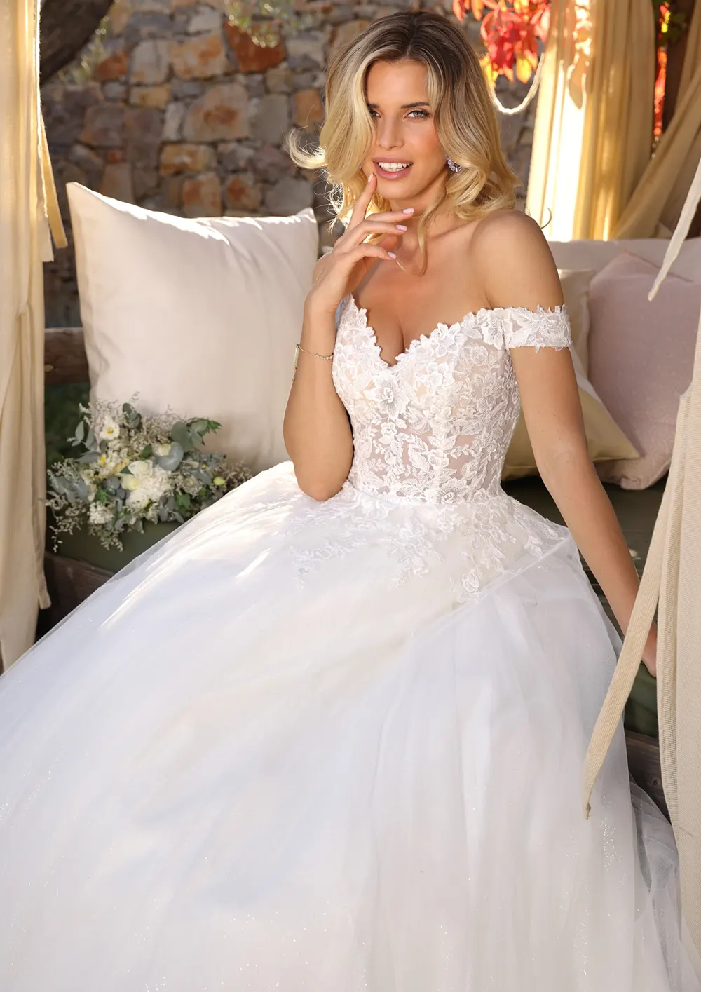Kyndall von Ladybird ist ein klassisches und romantisches Brautkleid im glamourös glitzernden Prinzessin-Schnitt. Das transparente Oberteil ist mit floraler Spitze bedeckt und mit sichtbar eingearbeitet Stäbchen versehen. Der Ausschnitt geht über in seitliche Träger. Der dadurch entstehende Carmen-Ausschnitt unterstreicht die Schulterlinie. Der ab der Taille voluminös aufgeworfene Rock ist aus Glitzertüll gefertigt.