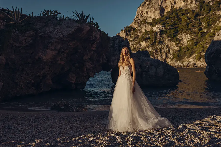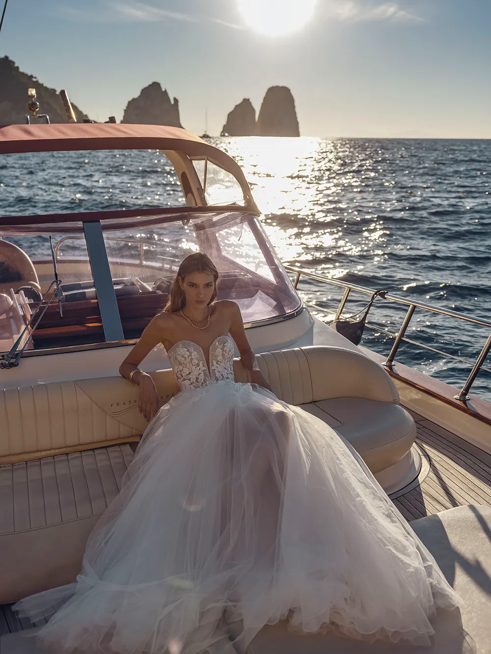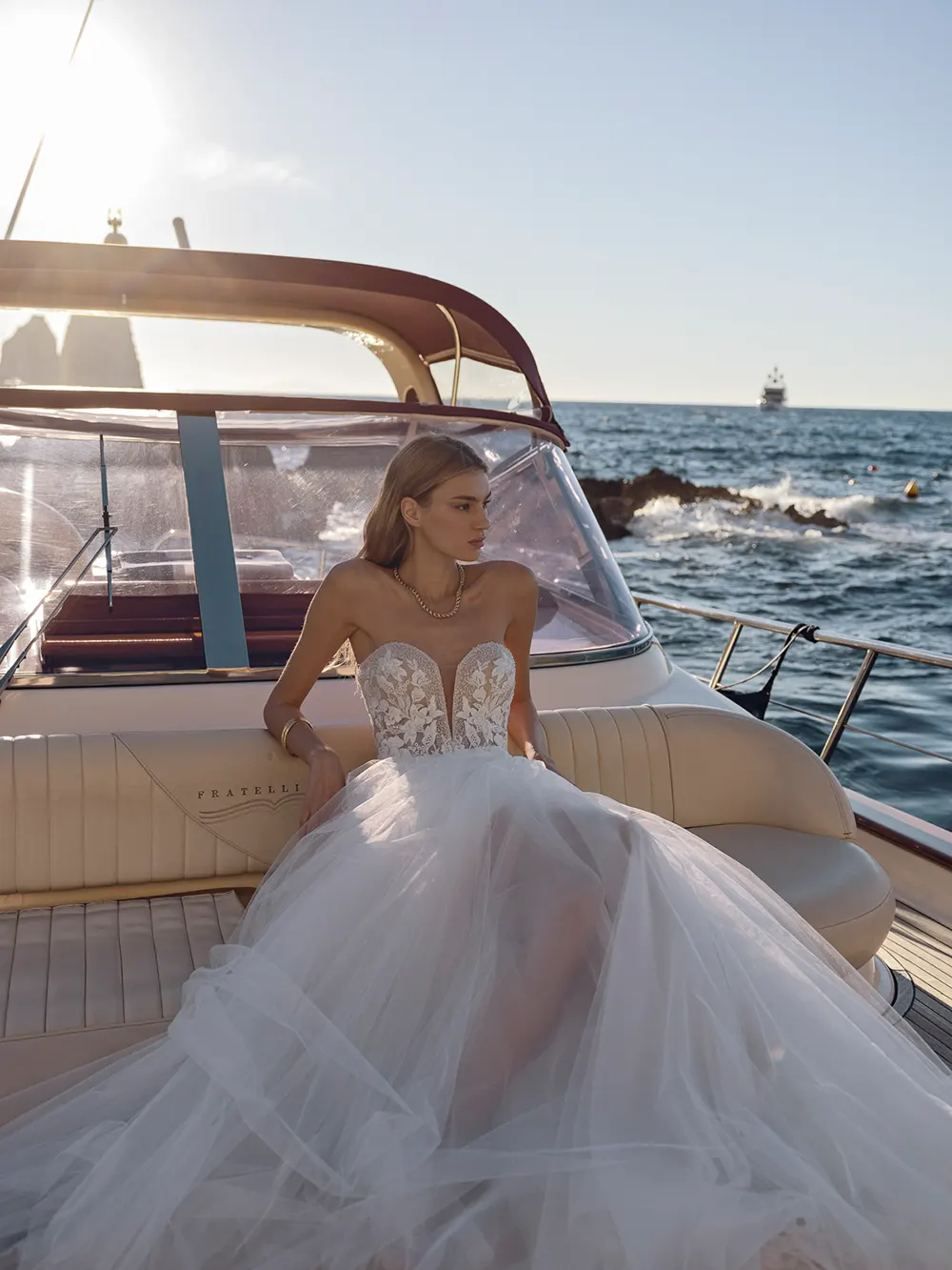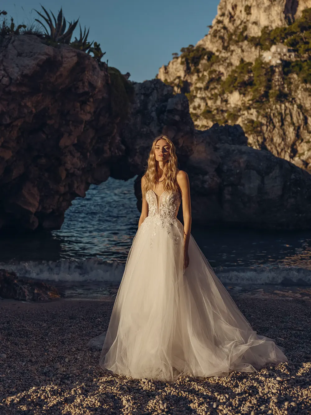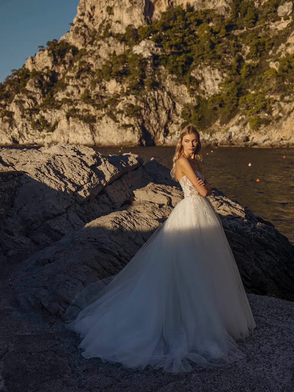 Das Brautkleid Berlinde von Le Papillon ist ein zauberhaftes Prinzessinnen-Brautkleid, das keine Wünsche offen lässt. Es vereint Tüll, Spitze, Perlen und Pailletten.