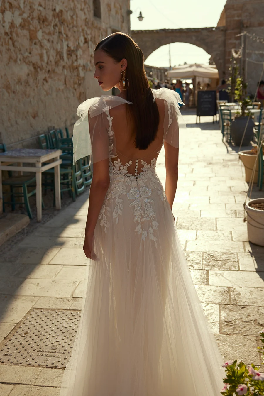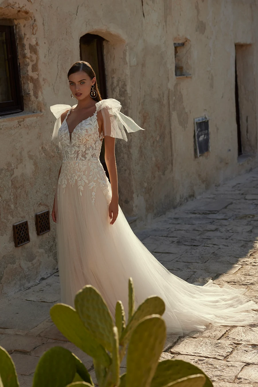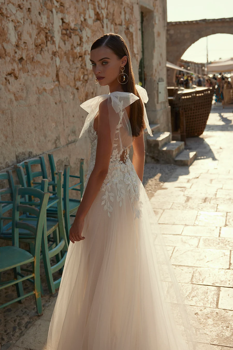 Das Brautkleid Eloise von Le Papillon ist ein leichtes A-Linien Brautkleid mit einem lang gezogenem Oberteil aus Spitze und Schleifen am Träger.