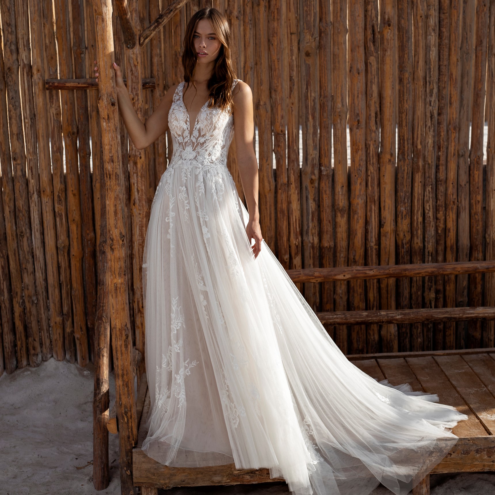 Odetta von Le Papillon ist transparenter als das Brautkleid Larna und besitzt ein Mieder aus gerafften Tüllbahnen. Dadurch kommen die Spitzenapplikationen fabelhaft zur Geltung. Dezent platzierte Perlen und Pailletten lassen das florale Spitzenmuster zusätzlich erblühen. Dieses rankt sich bis in den Saum des Tüllrocks, der in einer Kapellenschleppe endet. Eine kurze Knopfleiste setzt am tiefen Rückenausschnitt an.