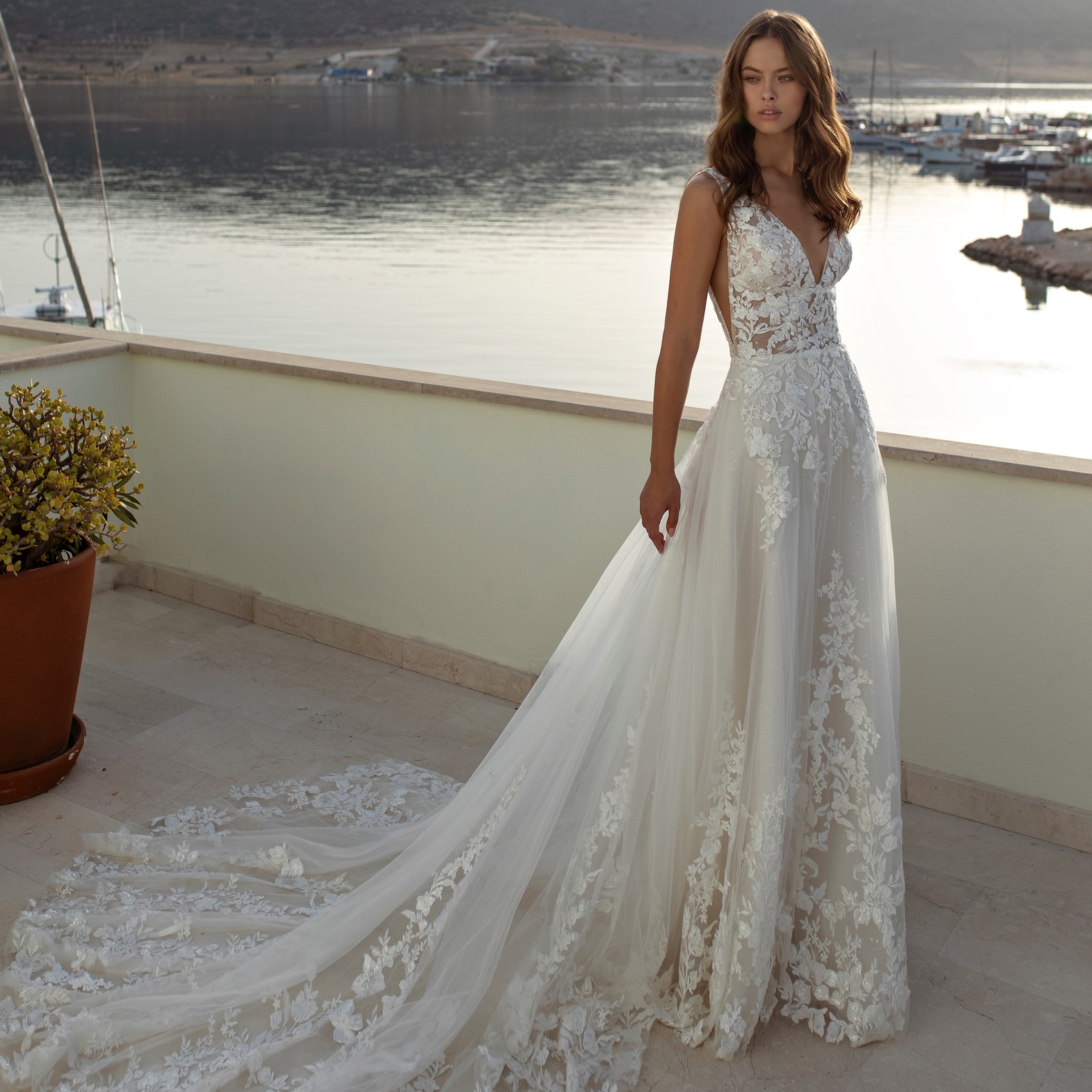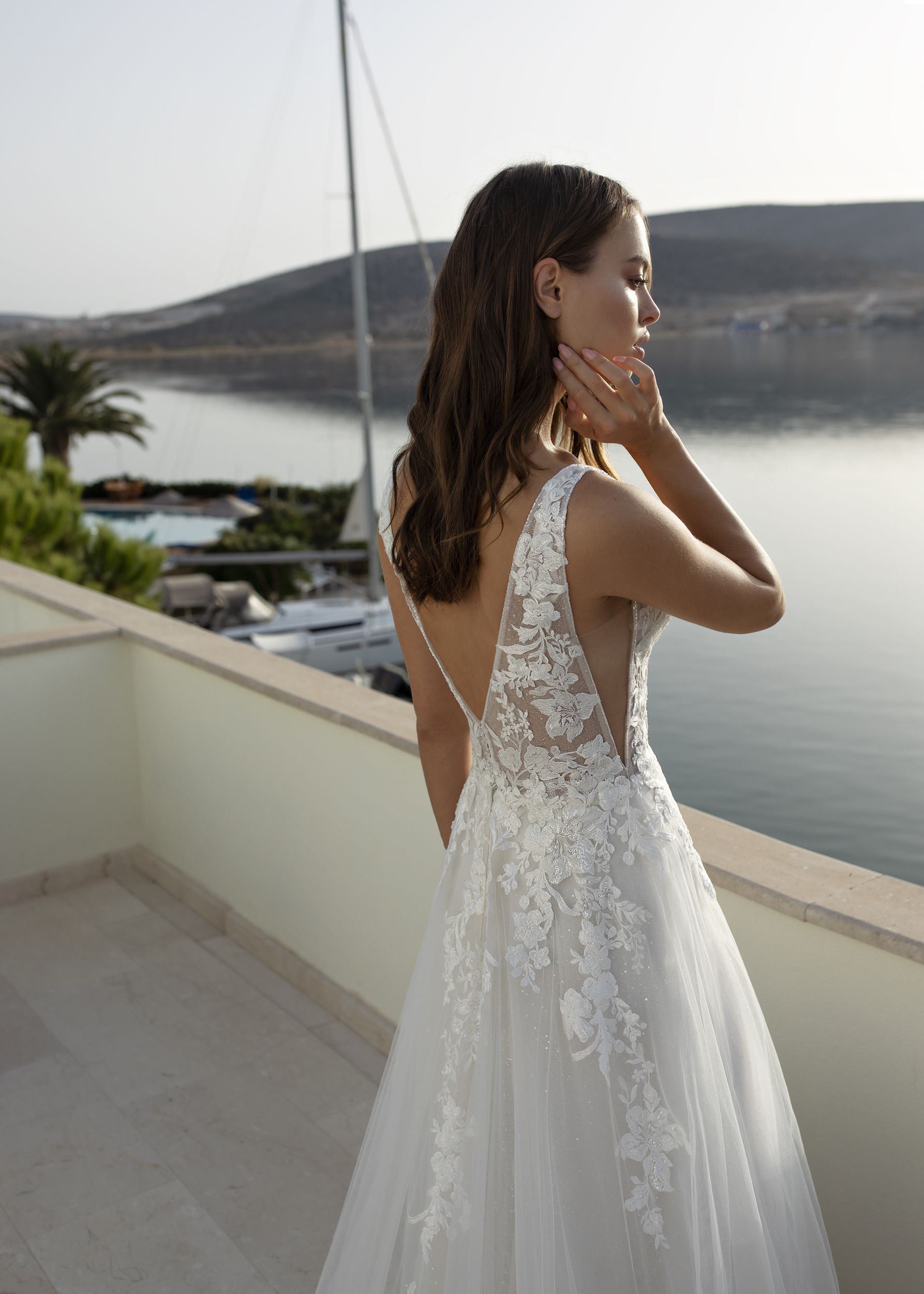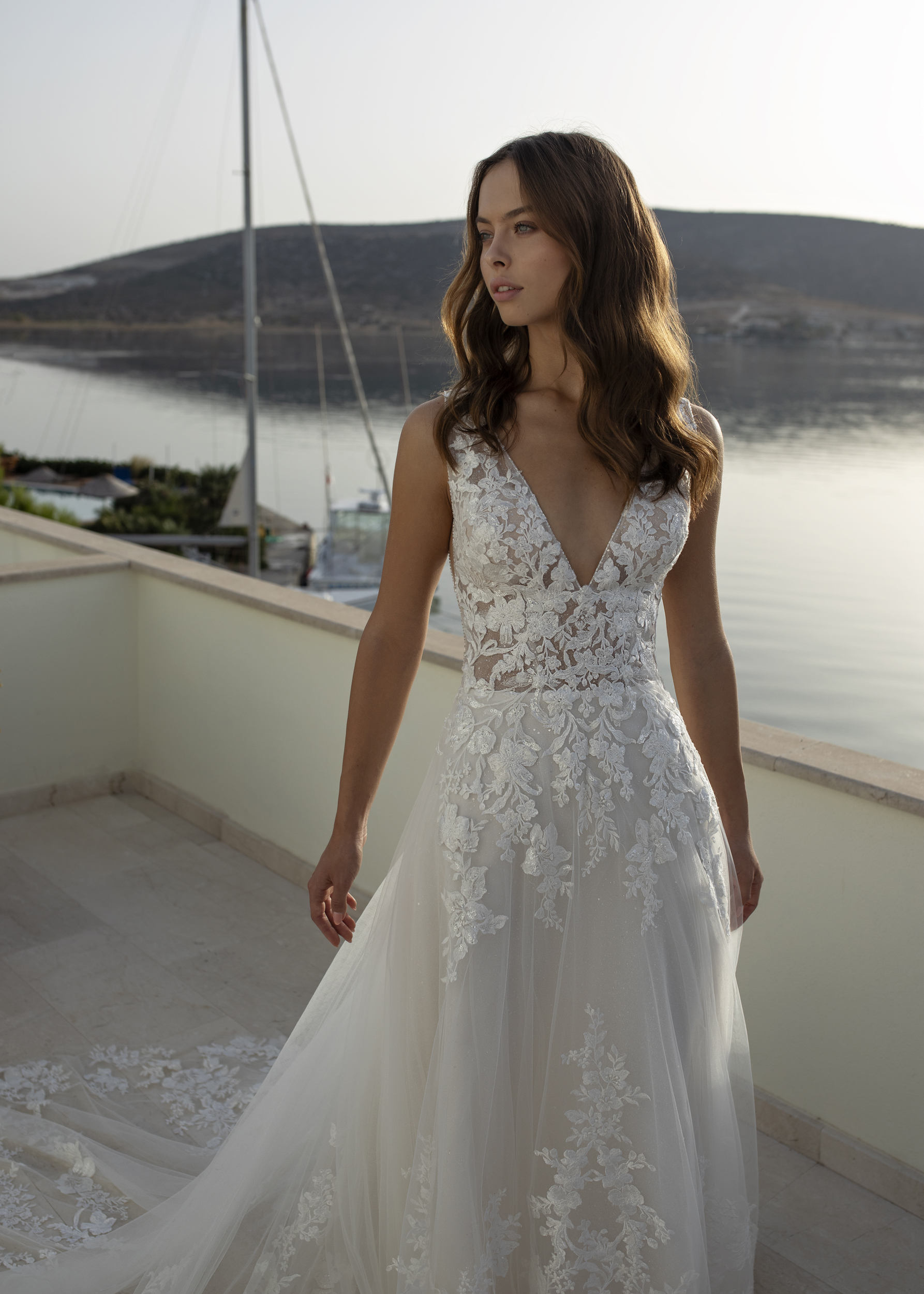 Das Brautkleid Odina von Le Papillon wirkt wie ein üppiges Blumenbouquet. Die romantische Blütenspitze rankt sich vom semitransparenten Oberteil bis in den weiten Tüllrock und den Saum der Kapellenschleppe. Dazu lassen Dich über den gesamten Stoff verteilte Pailletten erstrahlen. Das Kleid ist seitlich sowie hinten tief geschlitzt und betont dadurch Deinen Oberkörper.
