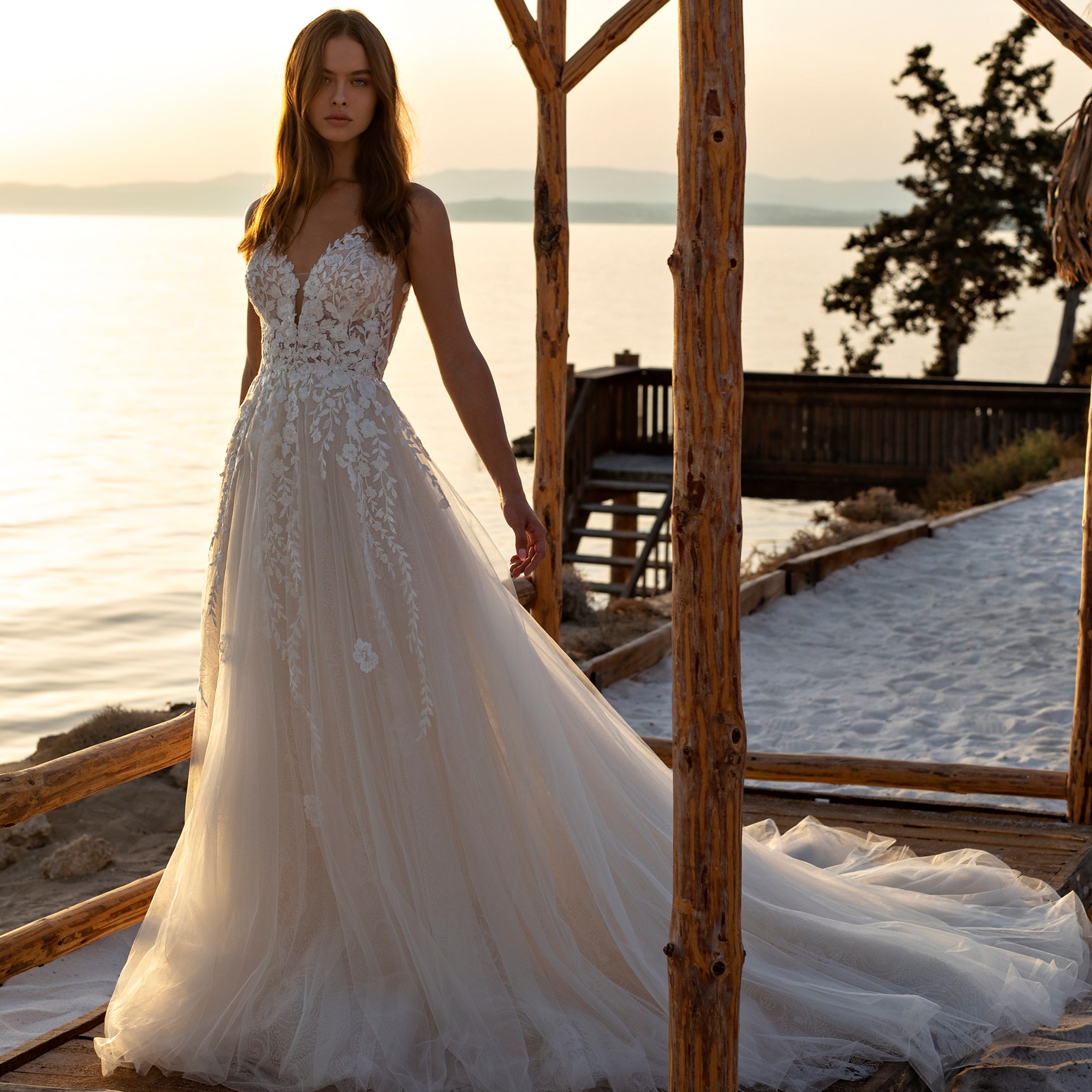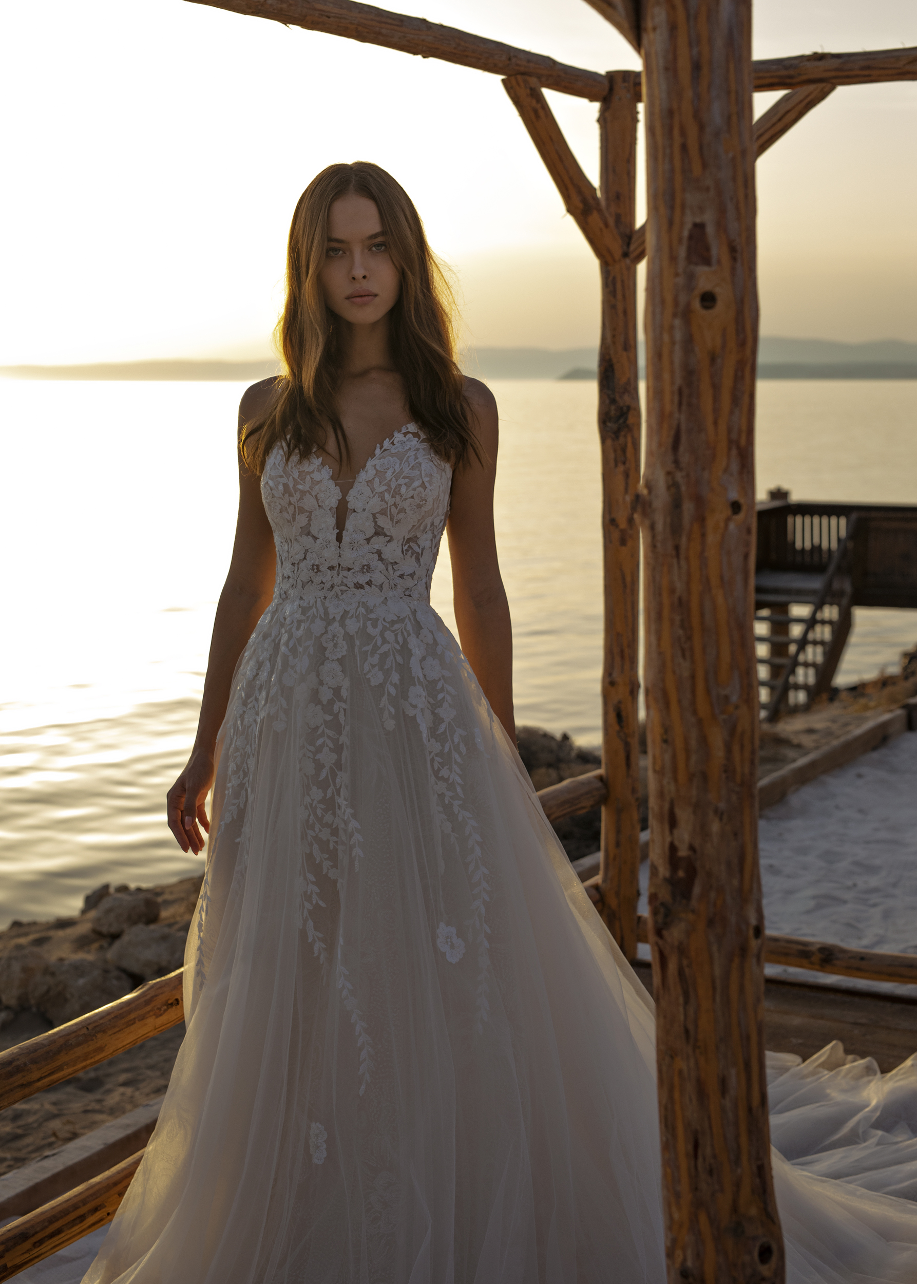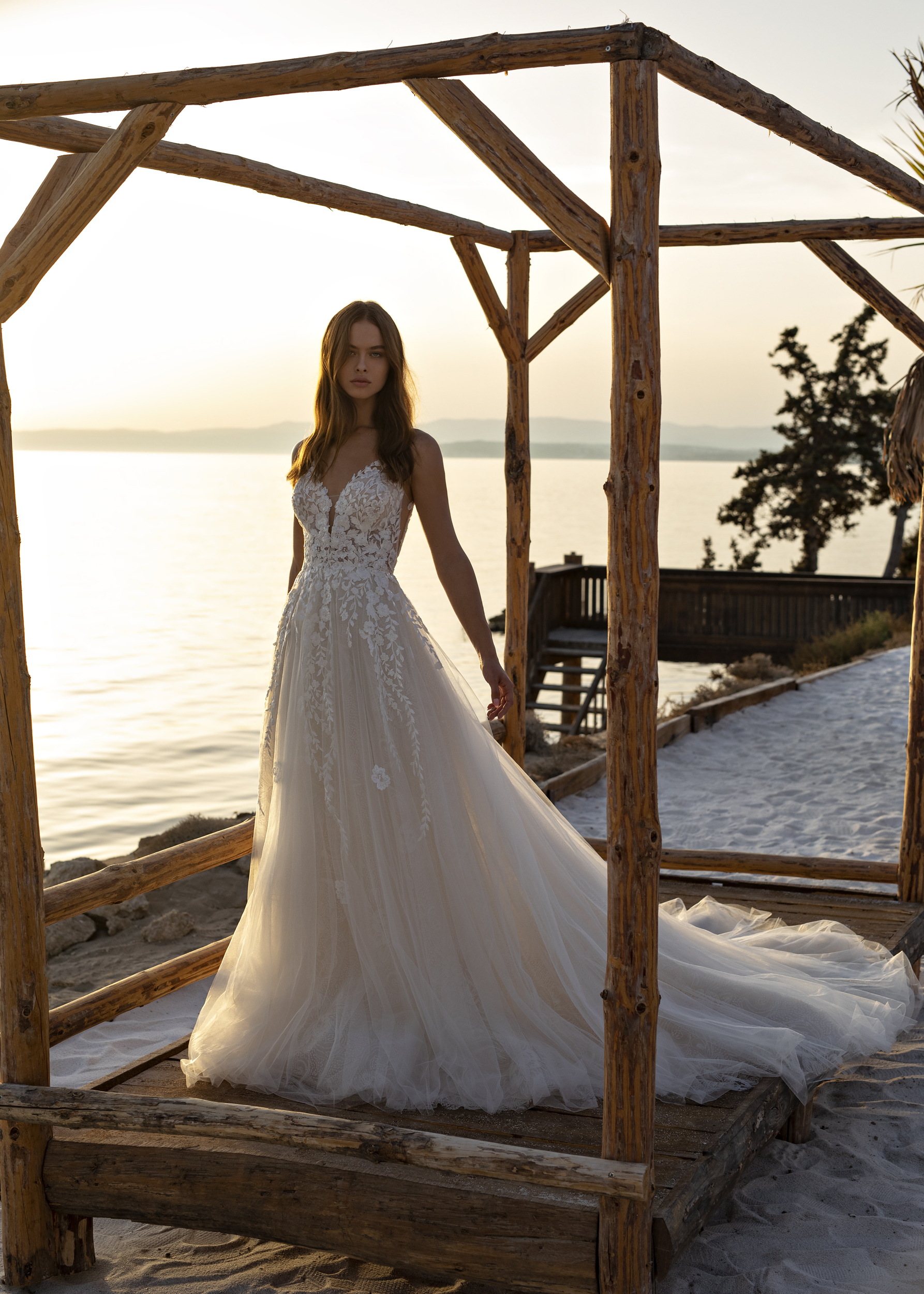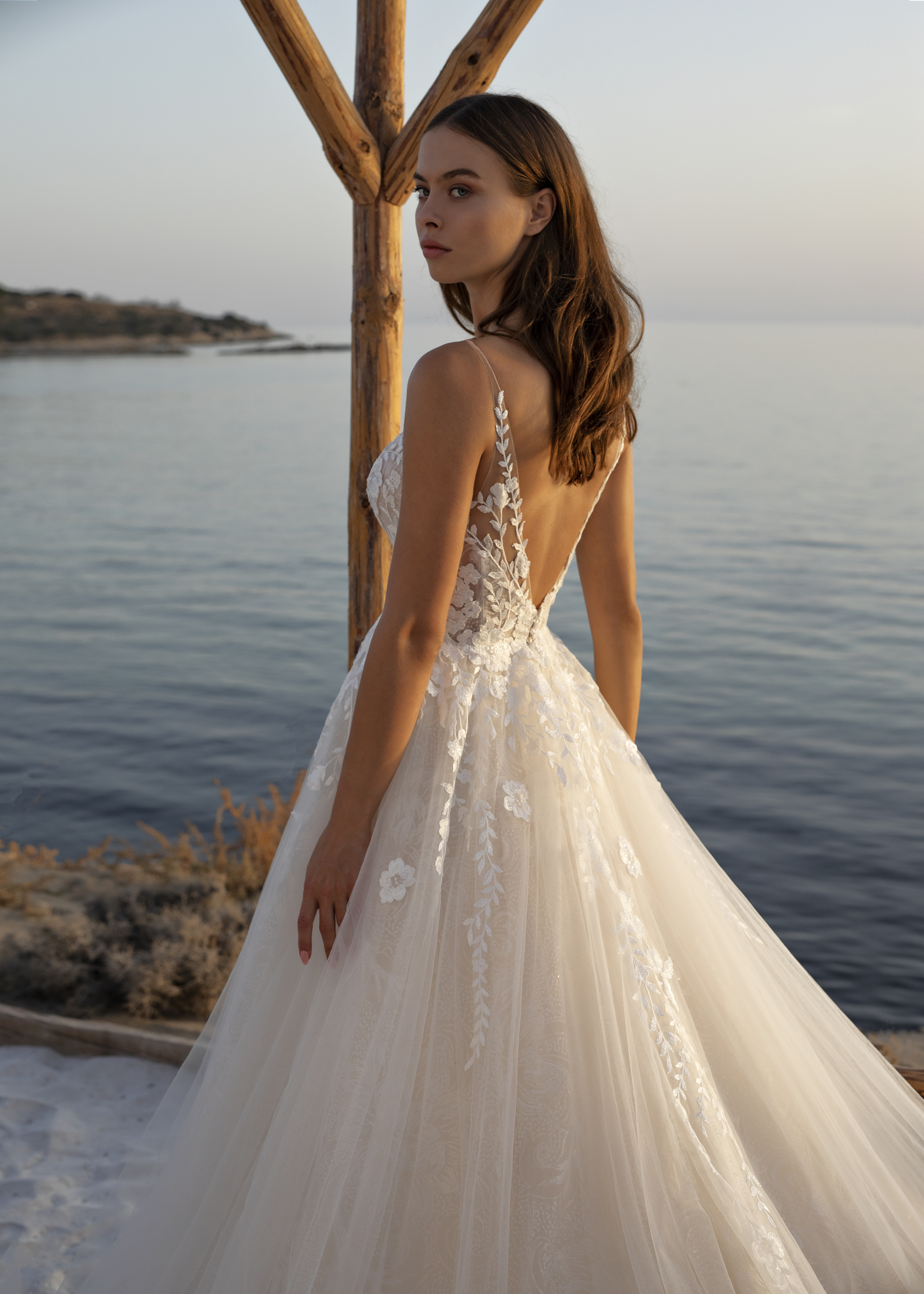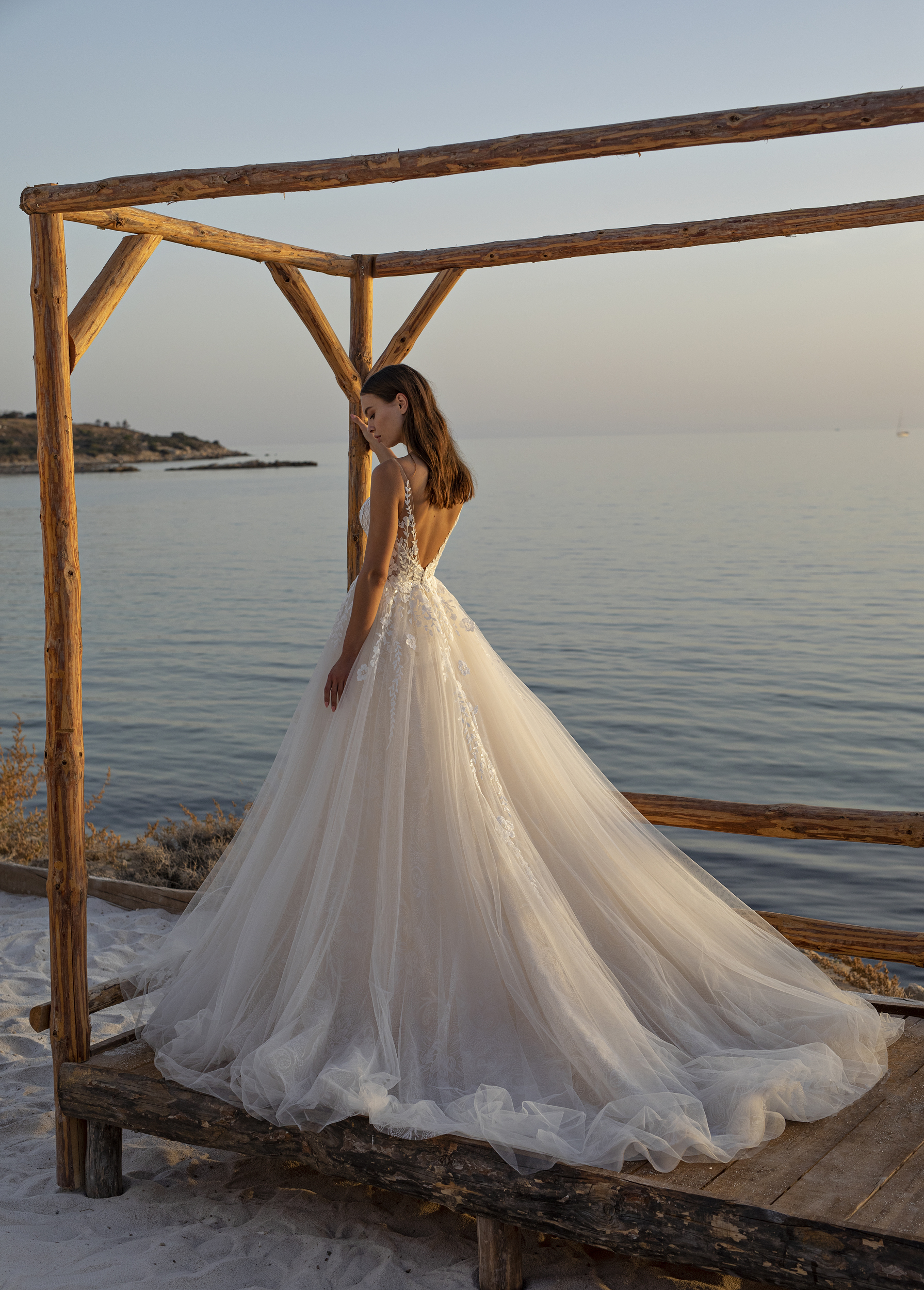 Das Brautkleid Oleander von Le Papillon ist eine besonders glamouröse Prinzessinnenrobe mit tiefem Ausschnitt und seitlichen Schlitzen. Diese ähnelt dem Modell Odetta, besitzt aber einen weiteren Rock. Der gesamte Entwurf ist üppig mit Pailletten bestickt. Einerseits sind diese prominent auf der romantisch-floralen Spitze des transparenten Oberteils platziert, die wiederum im Tüllrock ausläuft. Andererseits schimmern sie in einem subtileren Muster durch die oberste Lage des Rocks. Eine kurze Knopfleiste verbindet den tiefen Rückenausschnitt optisch mit dem Rockansatz. Die vielen Rockschichten erzeugen Volumen, auch in der abschließenden Kapellenschleppe.