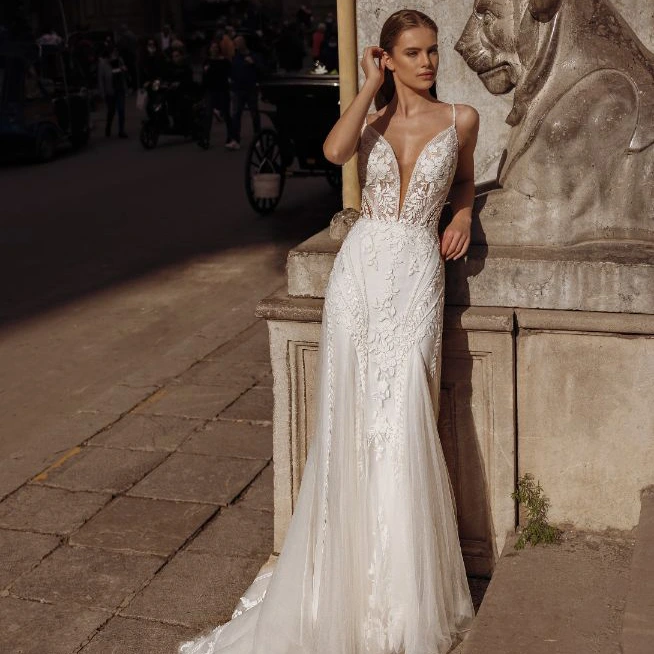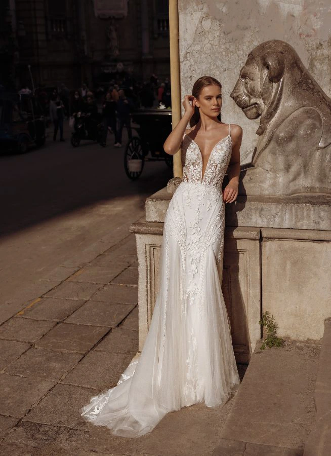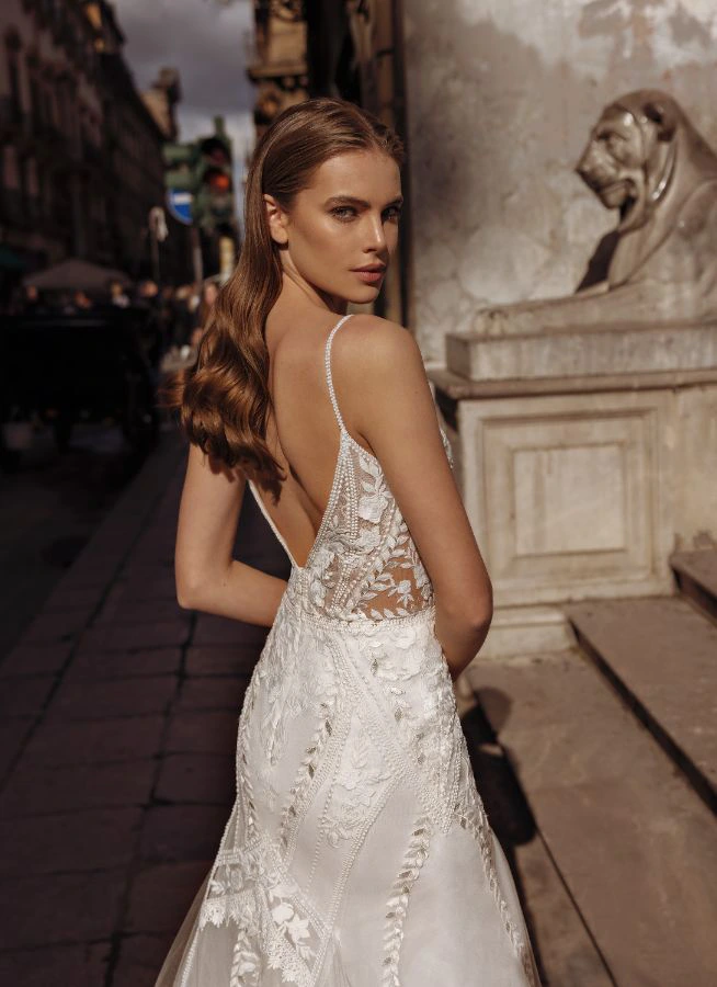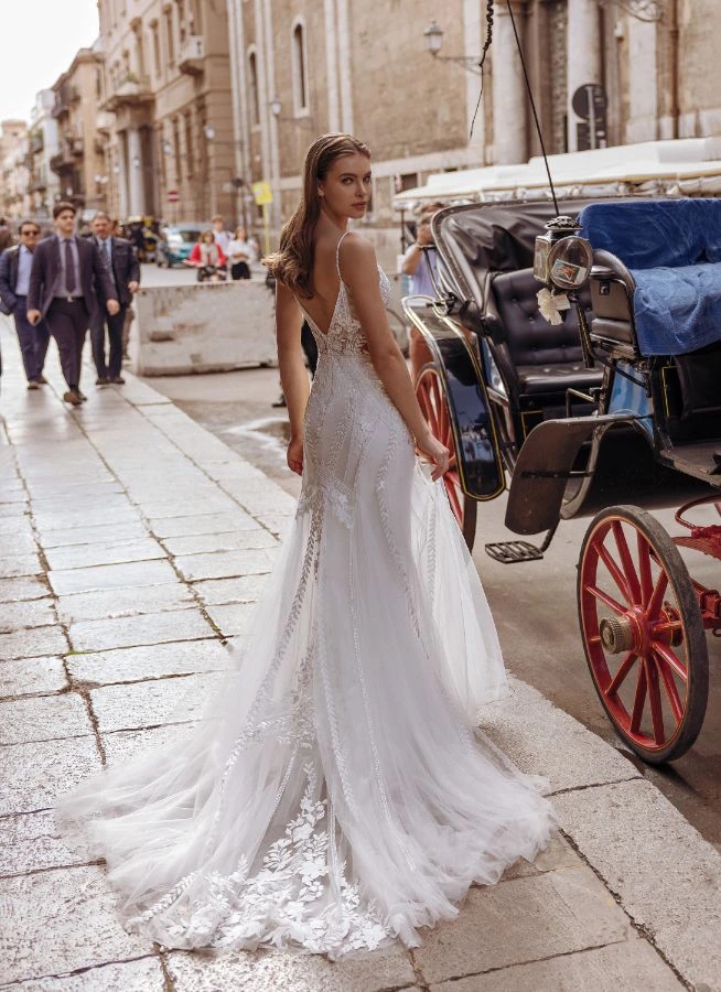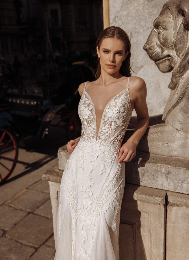 Das Brautkleid Summer von Le Papillon macht seinem Namen mit transparenter Spitze und Tüll alle Ehre. Das Spitzenmuster erzeugt einen Vintage-Look, ebenso die tief ansetzenden Godetfalten des Rocks. Das Modell besitzt tiefe Ausschnitte, fein gearbeitete Zierborten und schmale Träger. Das Spitzenmuster setzt sich vom Oberteil ausgehend auf dem gefütterten Rock fort und akzentuiert auf romantische Weise die Schleppe.