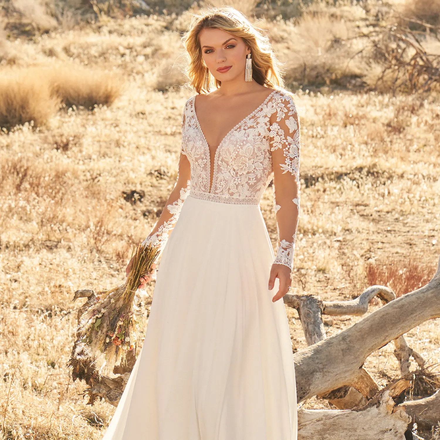 Das Brautkleid 66263 von Lillian West verbindet eine klassische Silhouette mit romantischer Spitze, die das Oberteil mitsamt Ärmeln sowie den Schleppensaum bedeckt. An den transparenten Ärmeln kommt das florale Muster besonders zur Geltung. Die Ausschnitte sind von schmalen Zierborten gerahmt. Hinzu kommt ein Taillenband aus Häkelspitze, das den fließenden Chiffonrock vom Top trennt.