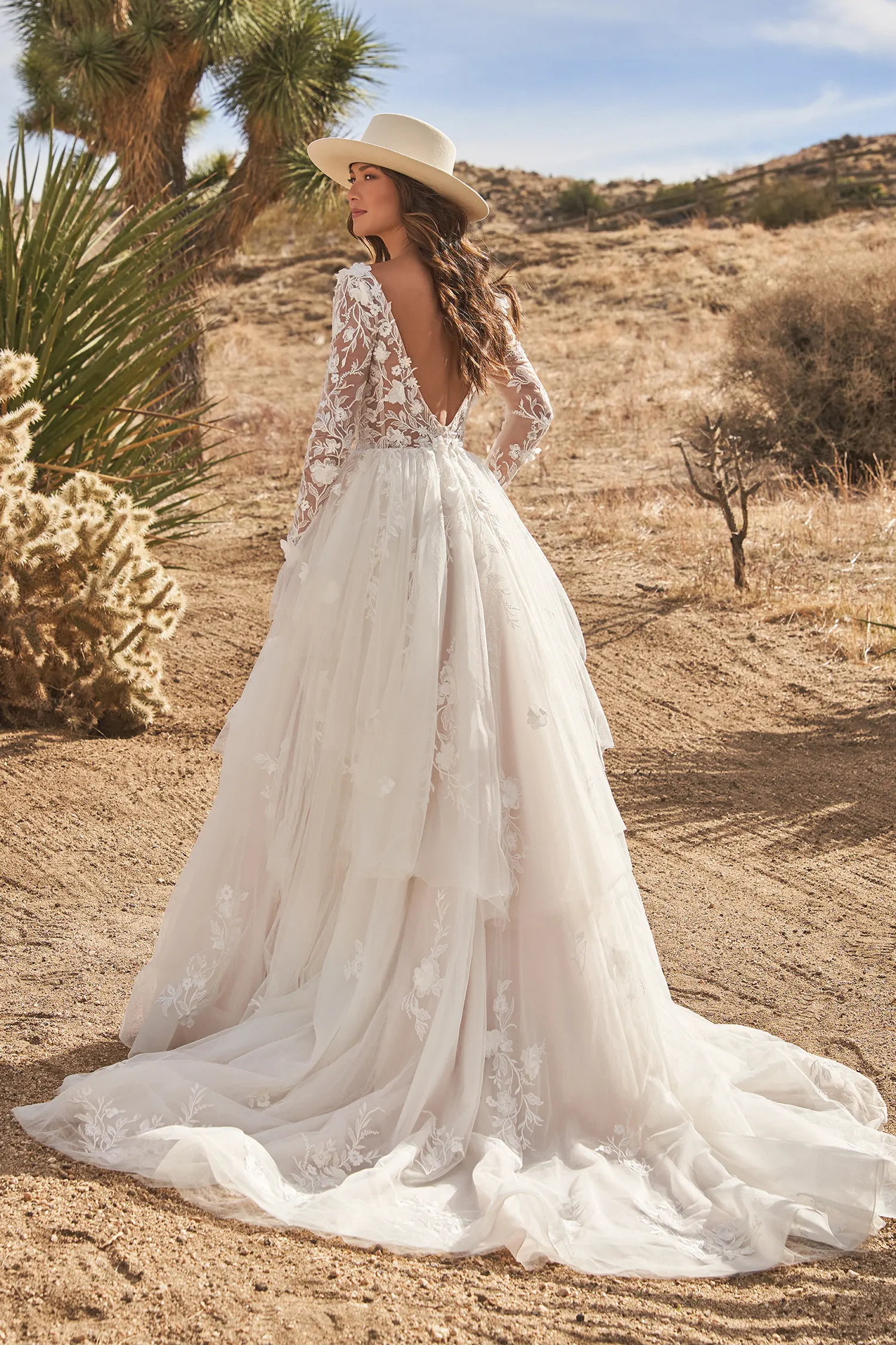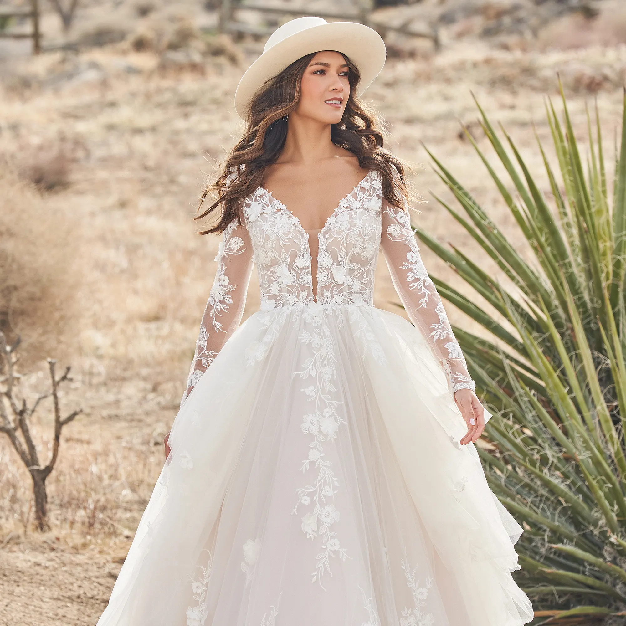 Das Modell 66269 von Lillian West ist ein märchenhaftes Boho-Brautkleid mit 3D-Spitzenapplikationen. Besonders schön kommen diese an den transparenten Ärmeln sowie entlang der Ausschnitte zur Geltung. Das Oberteil besitzt sichtbar eingearbeitete Stäbchen, die einen modernen Look verleihen. Ab der Taille weiten sich die vielen geschichteten und abgestuften Lagen Tüll zu einem voluminösen Rock, der in einer abgerundeten Schleppe endet.