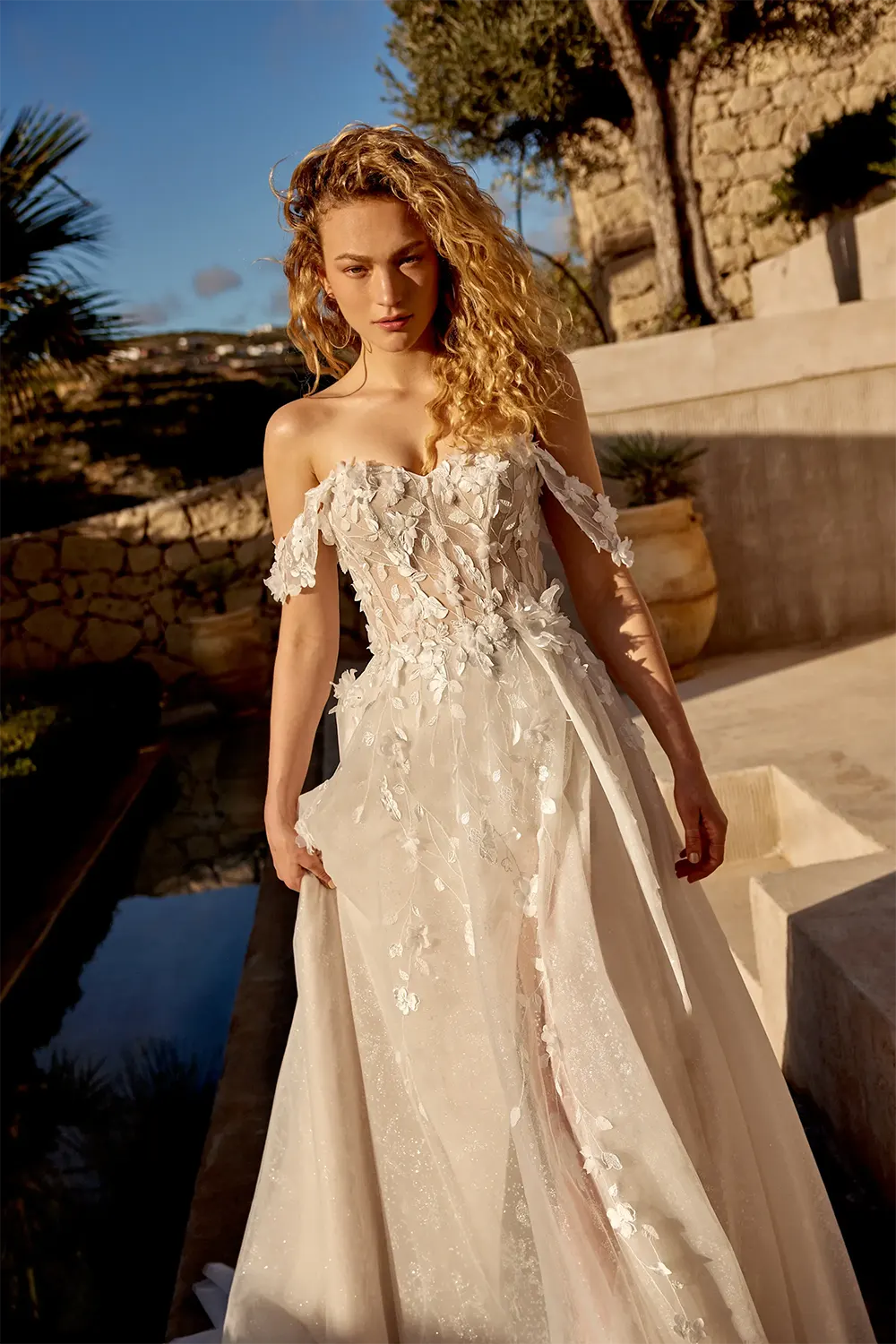 Das Brautkleid 66370 von Lillian West ist ein florales A-Linien Brautkleid mit Off-Shoulder Trägern und Glitzertüll.