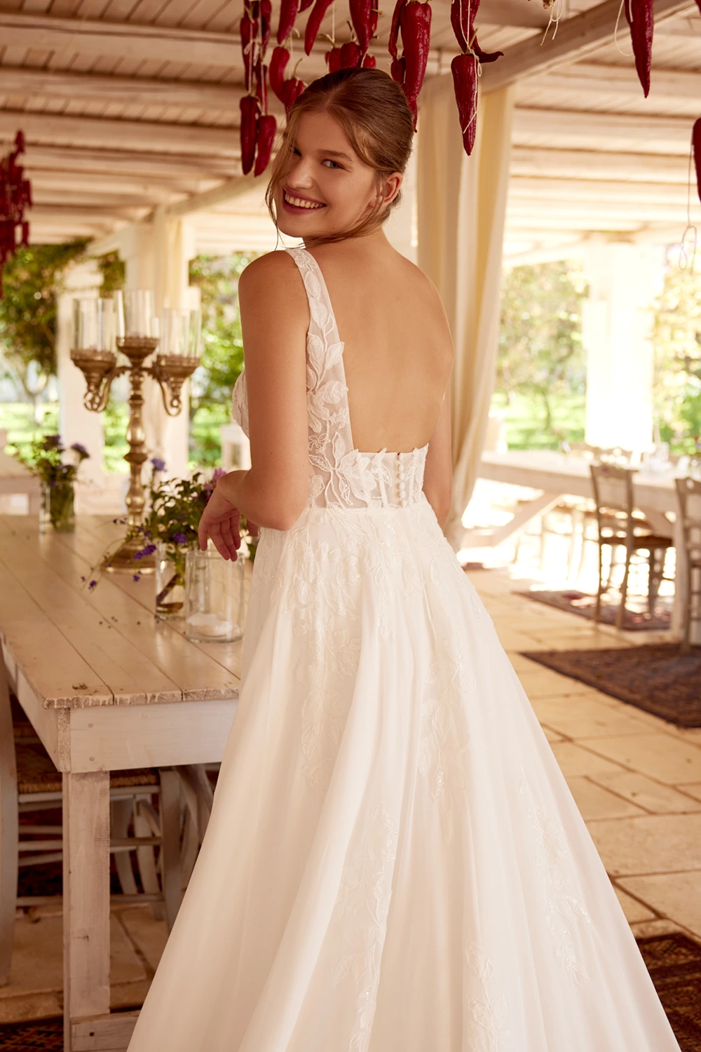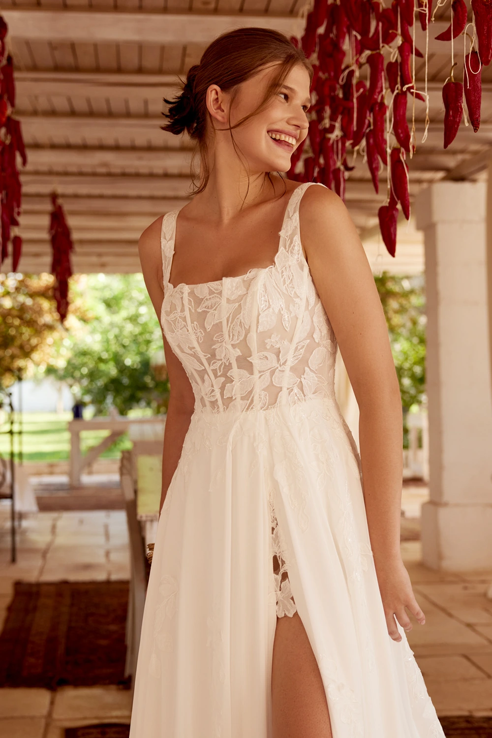 Das Modell 66396 von Lillian West ist ein luftiges Brautkleid in A-Linie aus Chiffon mit quadratischem Ausschnitt.