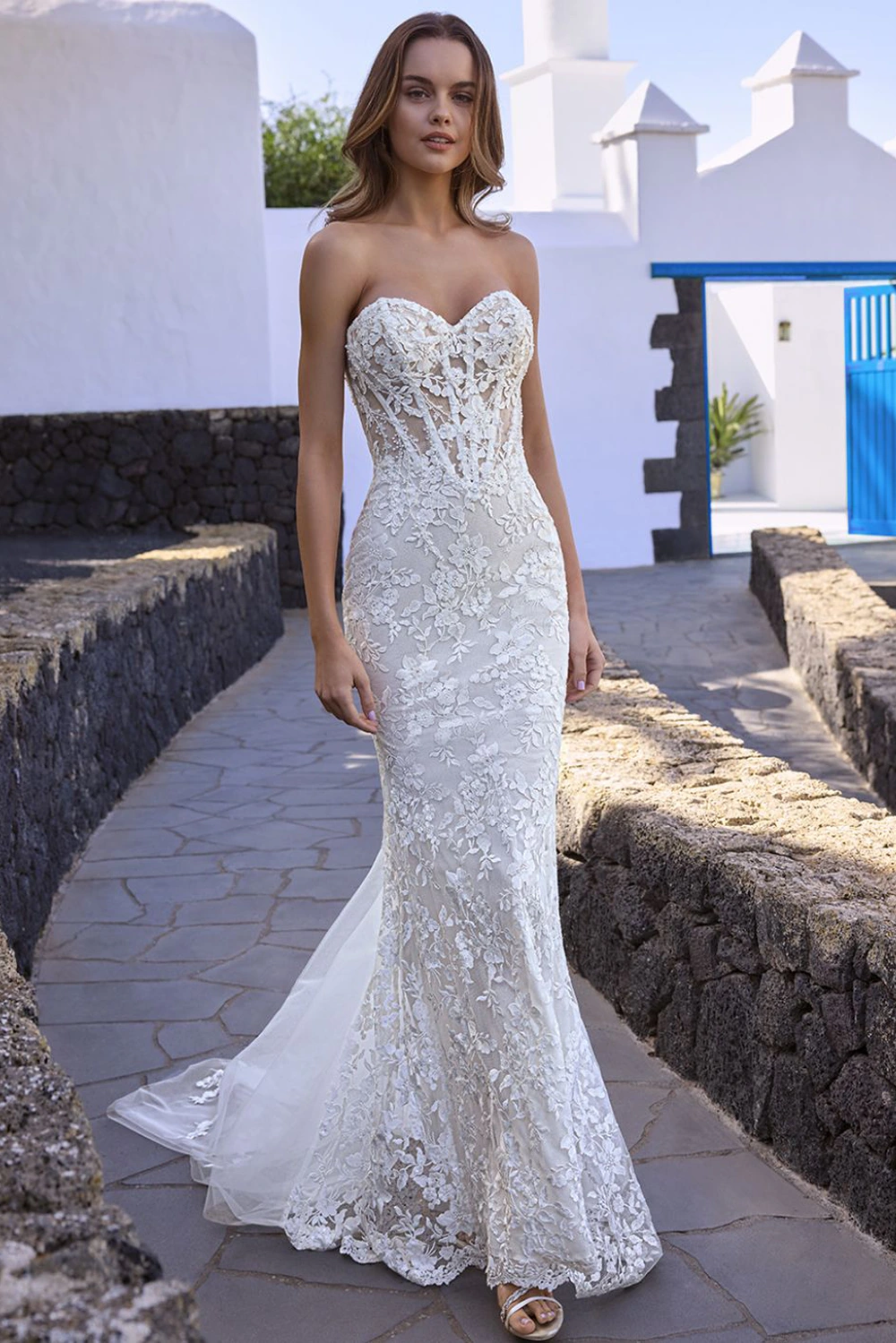 Das Modell Estrella von Enzoani Love ist ein sexy Meerjungfrauenkleid komplett aus Spitze und einer tollen, leicht transparenten Corsage.