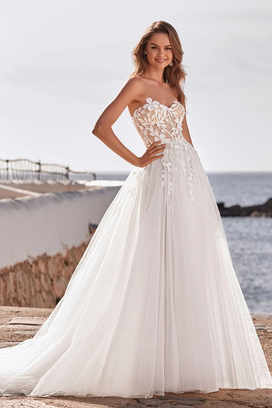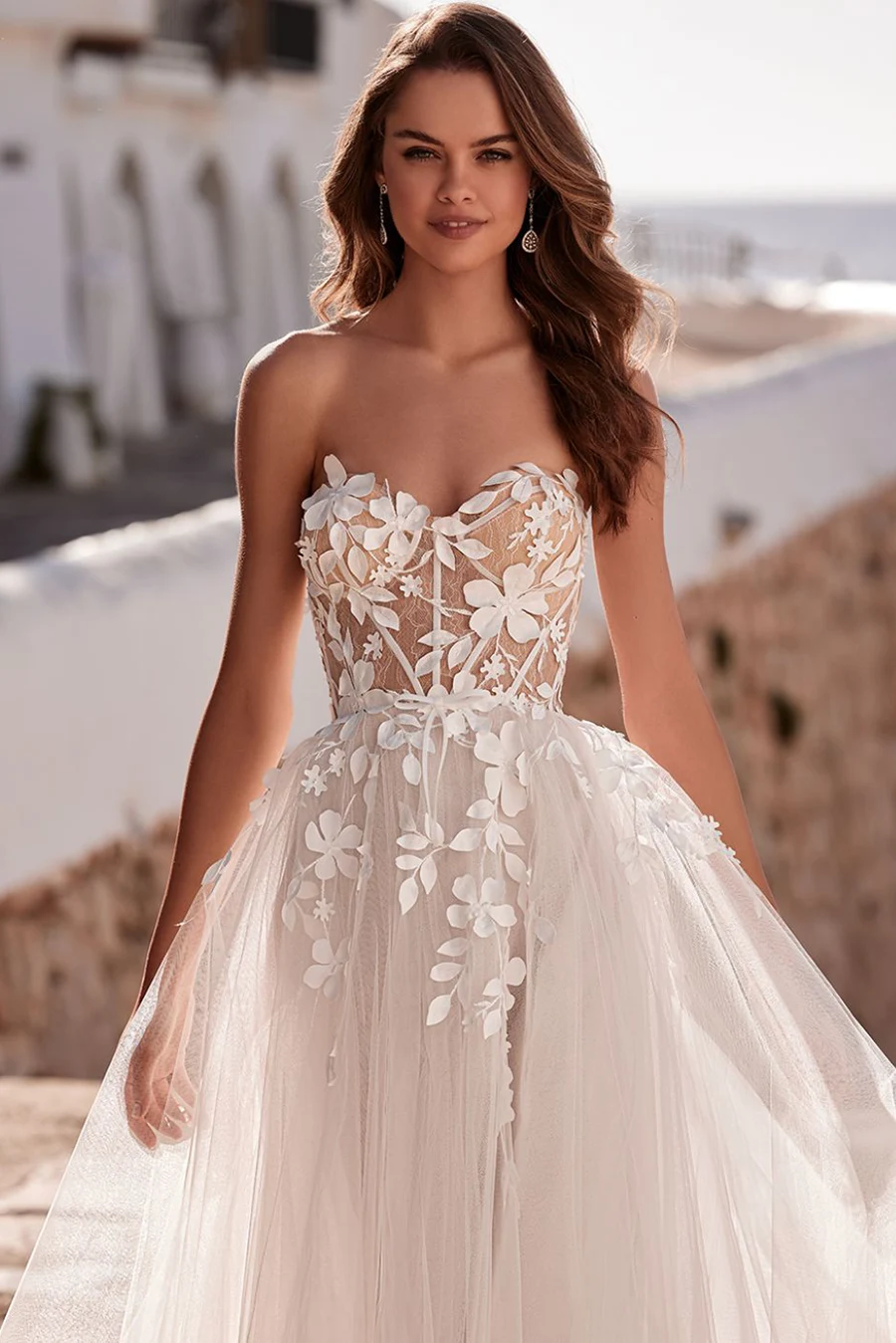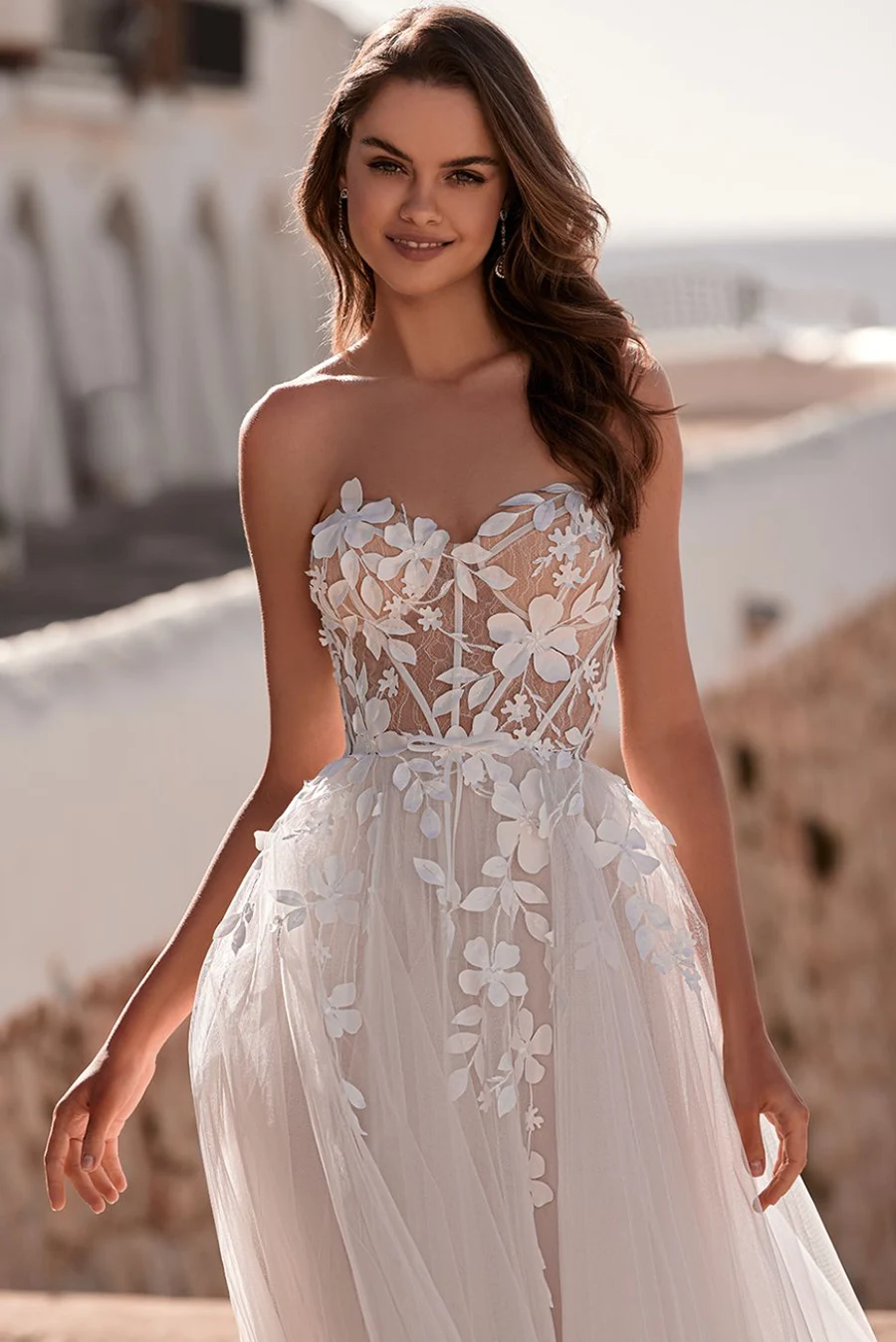 Das Brautkleid Dream von Love by Enzoani ist eine ausladende, trägerlose A-Linie mit hohem Beinschlitz, sichtbaren Stäben im Oberteil und 3D Blüten.