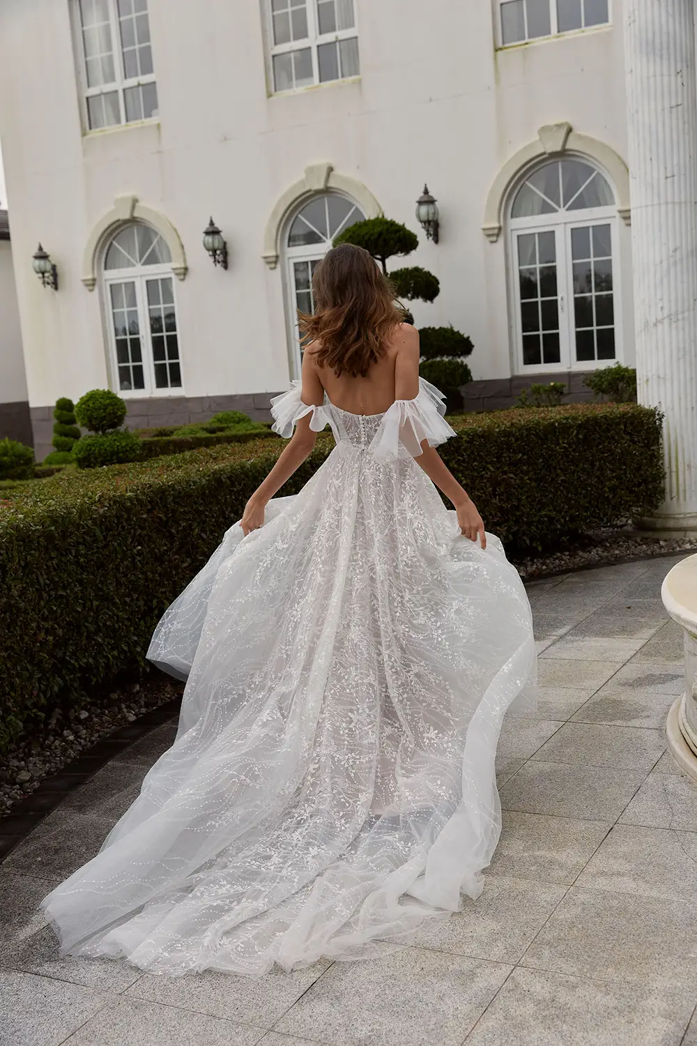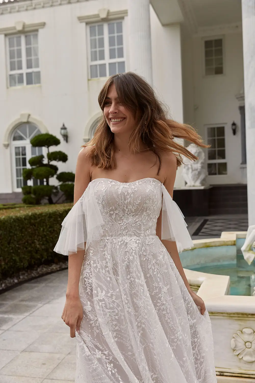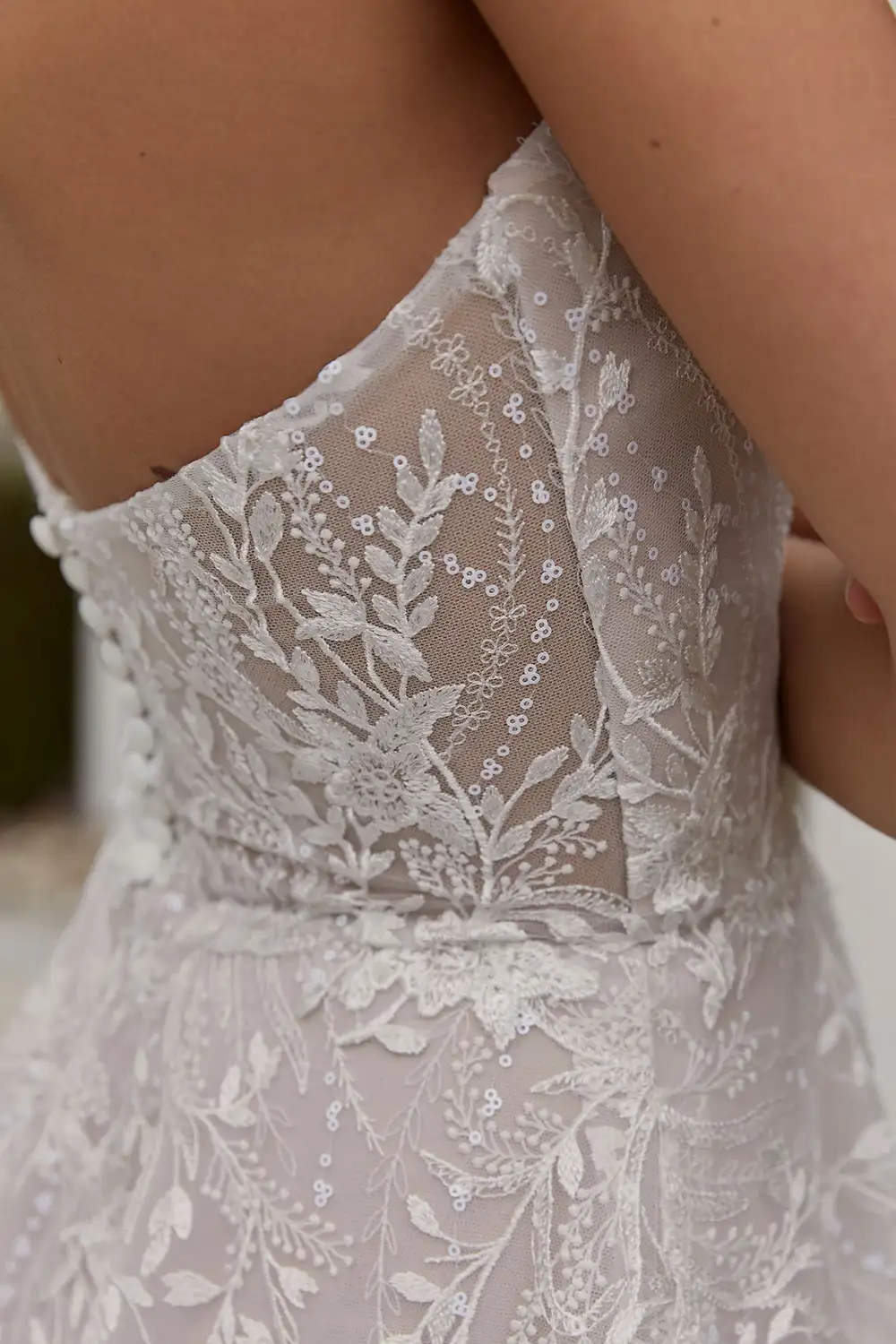 Madi Lanes Dayni ist ein Boho-Brautkleid mit modernen Details für Deine entspannte Hochzeit. Der mit Charmeuse in Hellbeige gefütterte Entwurf ist vollständig mit zarter floraler Spitze und ergänzenden weißen Pailletten bestickt. Seitliche Volant-Ärmel aus weichem Tüll verleihen dem Ausschnitt einen Carmen-Look und betonen dadurch die Schulterlinie. An der transparenten Rückenpartie befindet sich eine kurze Knopfleiste. Darunter schließt sich ein praktischer, verdeckter Reißverschluss an. Der mehrlagige Tüllrock ergießt sich auf dem Boden in eine oval geformte Schleppe.