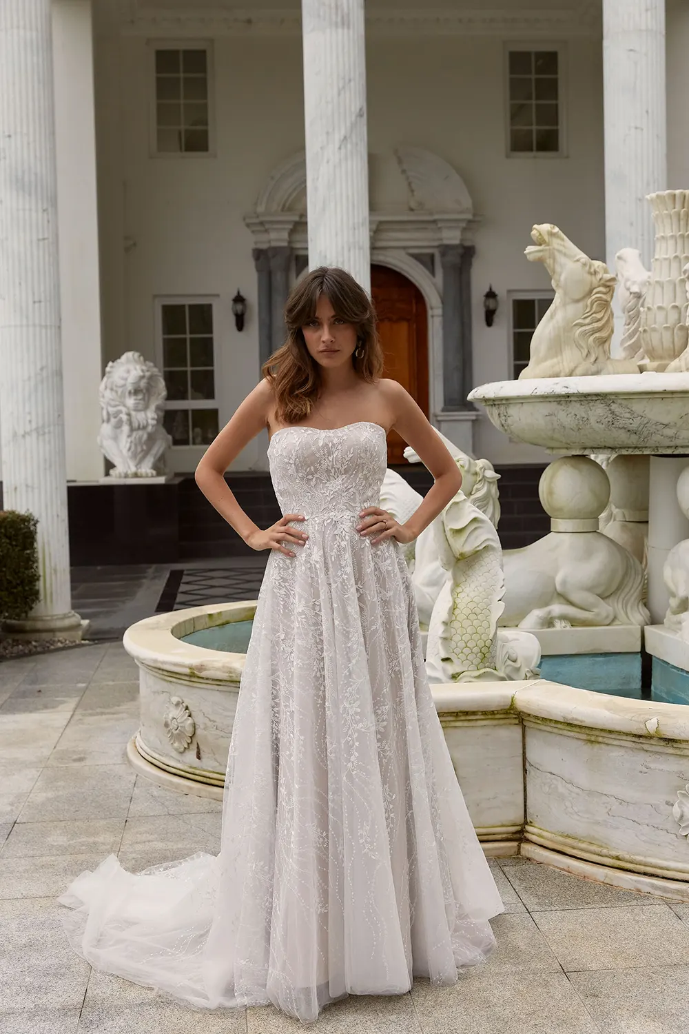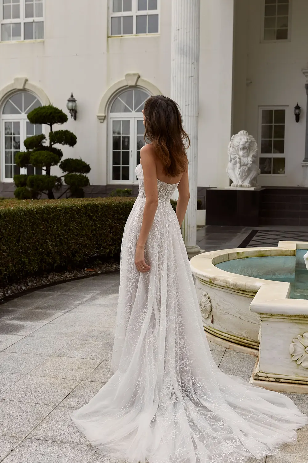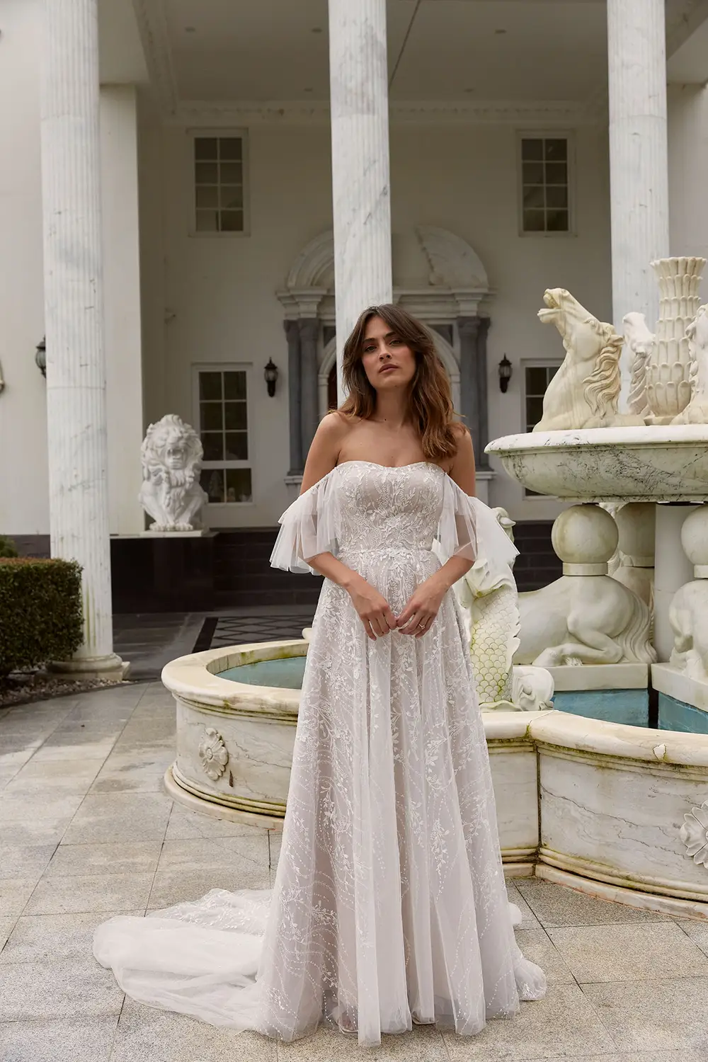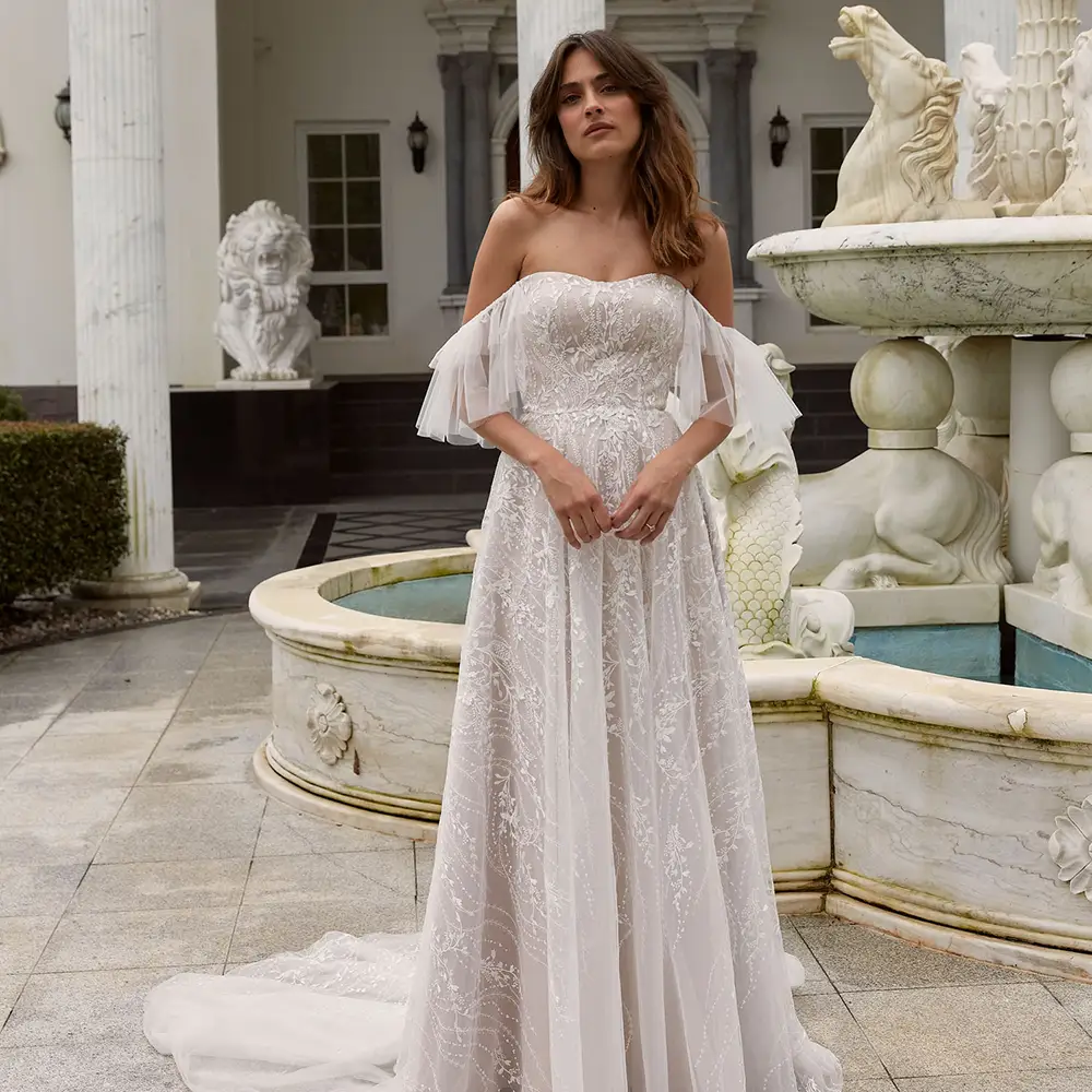 Madi Lanes Dayni ist ein Boho-Brautkleid mit modernen Details für Deine entspannte Hochzeit. Der mit Charmeuse in Hellbeige gefütterte Entwurf ist vollständig mit zarter floraler Spitze und ergänzenden weißen Pailletten bestickt. Seitliche Volant-Ärmel aus weichem Tüll verleihen dem Ausschnitt einen Carmen-Look und betonen dadurch die Schulterlinie. An der transparenten Rückenpartie befindet sich eine kurze Knopfleiste. Darunter schließt sich ein praktischer, verdeckter Reißverschluss an. Der mehrlagige Tüllrock ergießt sich auf dem Boden in eine oval geformte Schleppe.